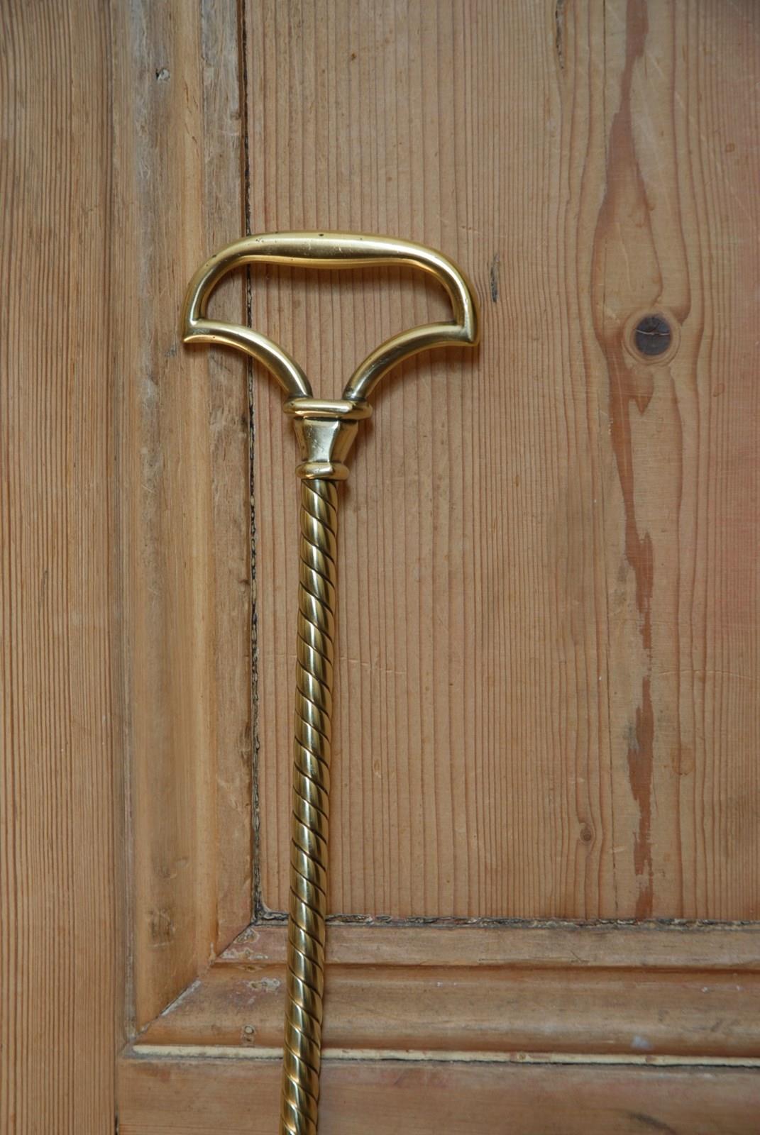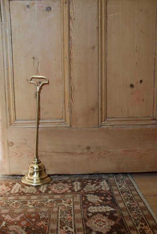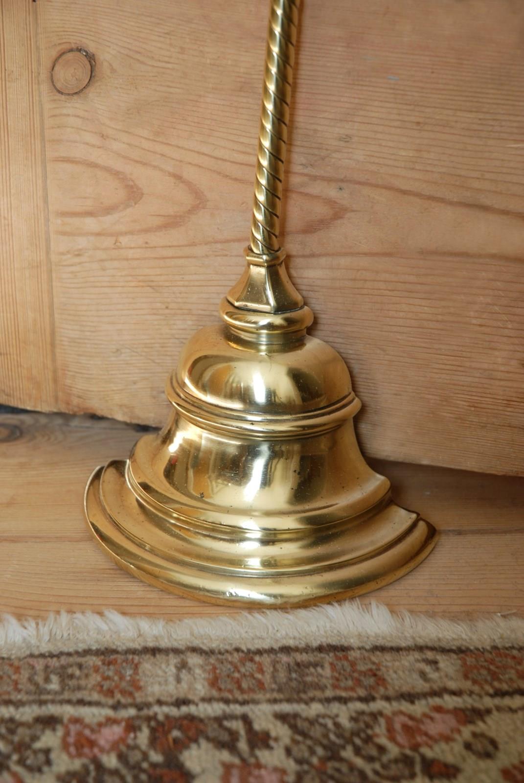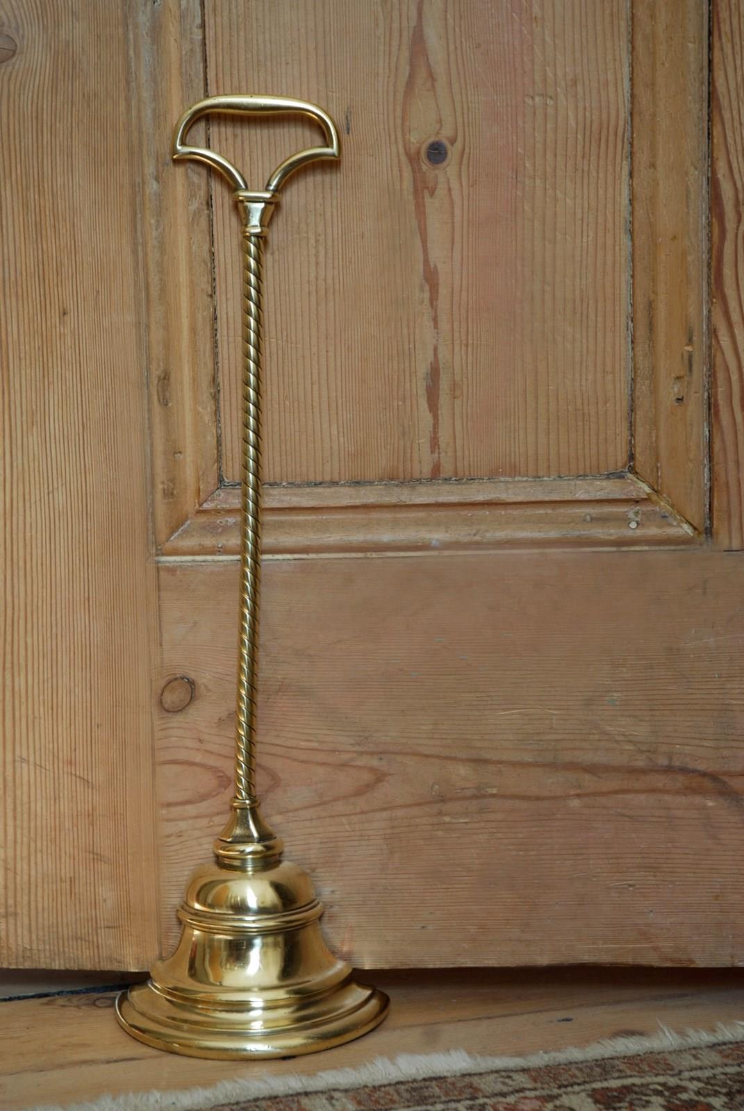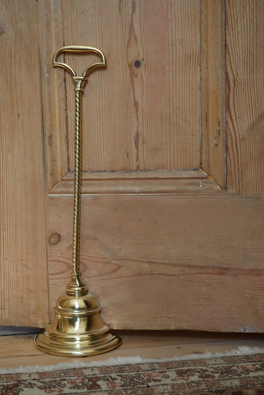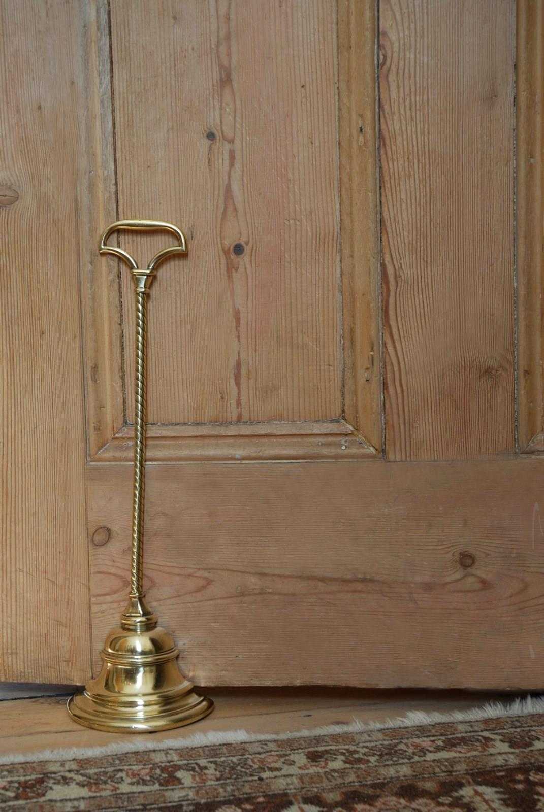 Description: An original, quality English antique doorstop/porter. This fine example is in polished brass and was manufactured in the 19th Century by William Tonks & Sons, who supplied brassware to Liberty of London. The axe head shaped loop handle has a chamfered socle and the base comprises of a stepped bell shape, with a rounded bottom mould. At the back is the original cast iron loading which has the makers mark stamp WT&S. A great heavy weighted door stop, with a decorative long, elegant rope twist stem.