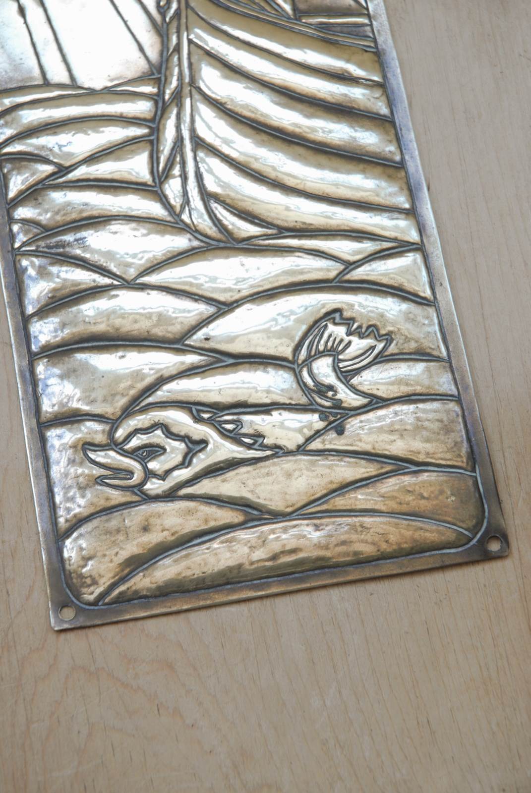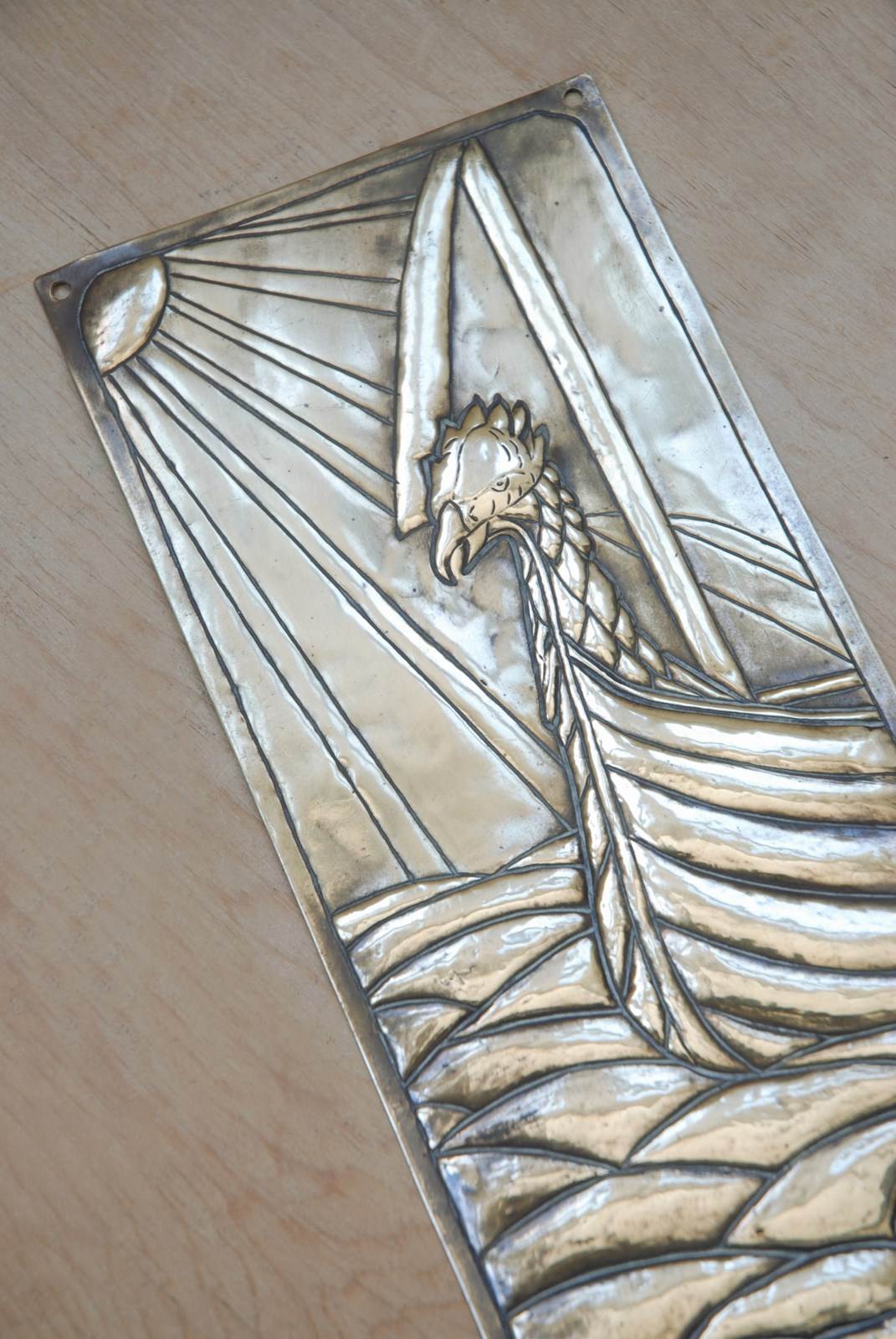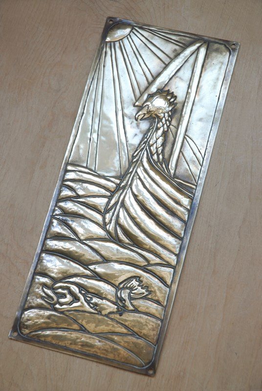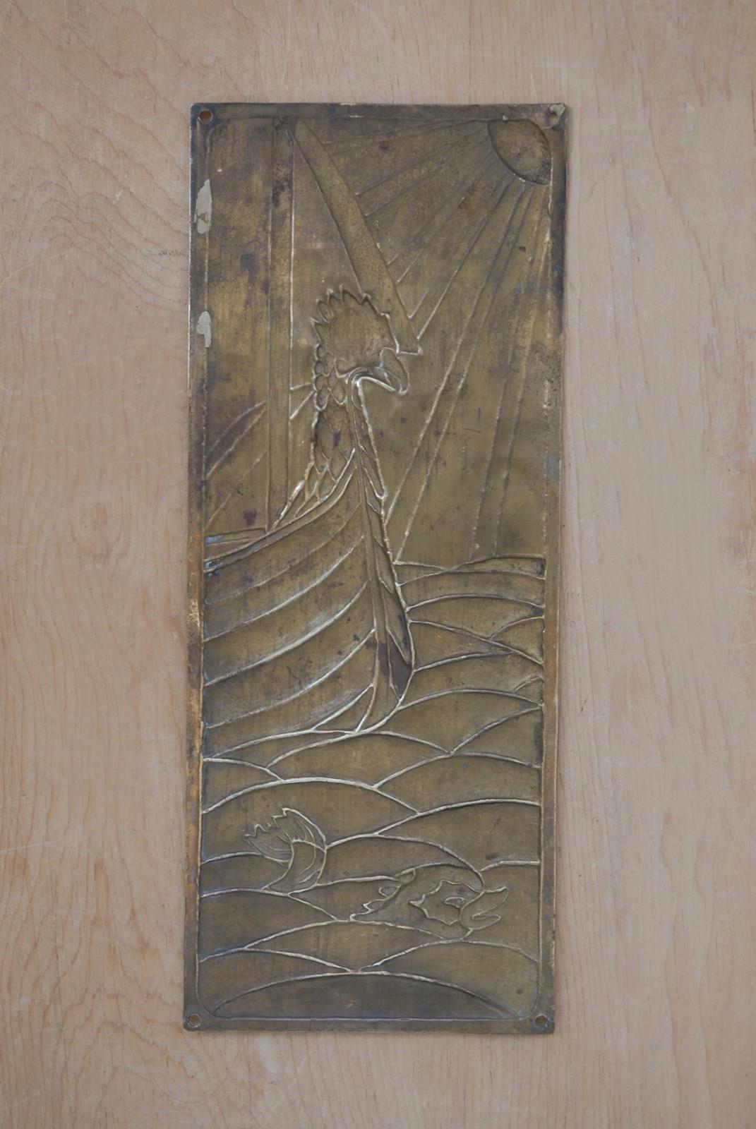 Description: Original single Victorian brass finger plate. In thick sheet brass with a stunning embossed nautical design of a Viking ship at sea. This example dates to the late 1800’s, the Victorian Aesthetic period.