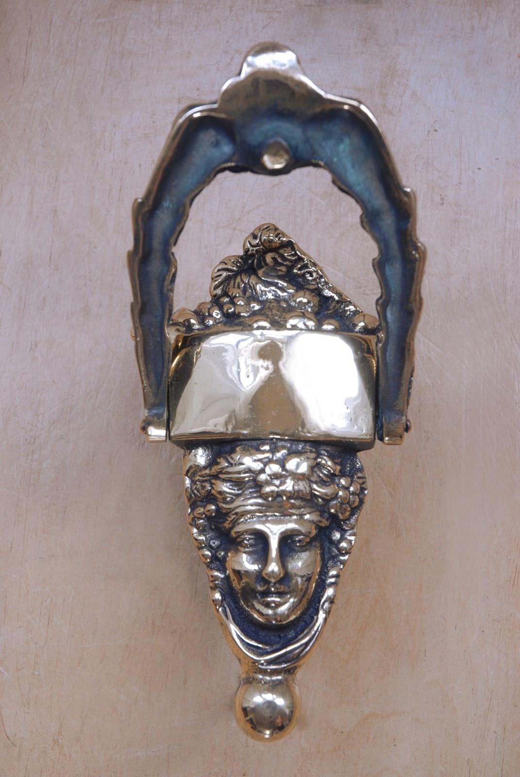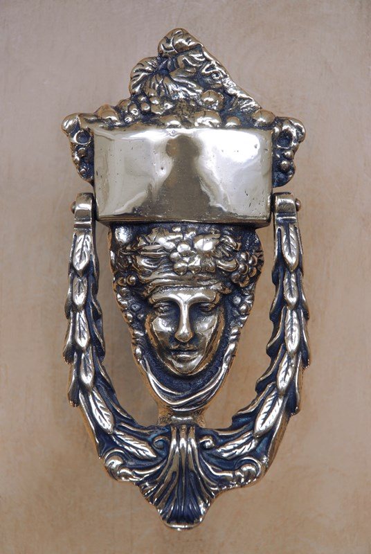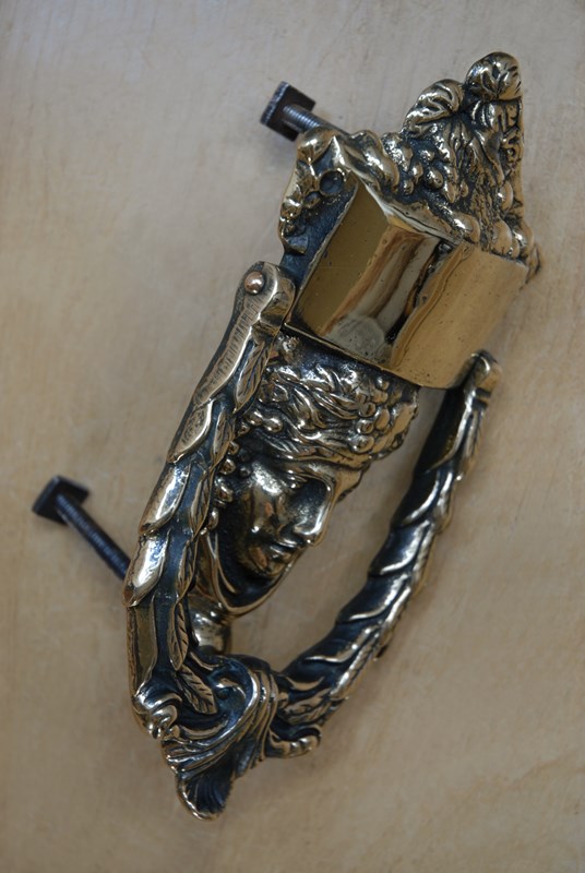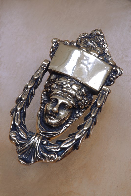 Description: An original quality Victorian door knocker. This classic Dionysus door knocker is cast in brass and takes the form of a Grecian face. Carefully polished by hand.