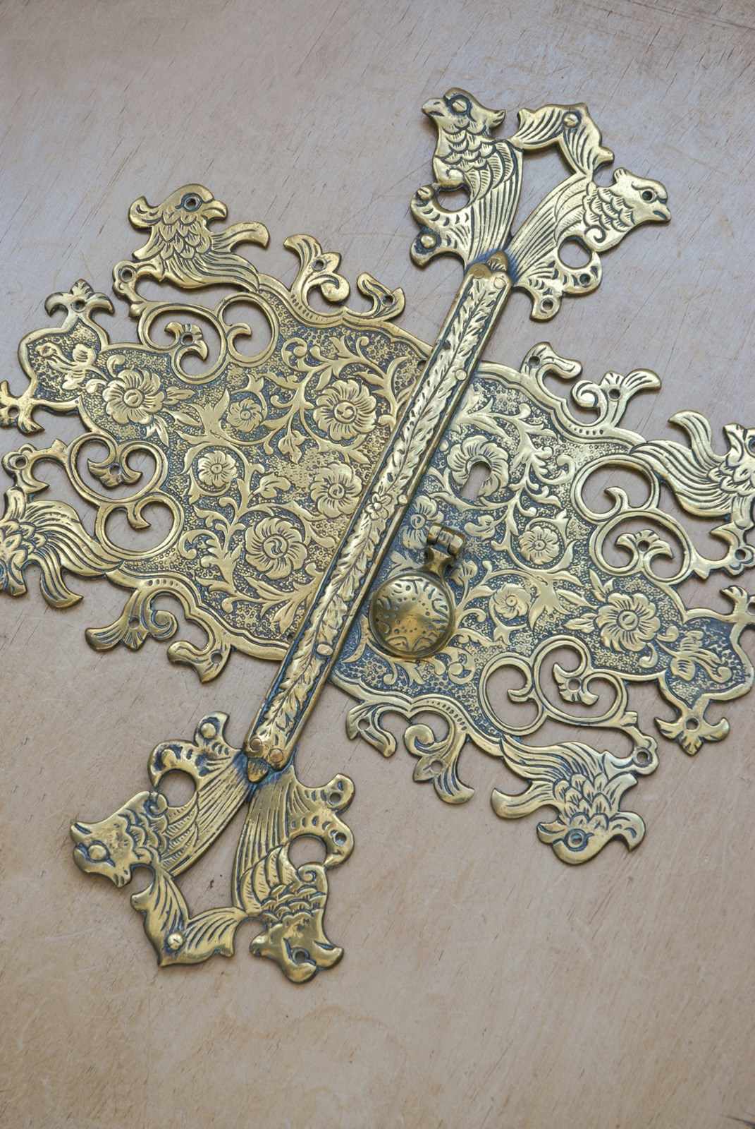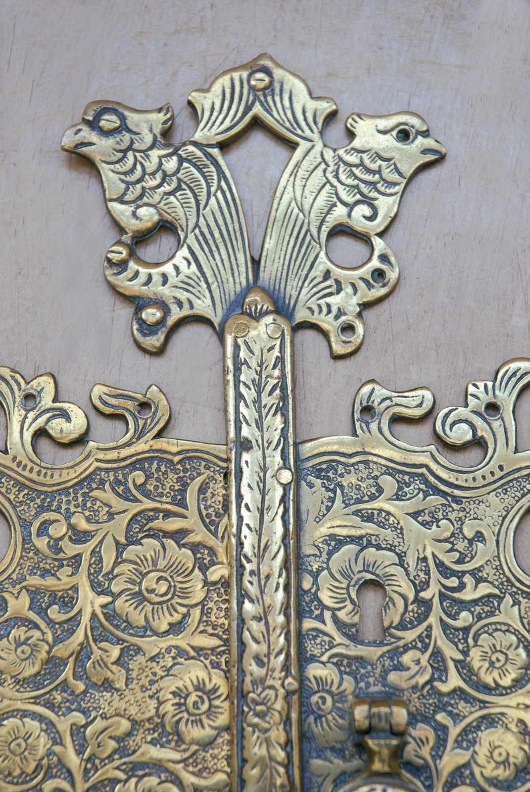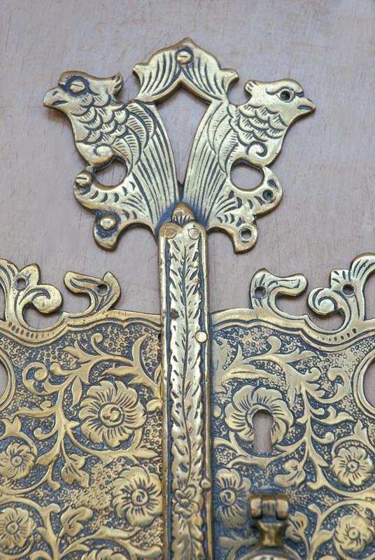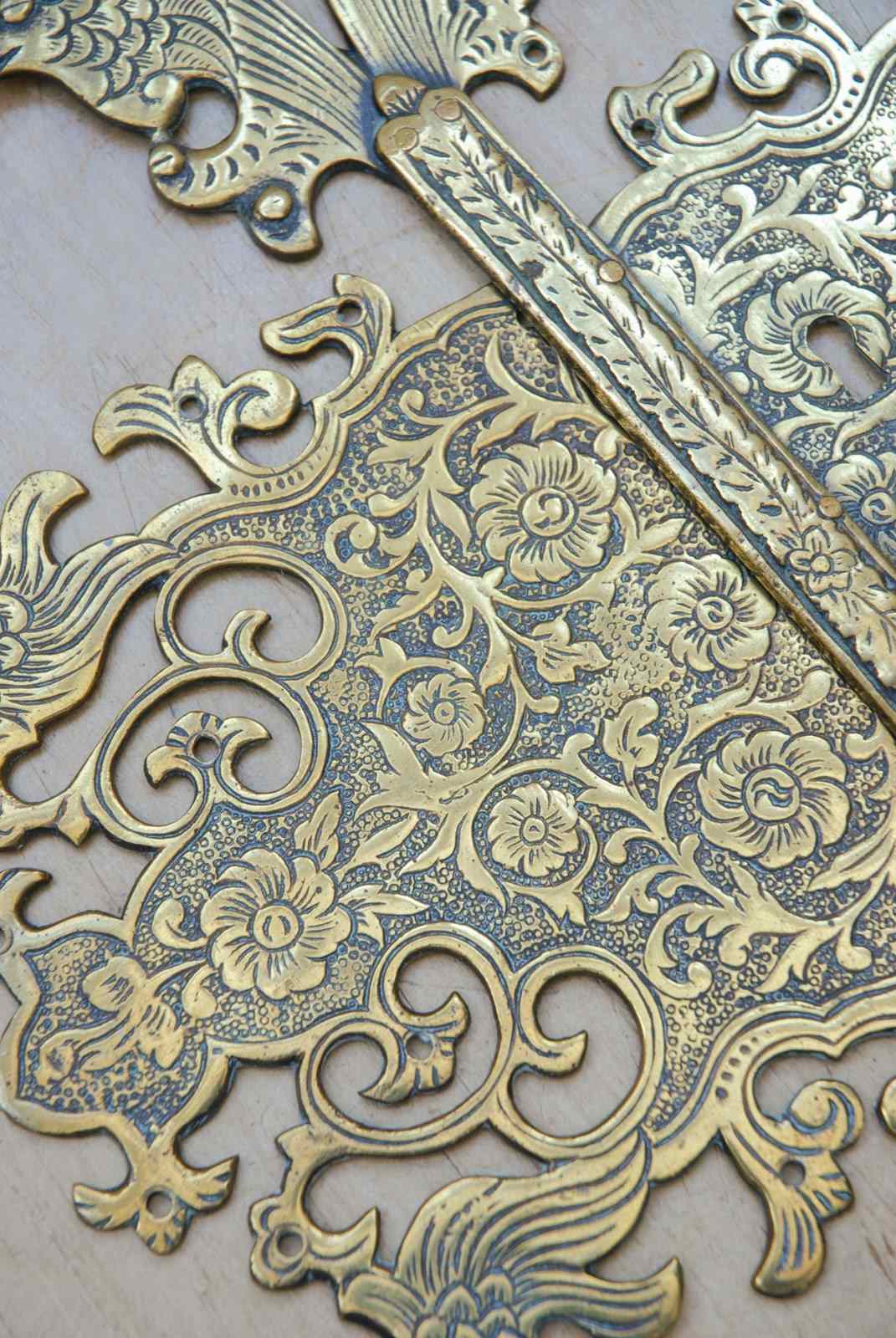 Description: Beautiful quality large antique cabinet door plate. The brass surface has a highly decorative chased surface pattern, which is carefully completed by hand. The screw holes are disguised as the birds eyes.