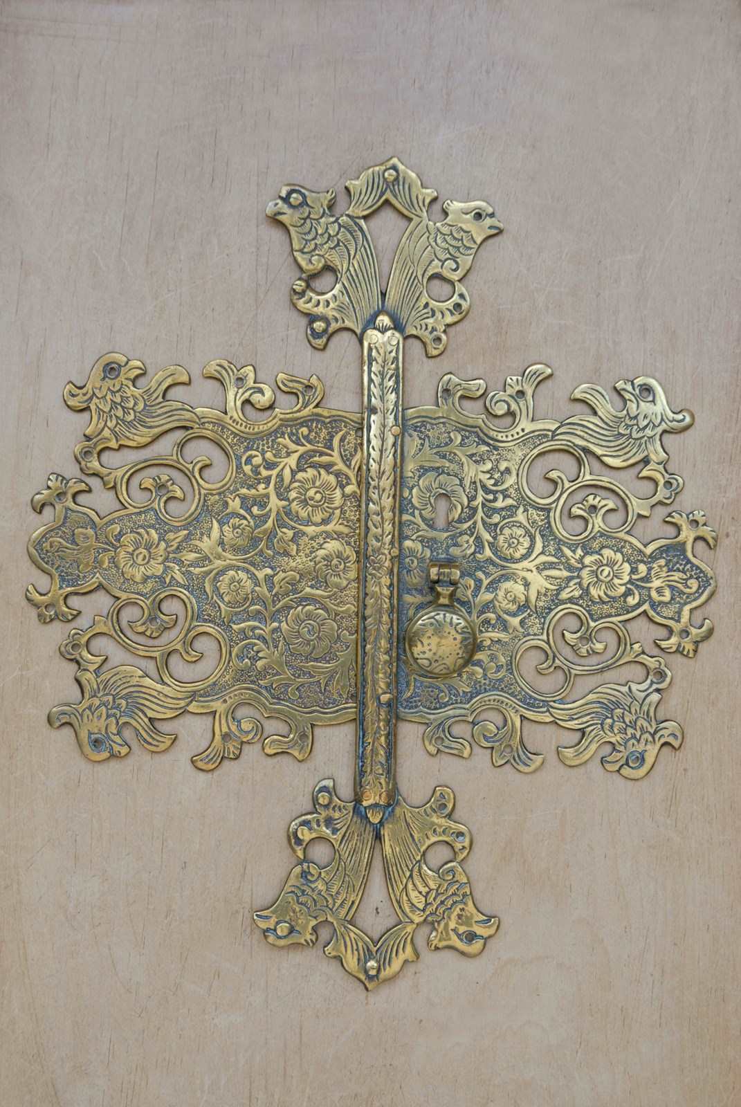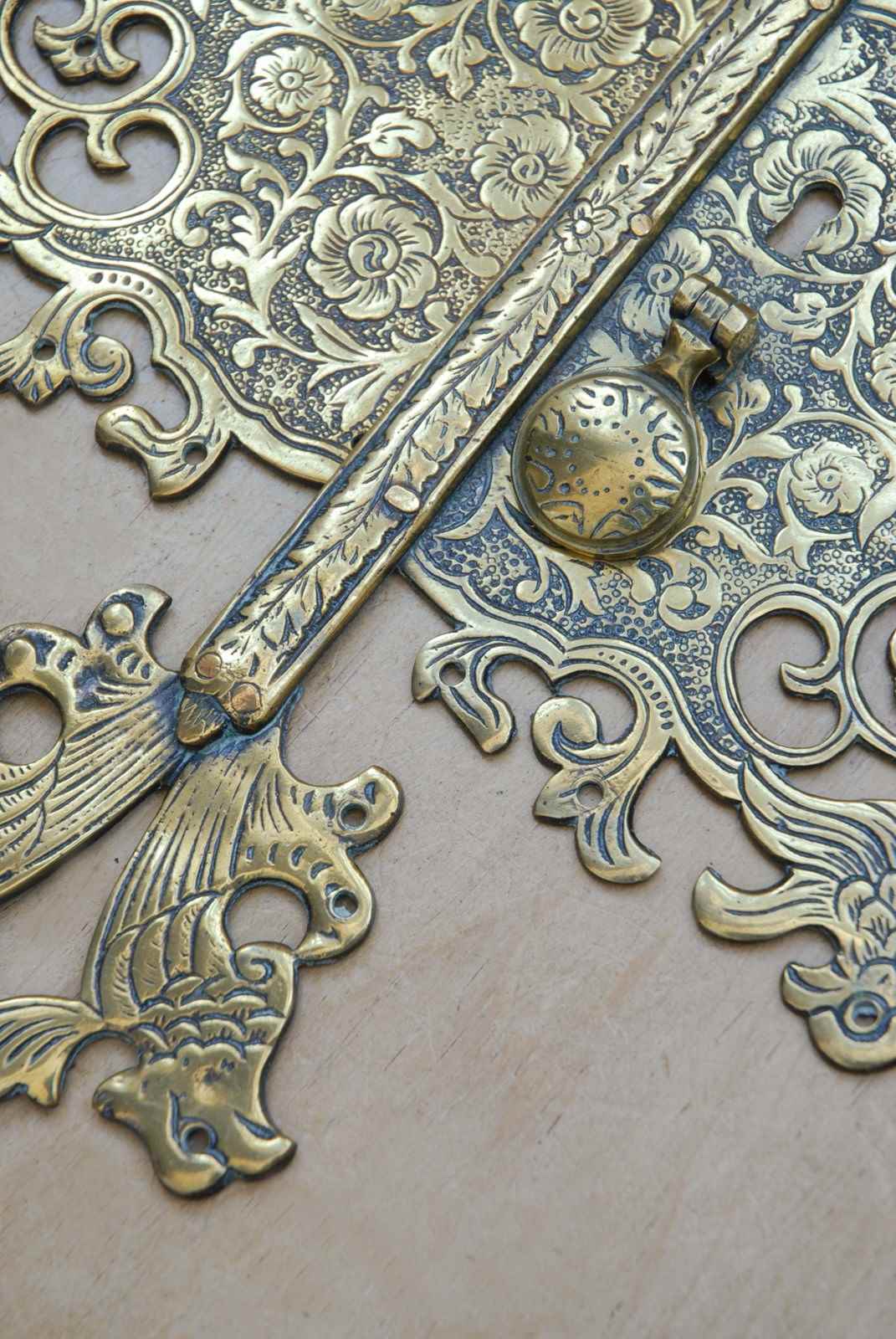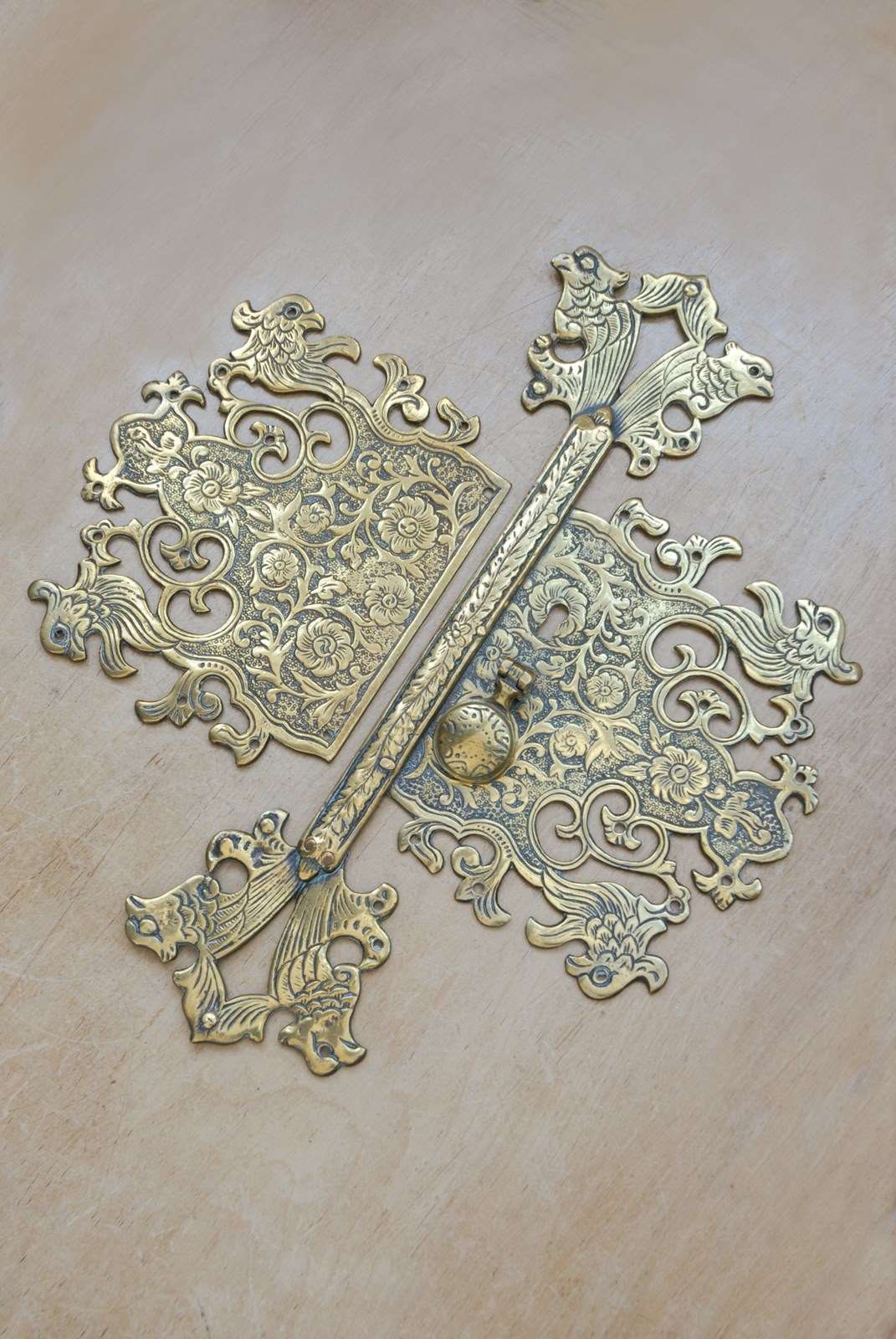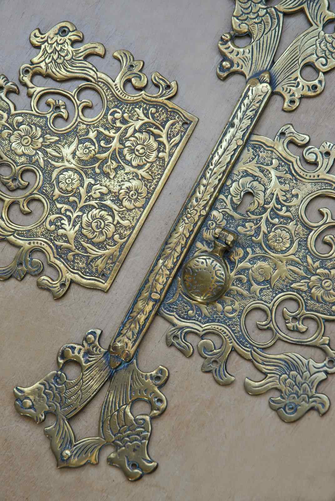 Description: Beautiful quality large antique cabinet door plate. The brass surface has a highly decorative chased surface pattern, which is carefully completed by hand. The screw holes are disguised as the birds eyes.