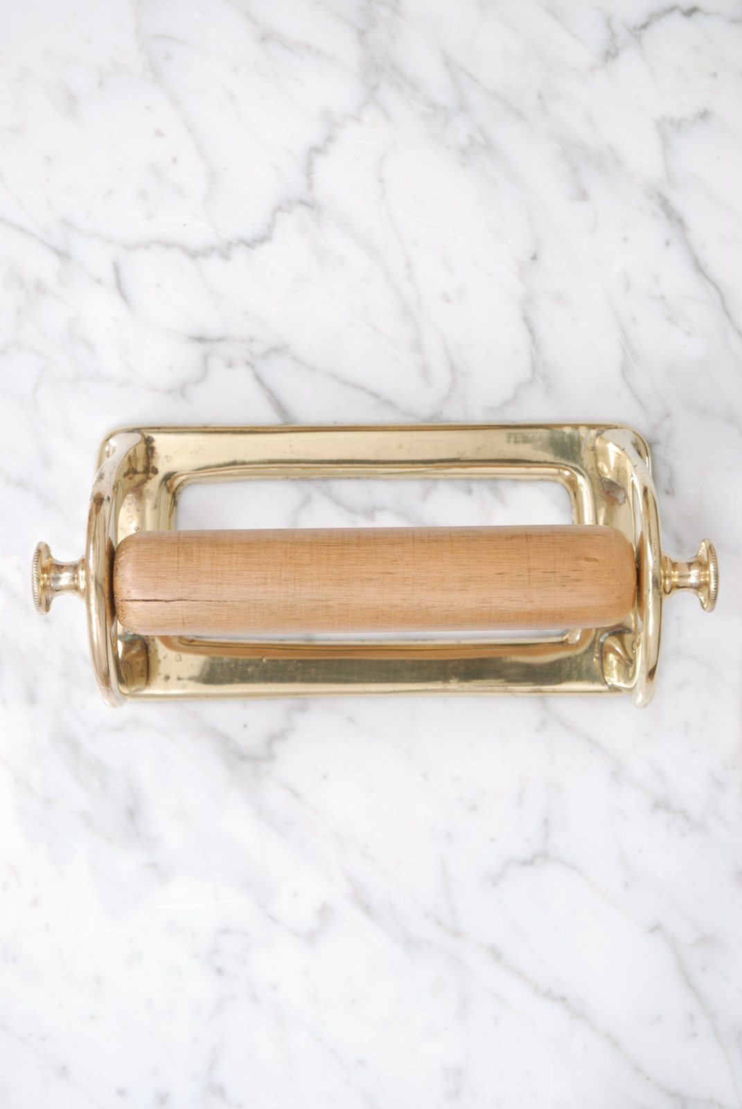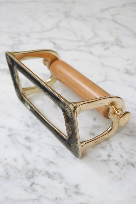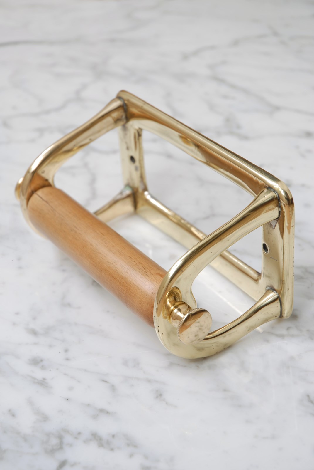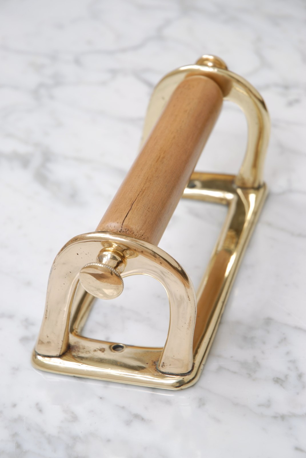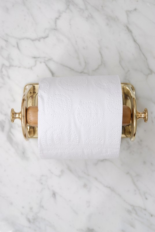 Description: Original antique Edwardian lavatory roll holder. Dating from the early 1900’s this example is made of cast brass with a wooden roller. There are two screw holes for wall mounting. Perfect for a standard sized lavatory roll.