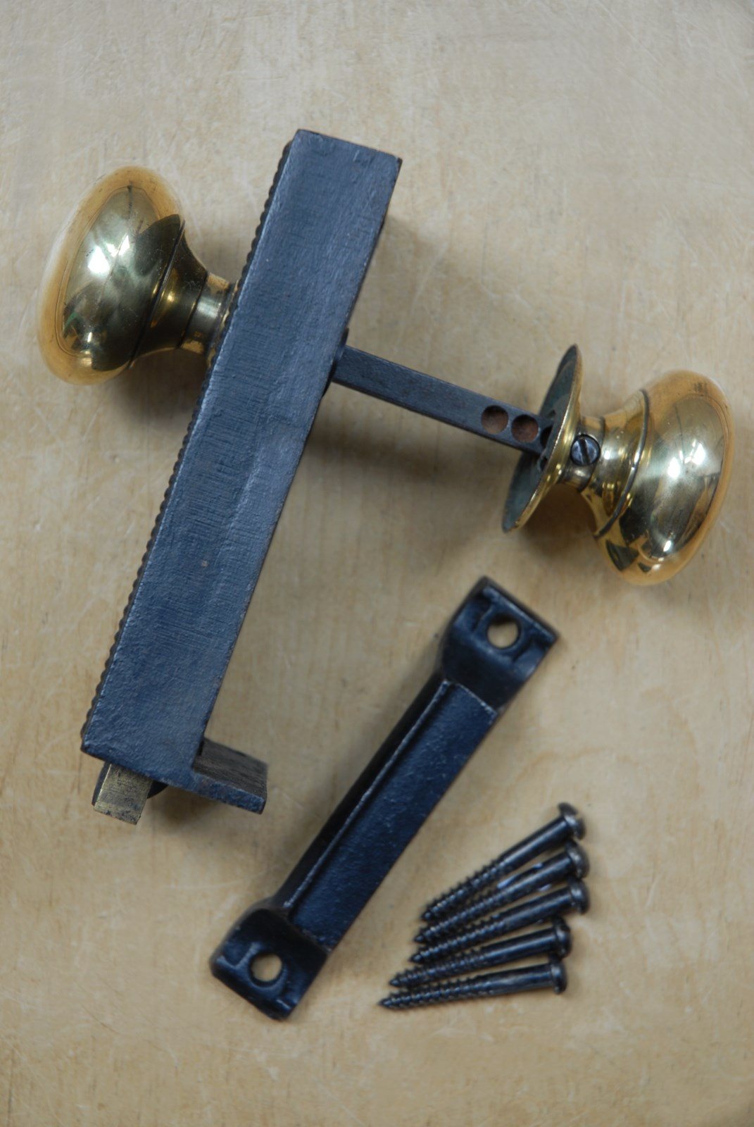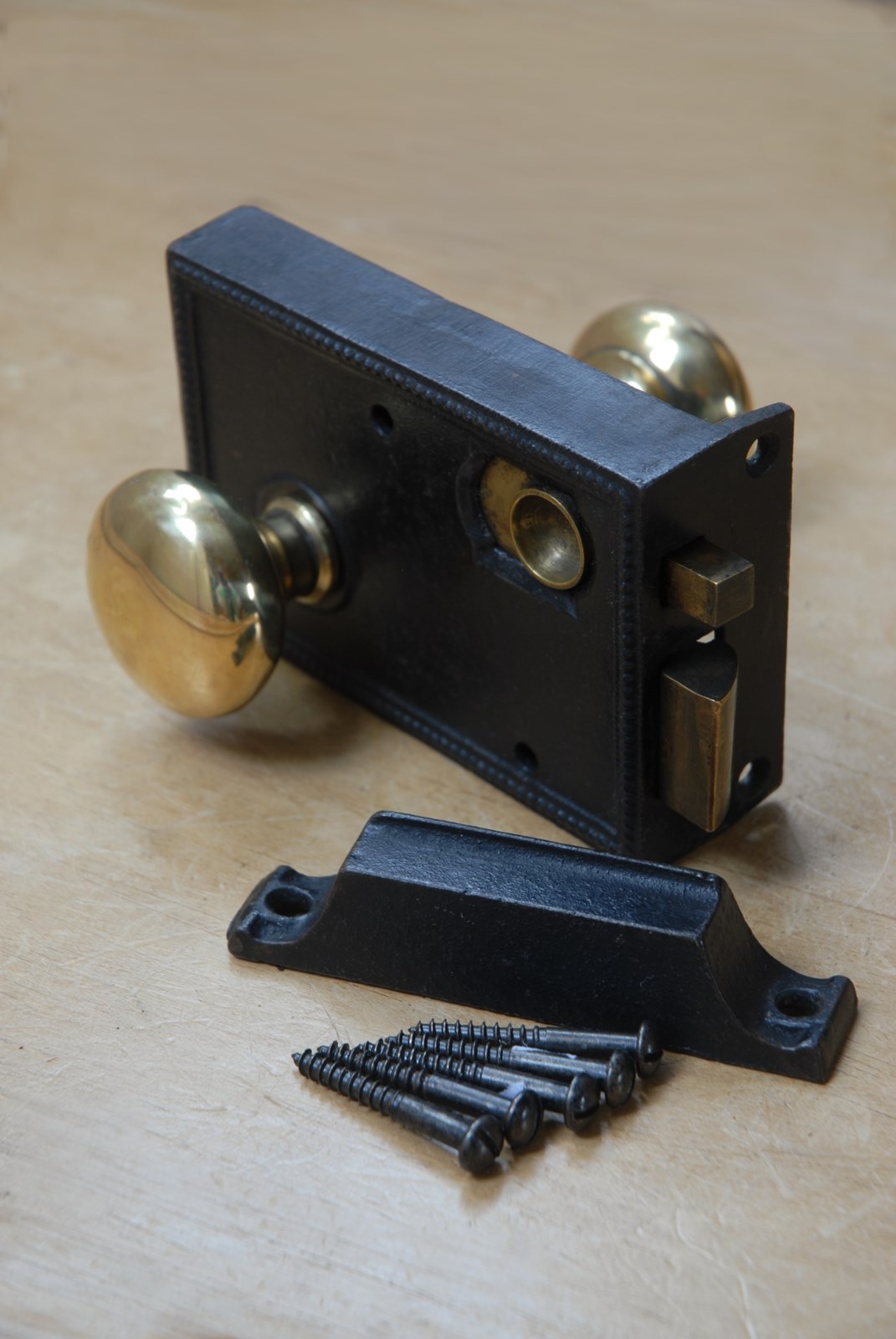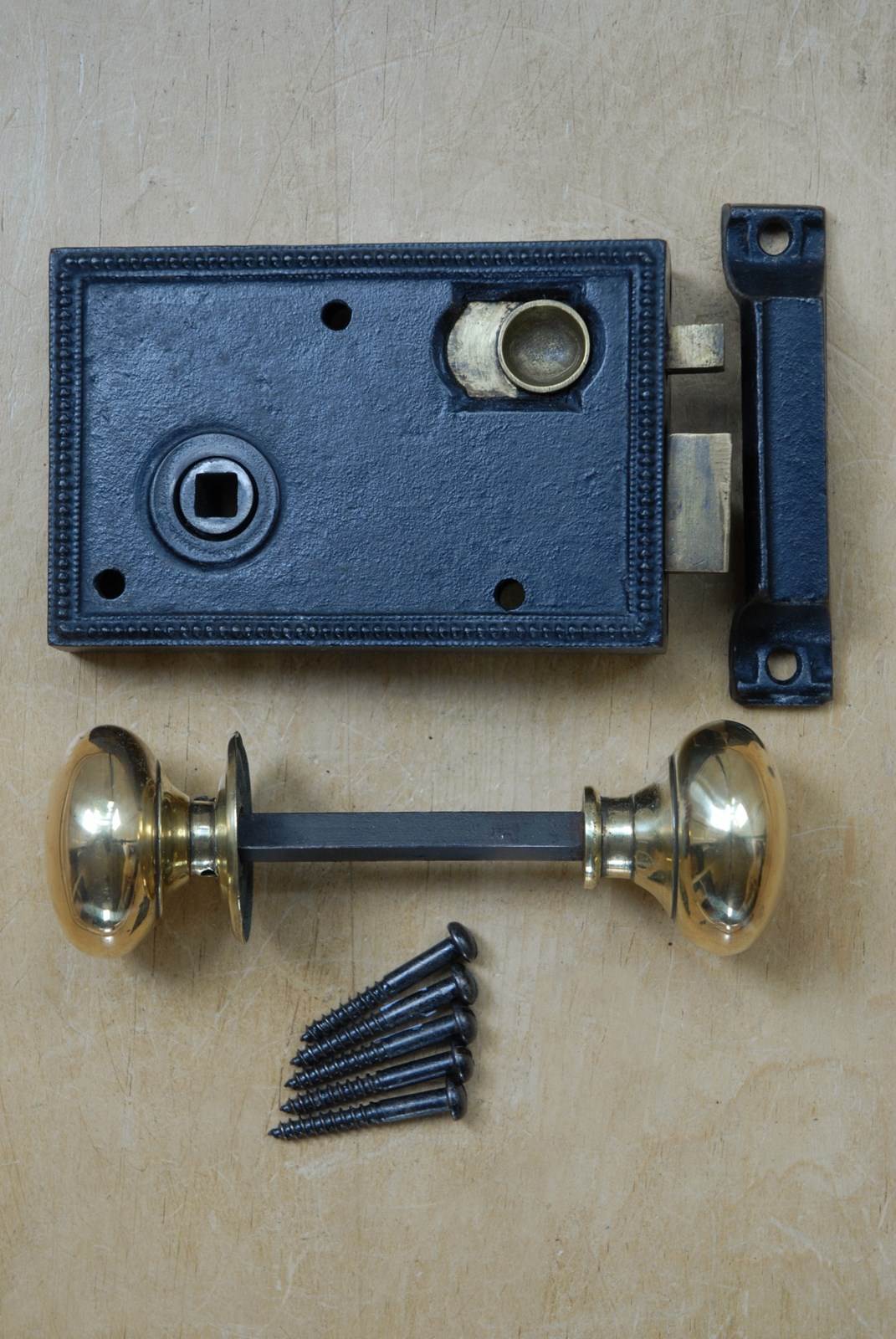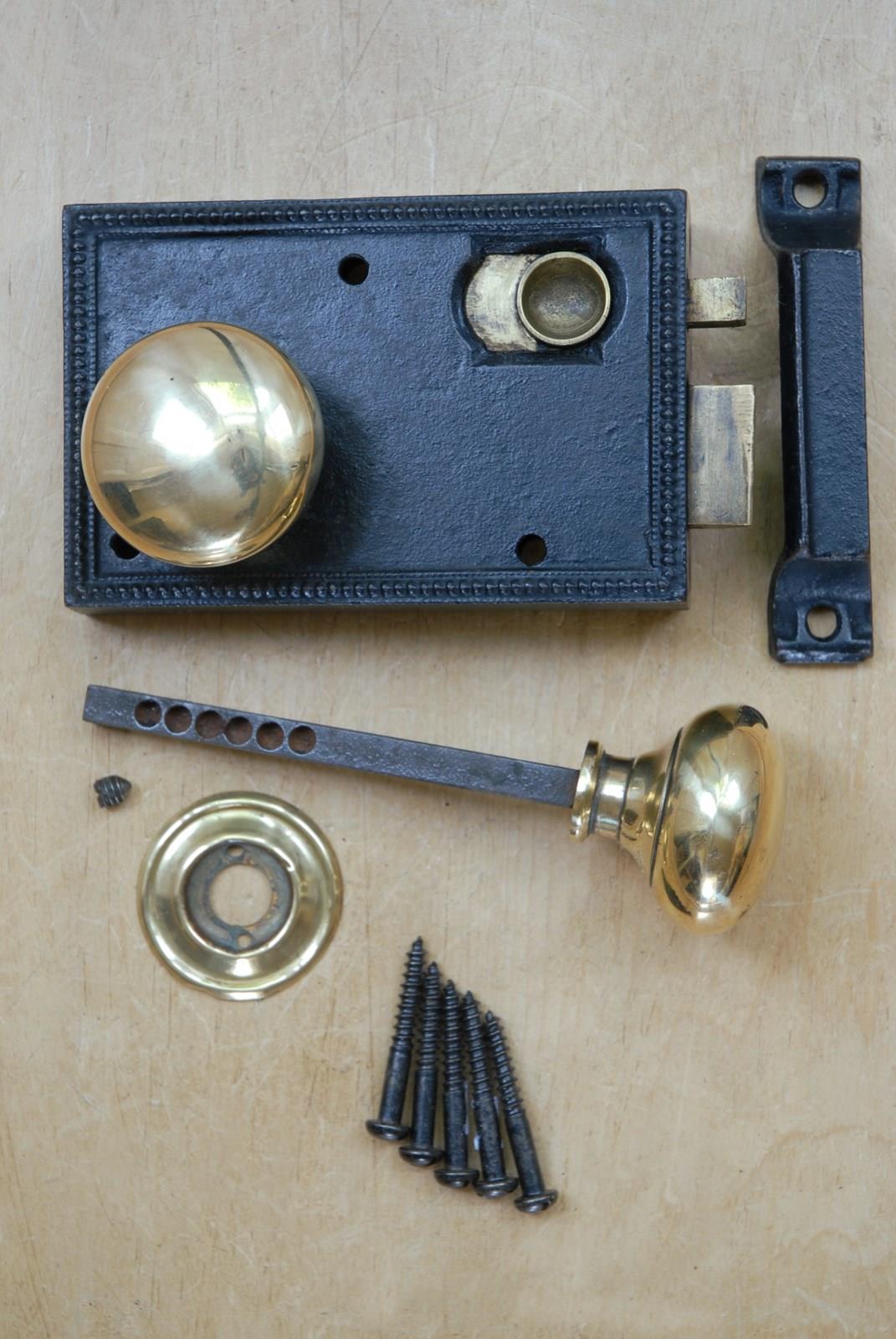 Description: An original solid cast iron antique rim lock set complete with spun brass handles. Dating from the Victorian era the lock has a brass sliding latch and is designed to be surface mounted. These locks are used in bathrooms, so that the door can be locked from the inside only, for privacy.