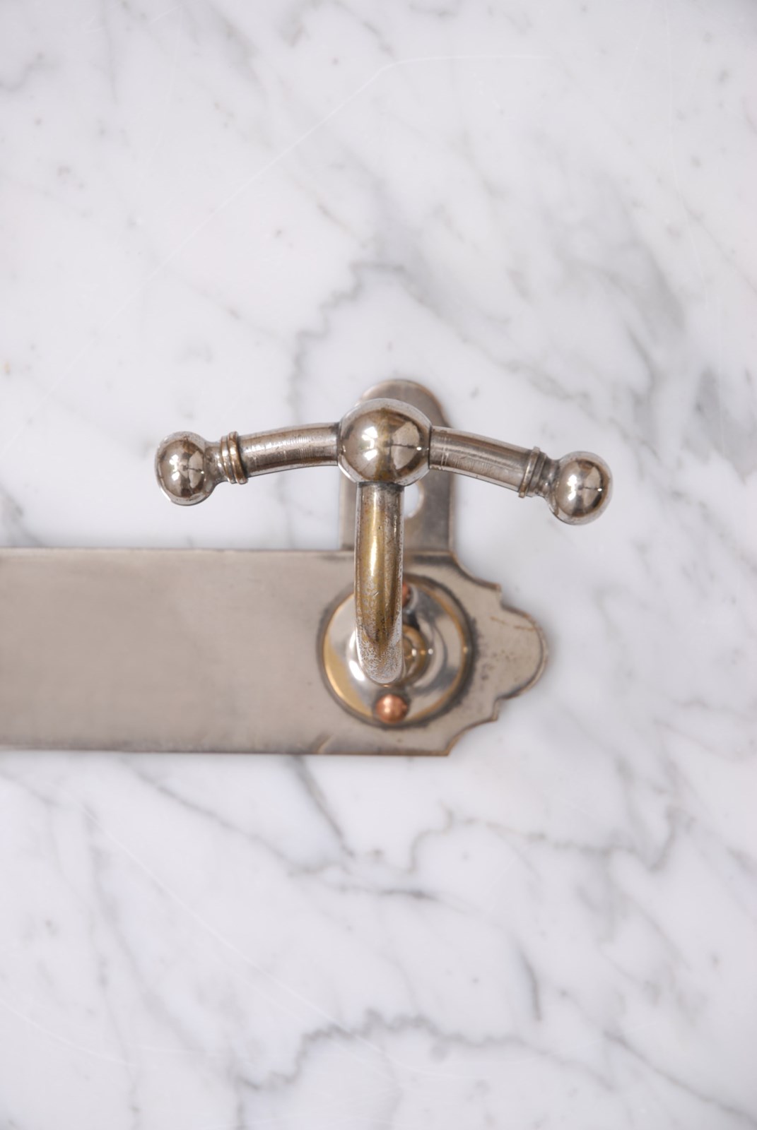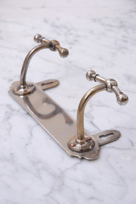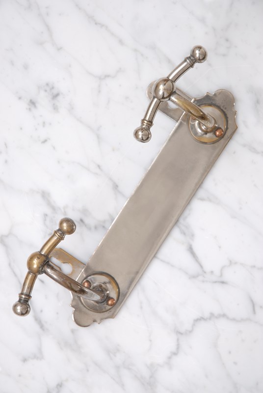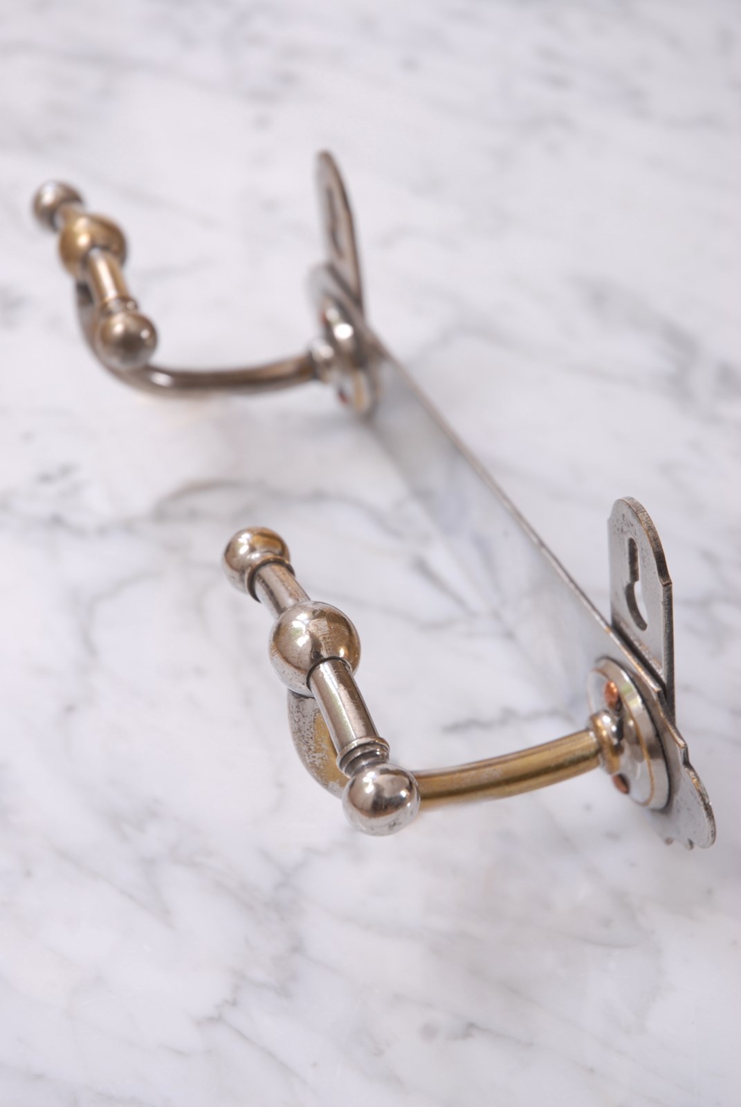 Description: An original antique nickel double bathroom hook. Sourced in France this example coordinates particularly well with some of the towel rails and sponge holders that are listed on the website.