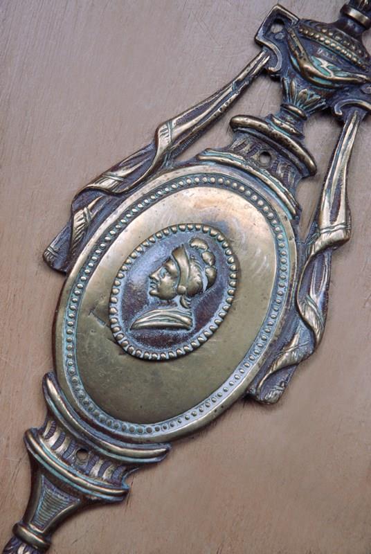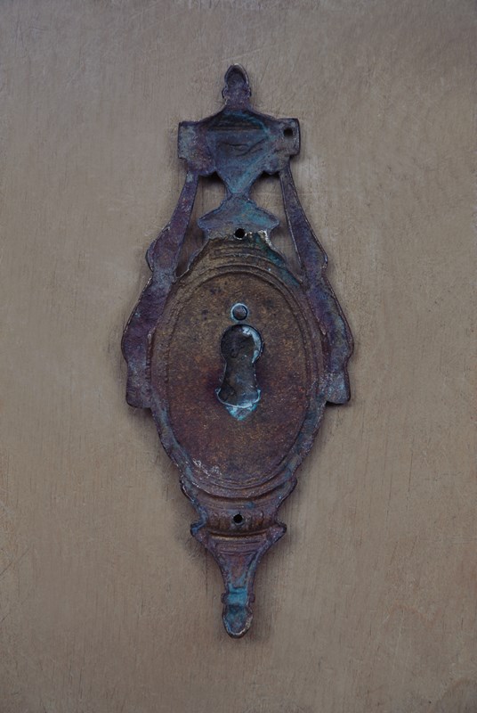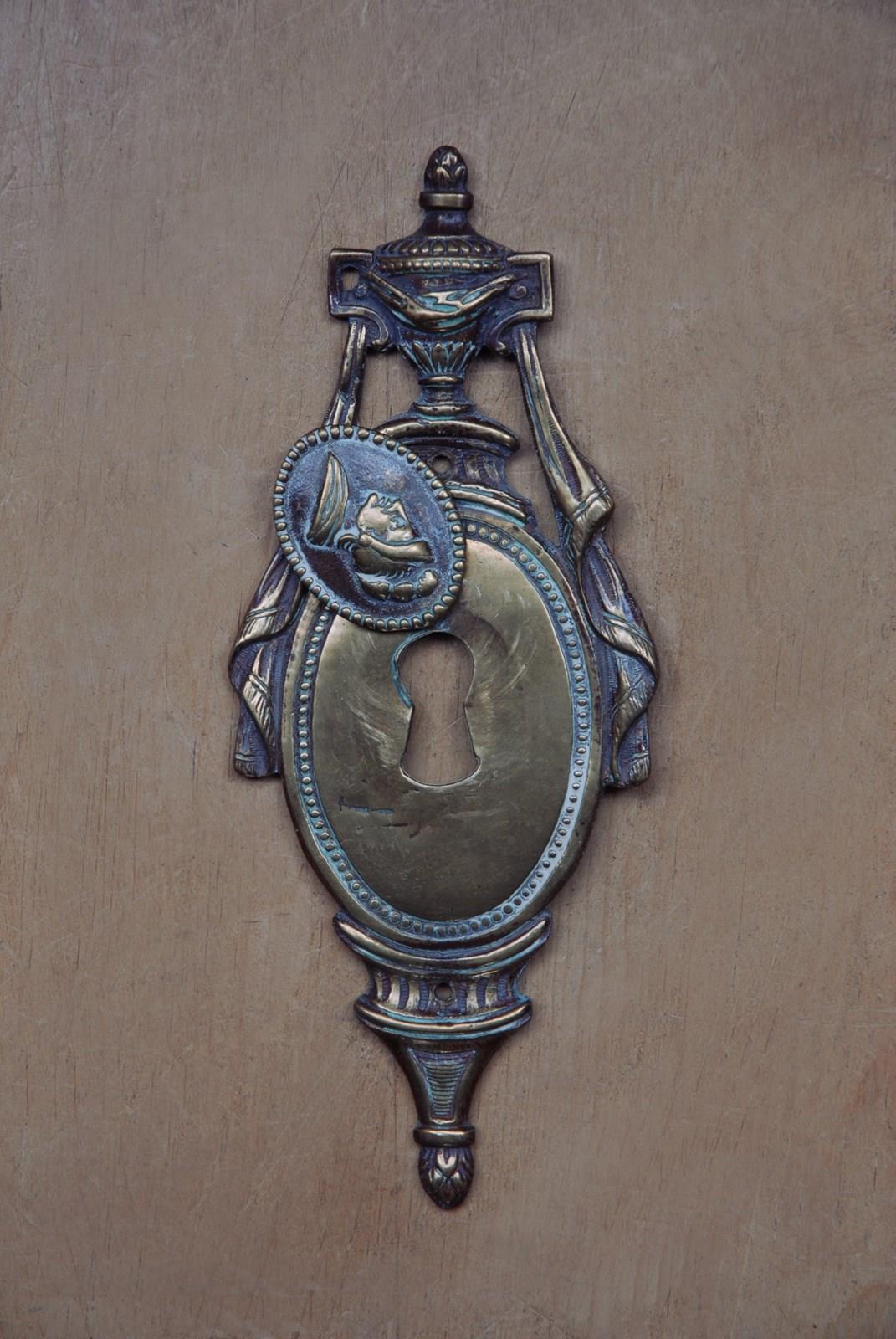 Description: Original, quality circa 1800, warm brass keyhole with an oval shaped swinging cover. This example has tthree screw holes for mounting and has a wonderful patina to the brass. An rare decorative piece with an urn and swags and a silhouette of a ladies face on the cover itself.
