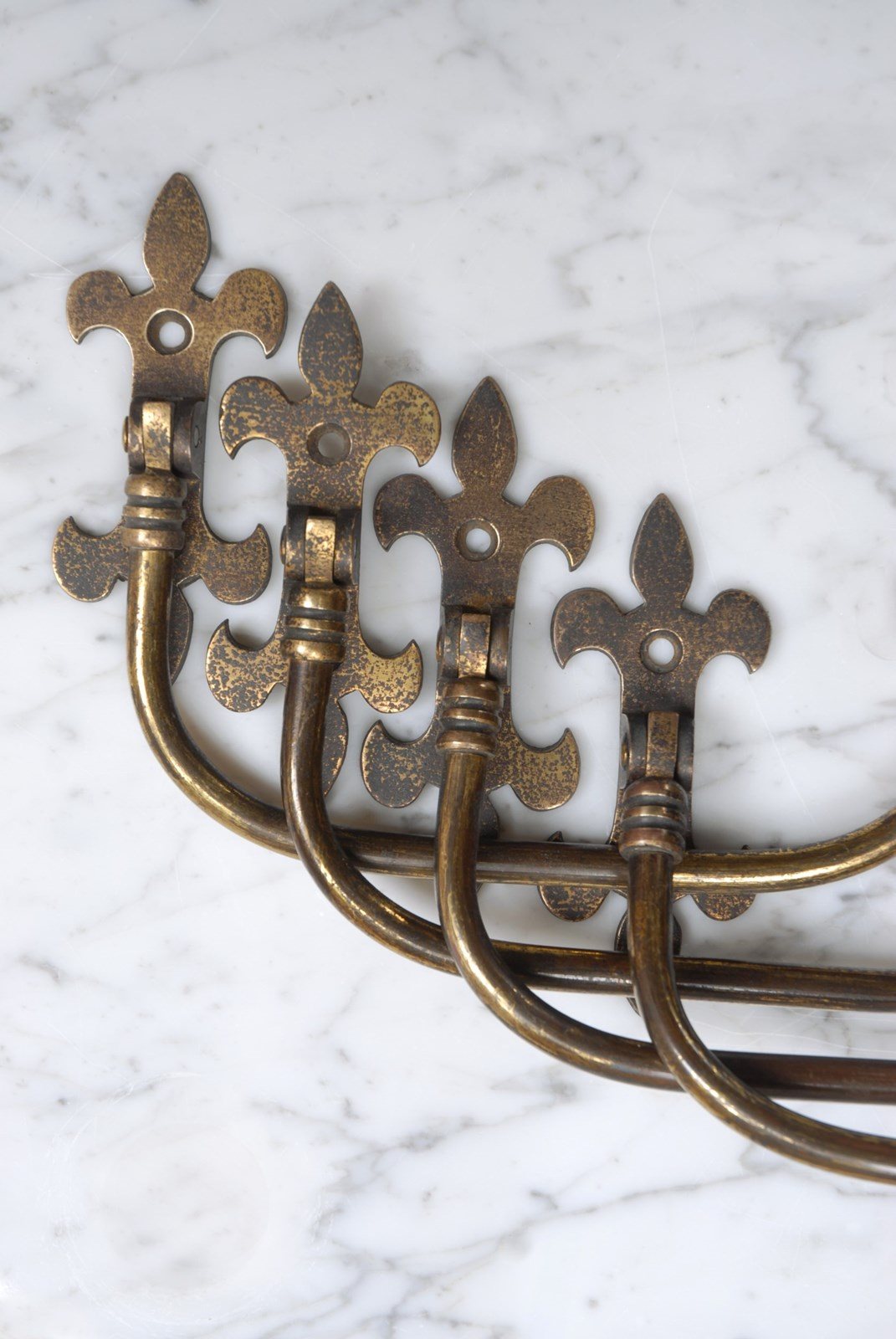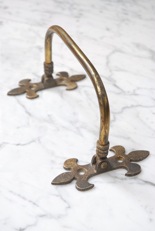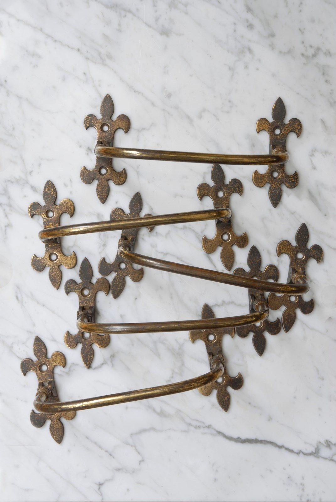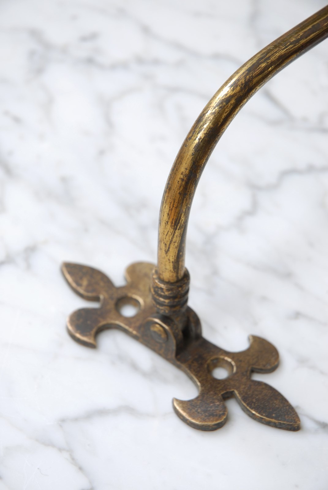 Description: These reclaimed gilded brass towel rails originated from a church, where they are used on the end of pews to support umbrellas. They make a perfect hand towel rail for a bathroom or kitchen. Each cast brass backplate has two recessed screw holes for installation. They can be mounted so that either the rail lies flat or turned around the rail stands out horizontally, great for hanging a hand towel on. I have four of these currently available, the price is for x1 single rail.
