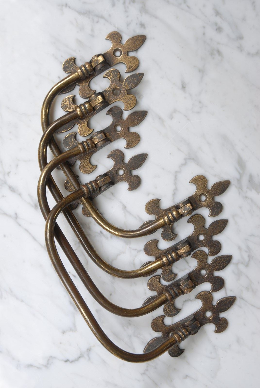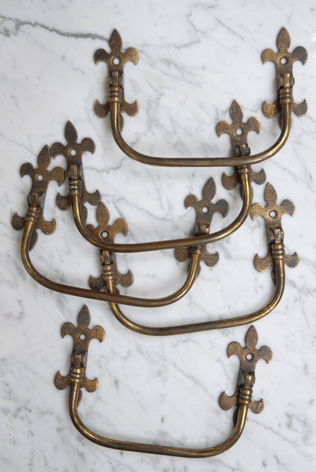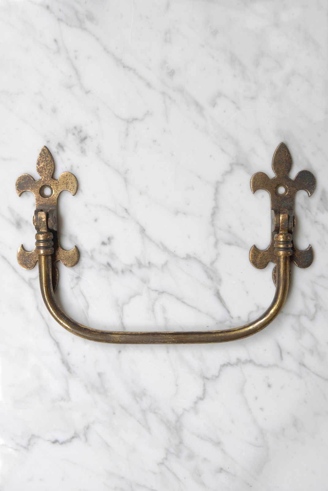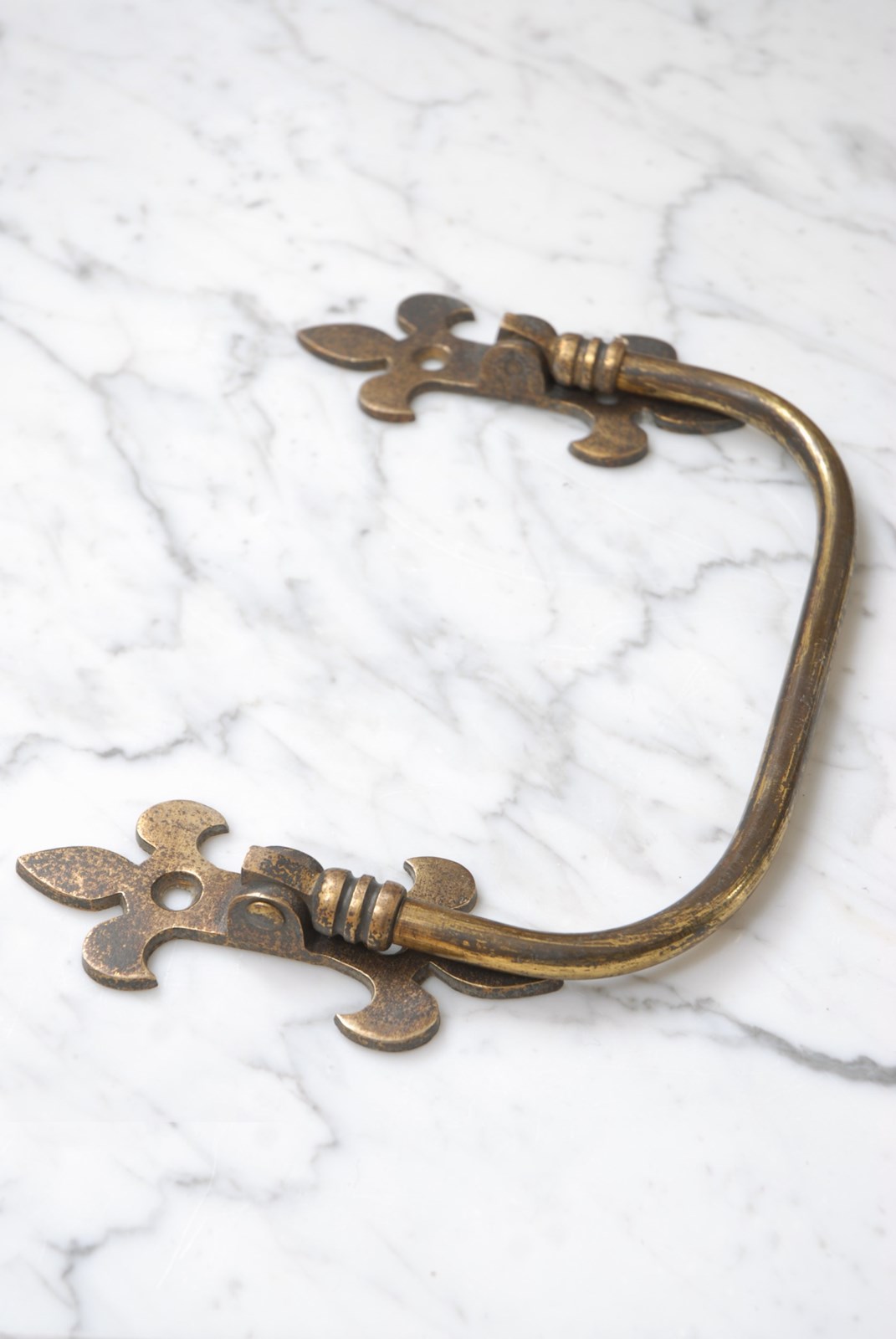 Description: These reclaimed gilded brass towel rails originated from a church, where they are used on the end of pews to support umbrellas. They make a perfect hand towel rail for a bathroom or kitchen. Each cast brass backplate has two recessed screw holes for installation. They can be mounted so that either the rail lies flat or turned around the rail stands out horizontally, great for hanging a hand towel on. I have four of these currently available, the price is for x1 single rail.