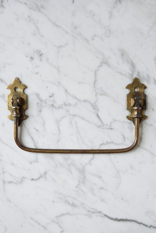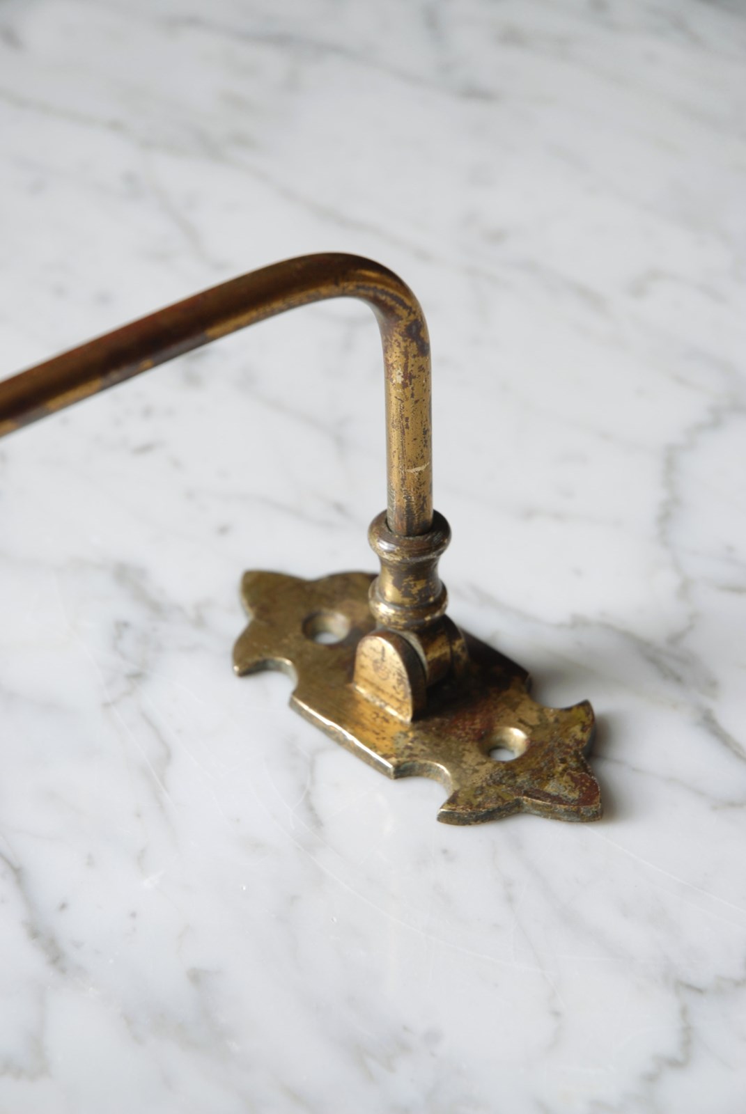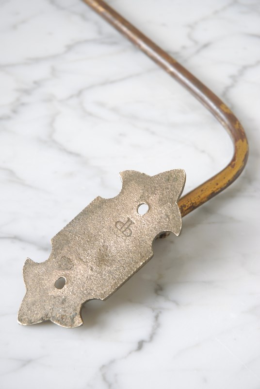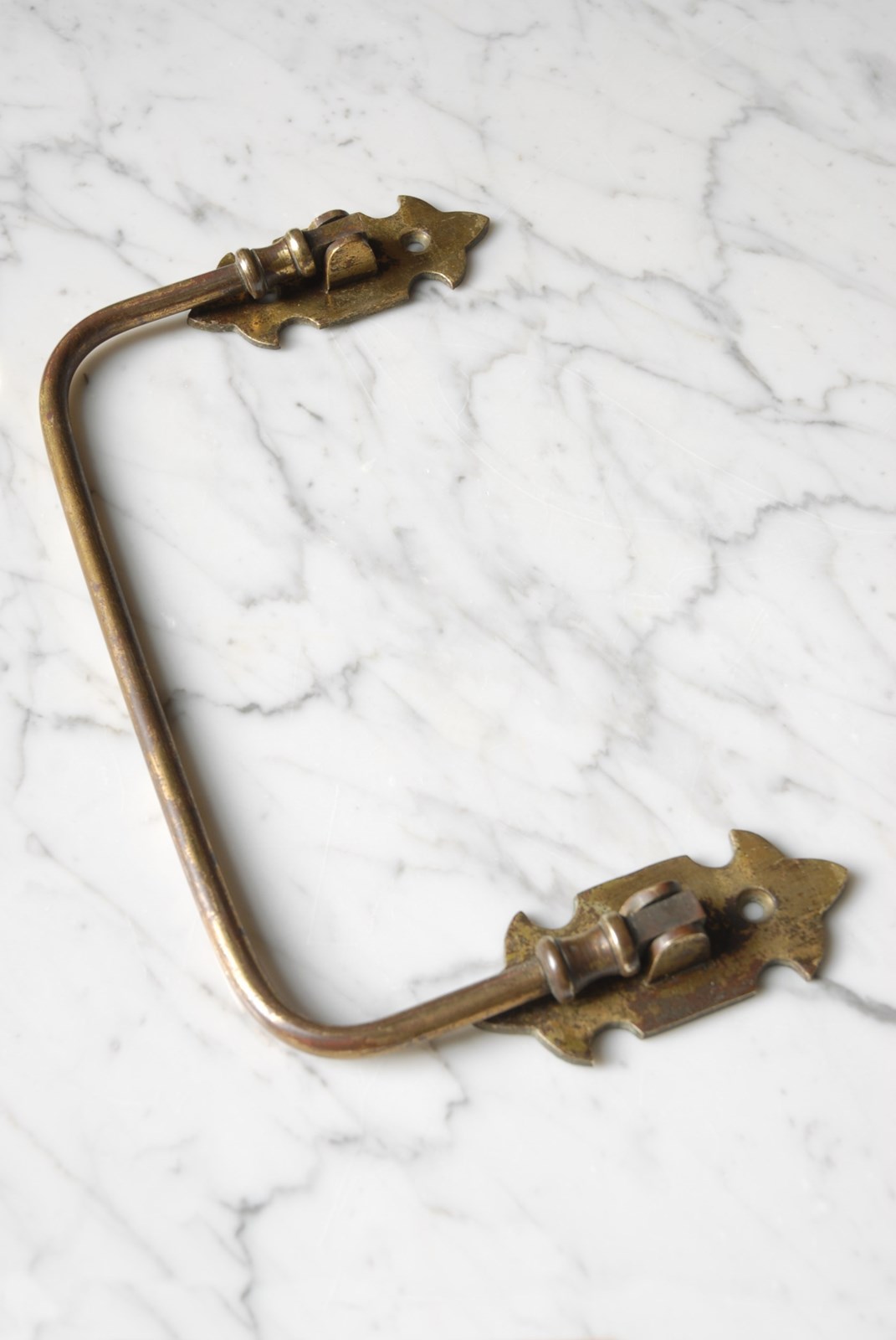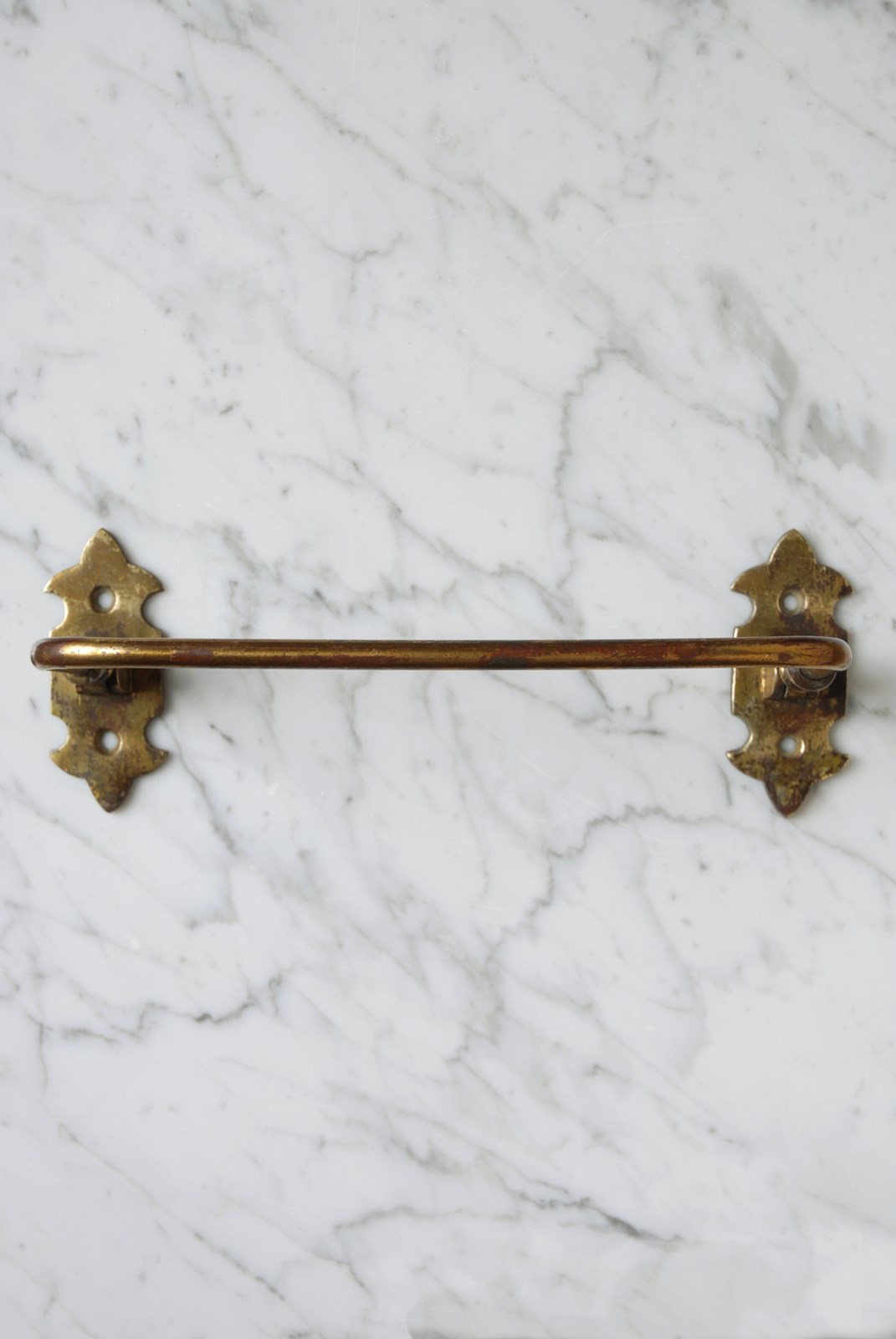 Description: These reclaimed gilded brass towel rails originated from a church, where they are used on the end of pews to support umbrellas. They make a perfect hand towel rail for a bathroom or kitchen. Each cast brass backplate has two recessed screw holes for installation. They can be mounted so that either the rail lies flat or turned around the rail stands out horizontally, great for hanging a hand towel on. I have 6 of these currently available, the price is for x1 single rail.