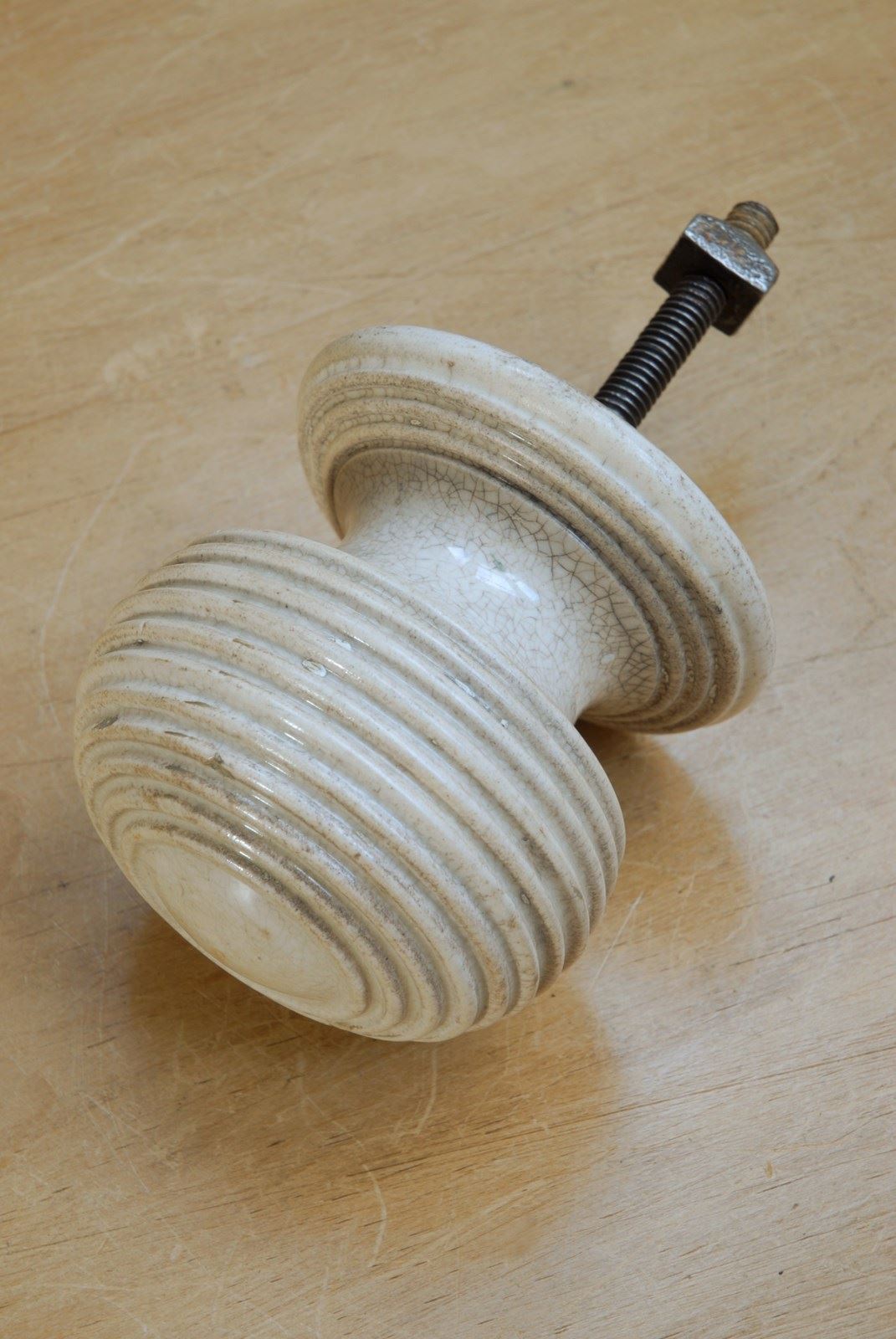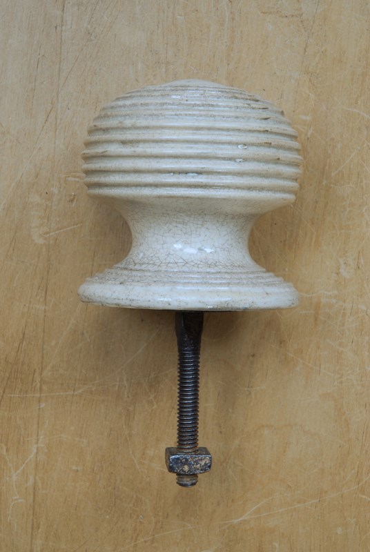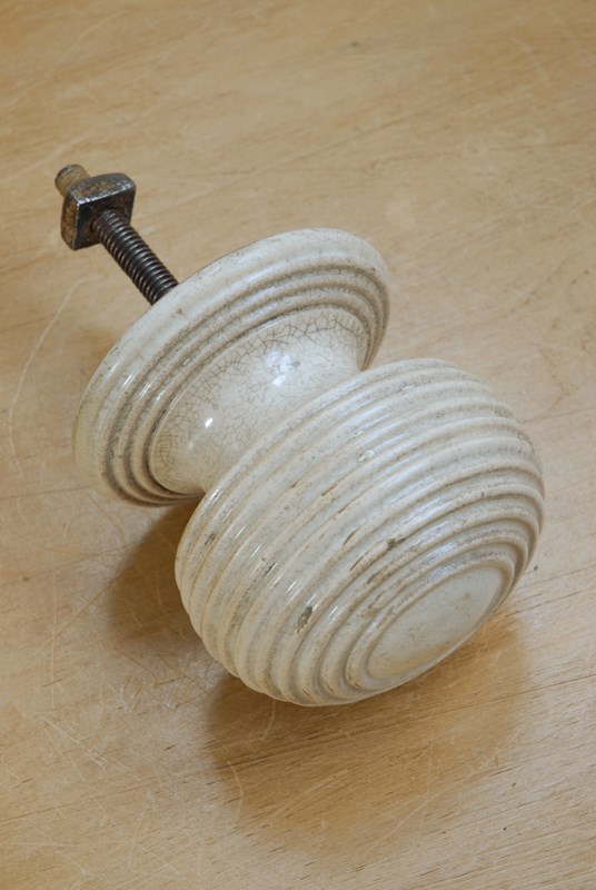 Description: Impressive large sized original Victorian front door knob. This handle is ceramic with a fine crackle glaze to the surface, quality heavy weight. The ribbed pattern is referred to as the beehive style and was popularised during the Victorian era having been first introduced during the Georgian period as a design feature which allowed grip of the handle to function well. Threaded back screw with bolt for installation.