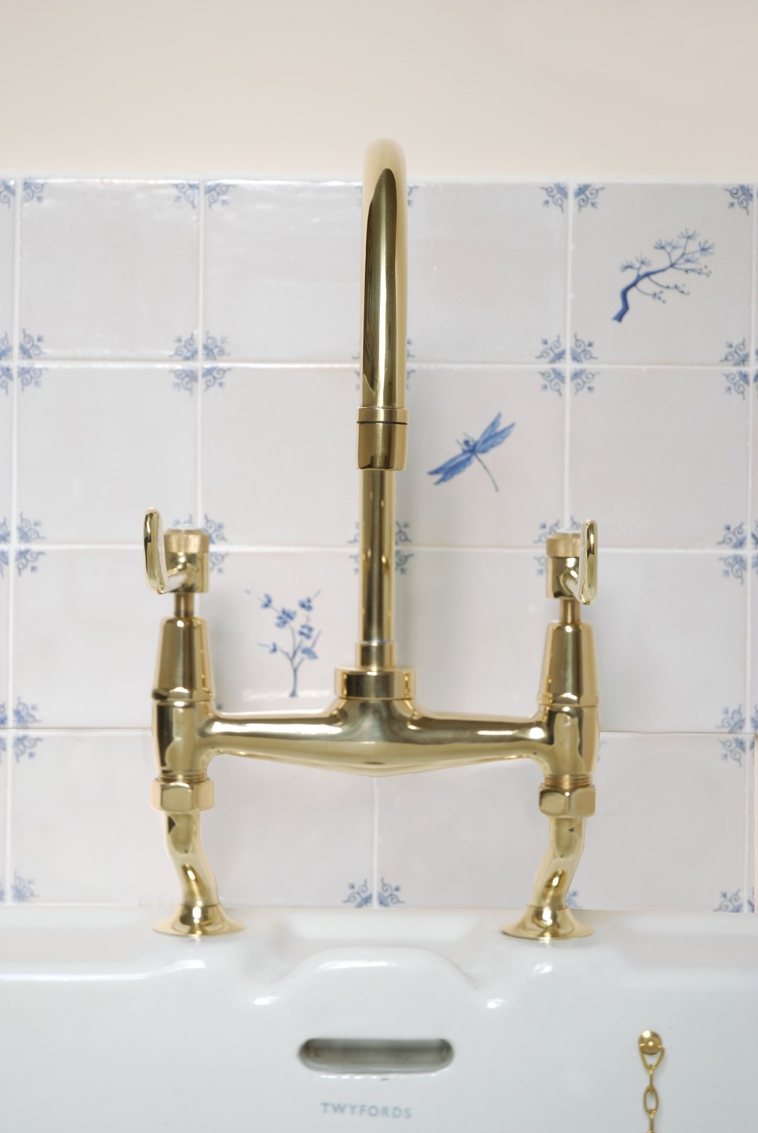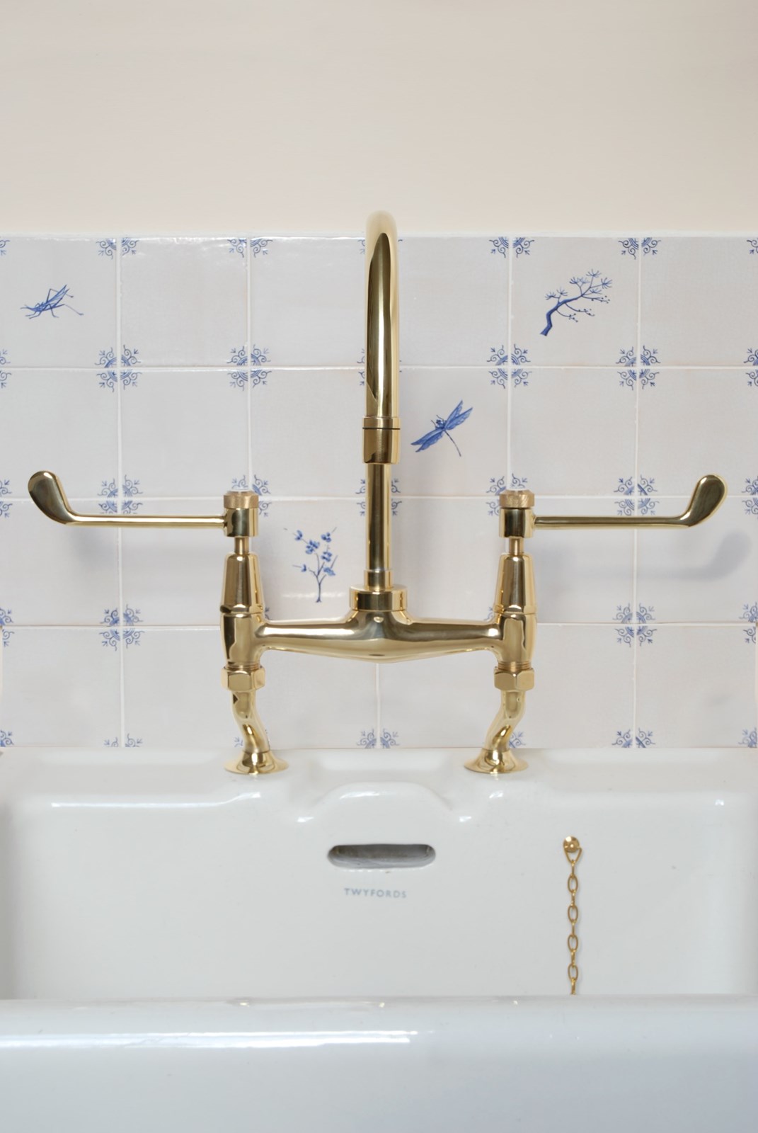 Description: These Water & Wood brass deck mounted mixer taps are a celebration of British craftsmanship. Entirely made in the UK in small batches. Assembled by hand, ensuring the products are built to last and continuing a long tradition of British tap making. These taps have a real presence, with their lever arms. The warm golden brass and ceramic indices create a timeless and honest elegance, pairing equally well with a contemporary or vintage sink. The taps legs can be positioned to fit your sink set up and the swivel bi flow spout has a good reach which can be paired with a single or double bowl sink.