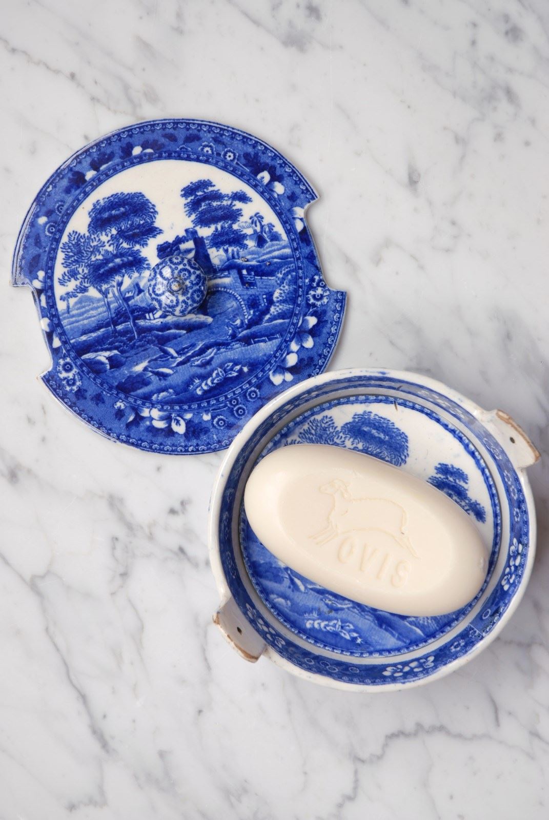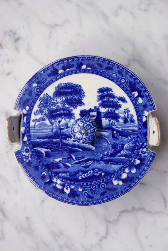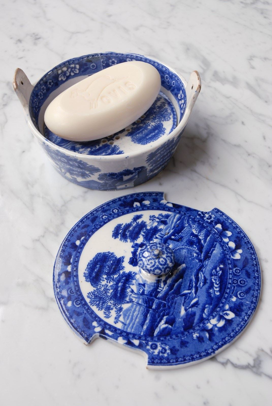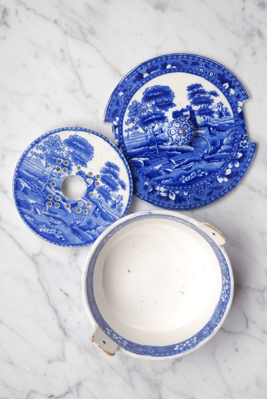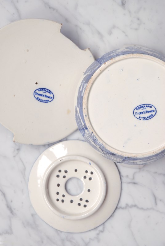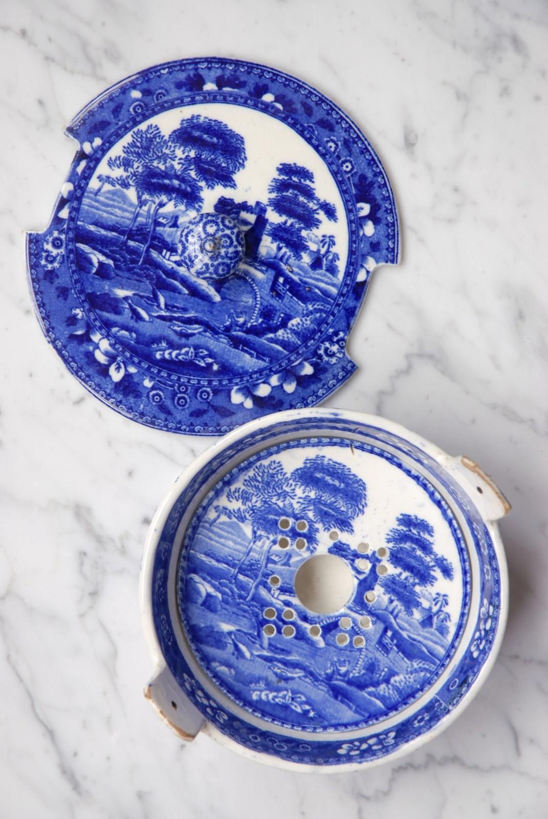 Description: Antique Copeland Spode’s Tower soap dish dating from the early 1800’s. All complete, the set includes a bowl with lug handles where the lid sits and inside a drip tray for the soap to rest on. This rare blue transferware design features a bridge in a rural setting. The soap dish is designed to be placed on a surface. Good clear makers marks to the base. A beautiful, elegant and timeless bathroom accessory.