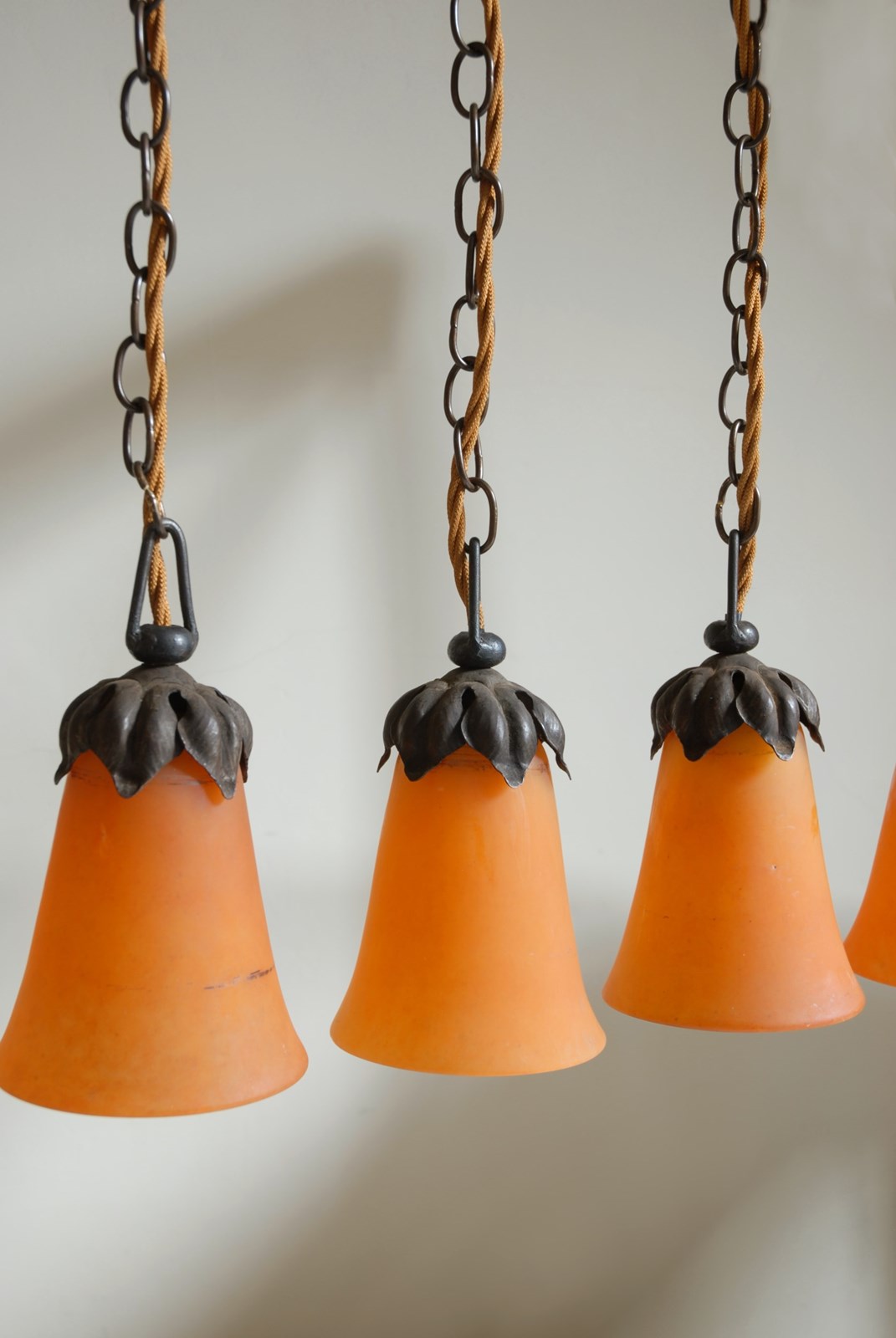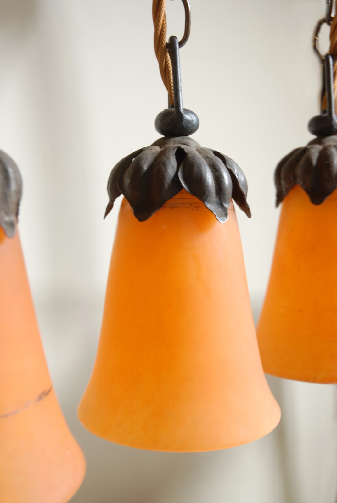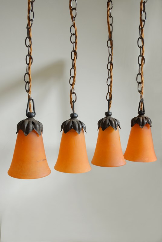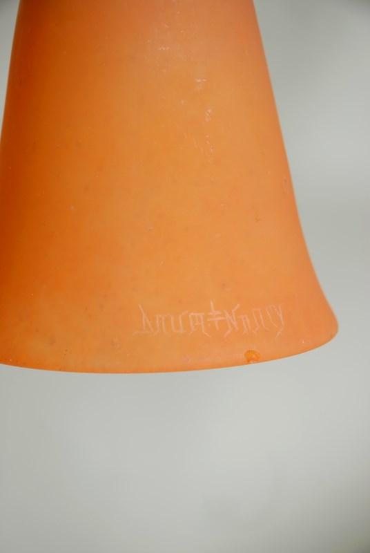 Description: A wonderful Daum Nancy glass pendant light. It is most likely that these glass shades would have been hung around the edge of a plafonniere from the early 1900’s. Sourced as individual orange glass shades, they have been transformed into single pendant lights, with modern wiring ready for installation. Each shade originated from the glass works of Andre Delatte in Nancy and are individually signed Daum Nancy France and inscribed with an image of the Cross of Loraine, a playful nod to their heritage. The pendant is suspended by a naturalistic vine lamp holder, original to the piece. The price is for one single pendant light. I currently have four identical ones available to purchase.