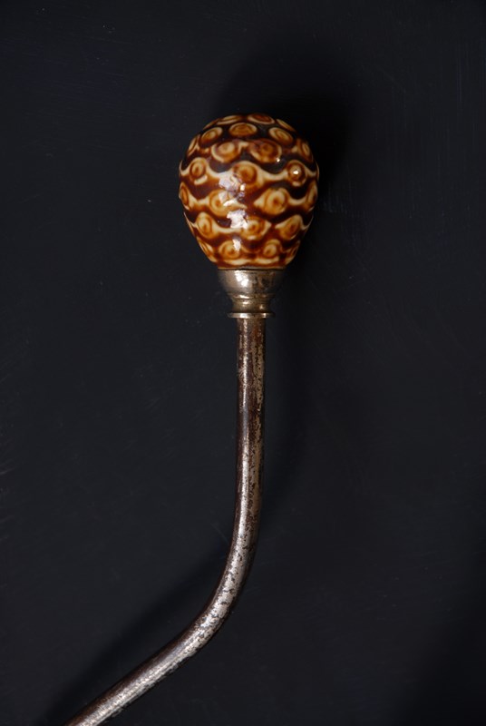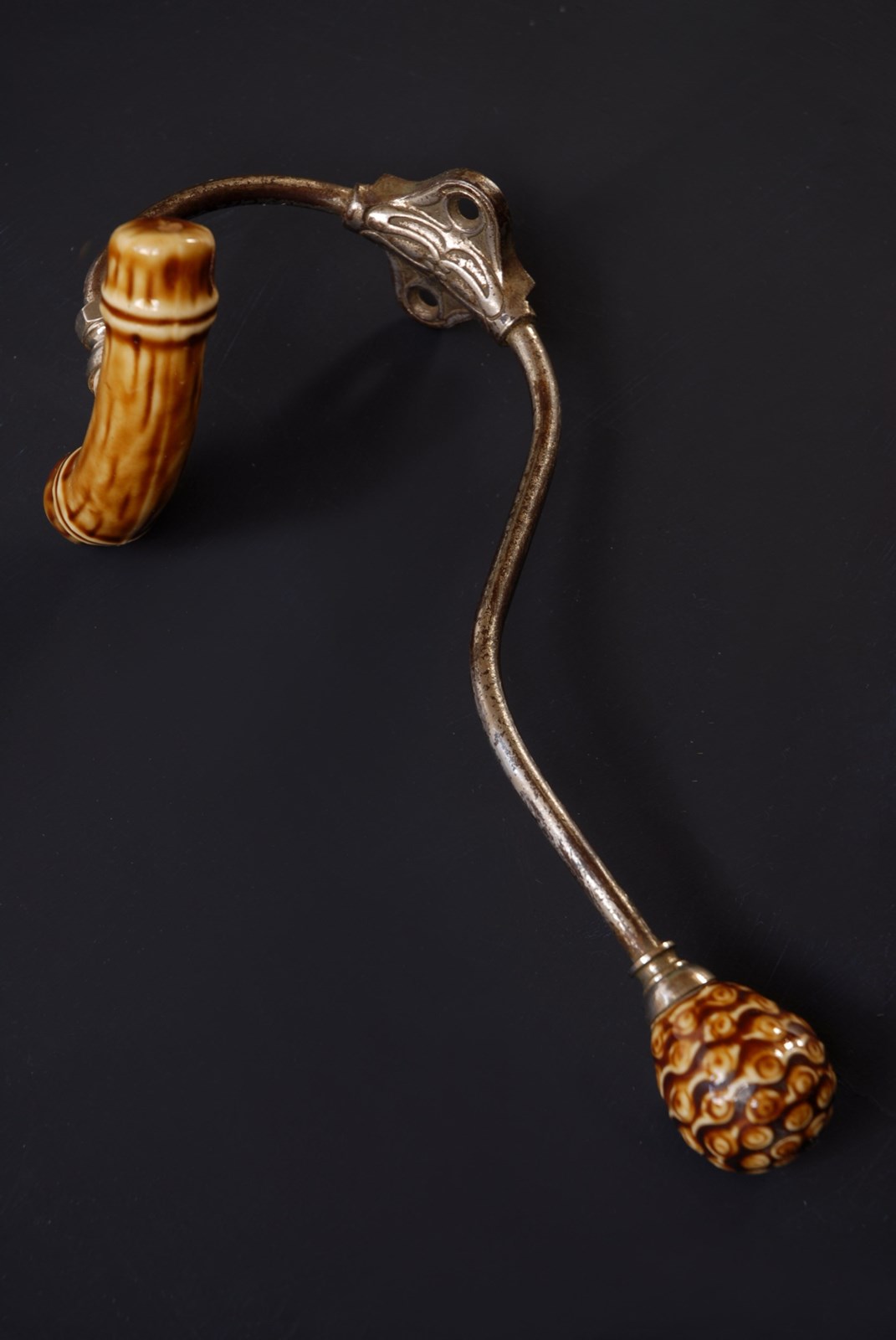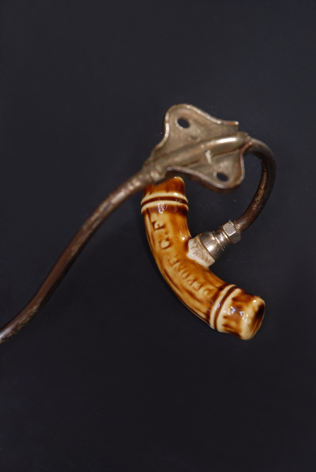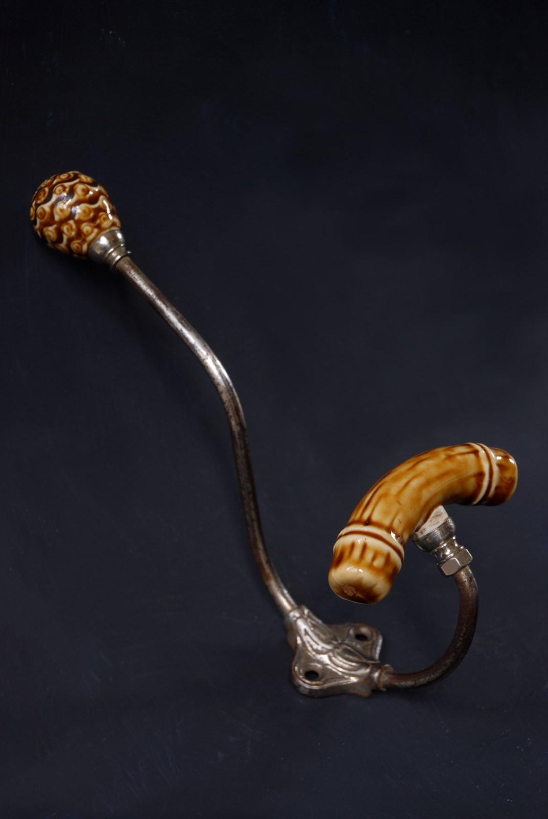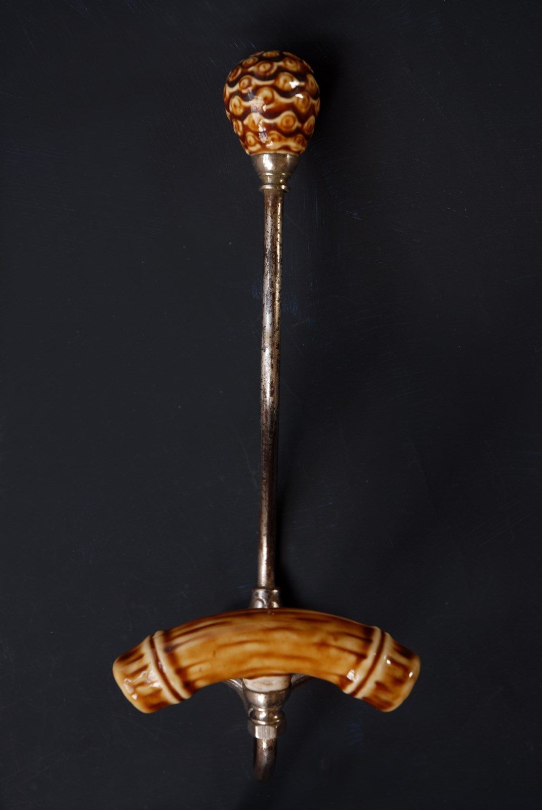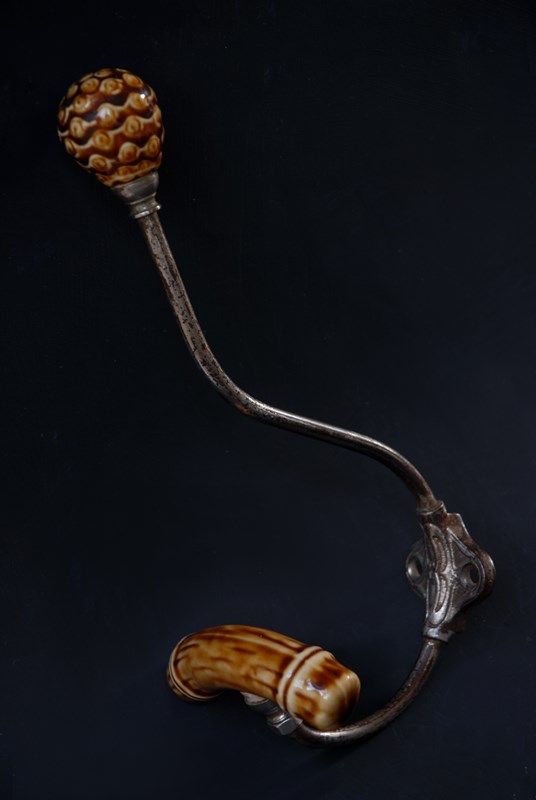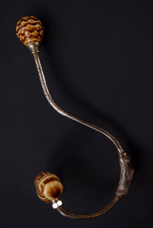 Description: An original French double hook. With unusual faux bamboo ceramic finials. In a large size for coats and accessories.