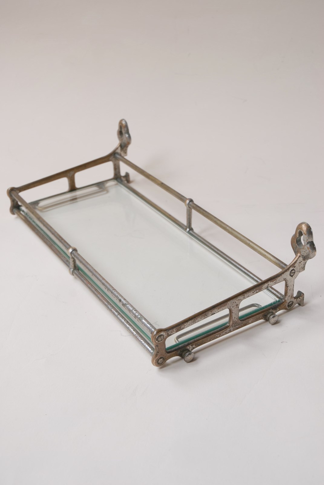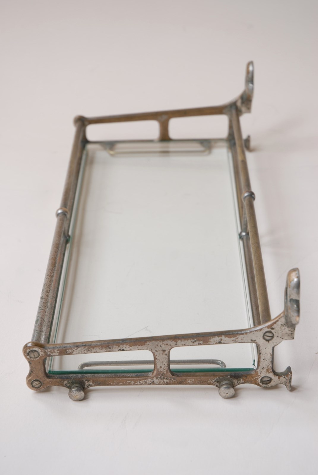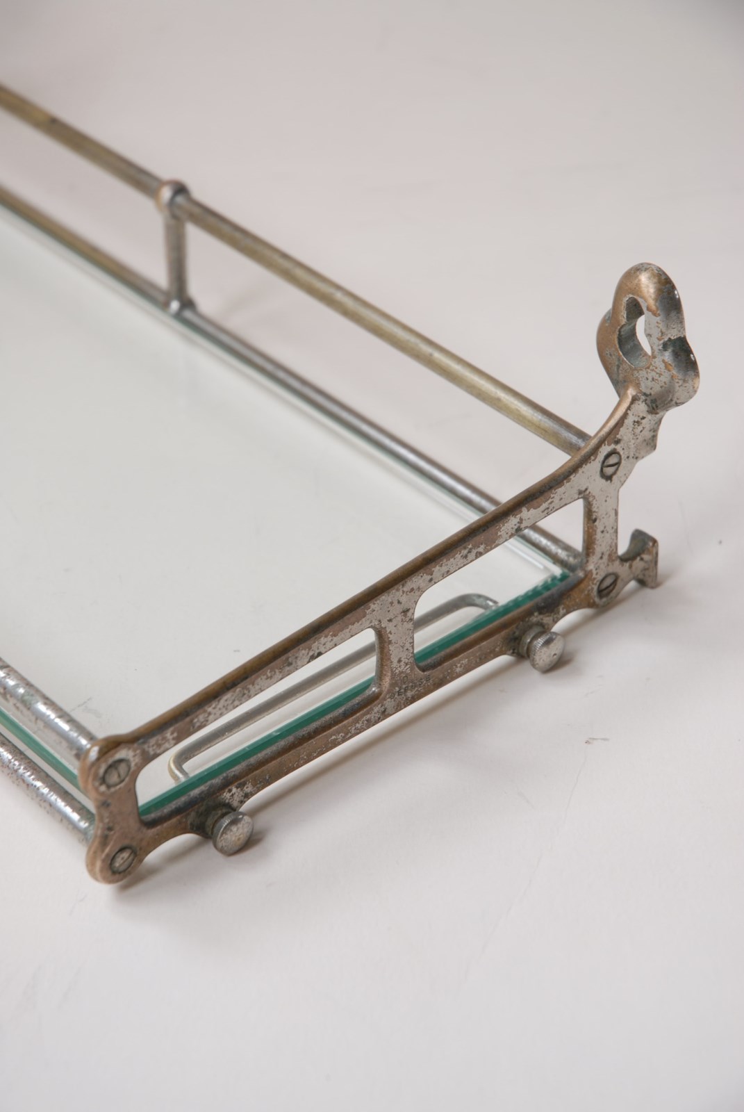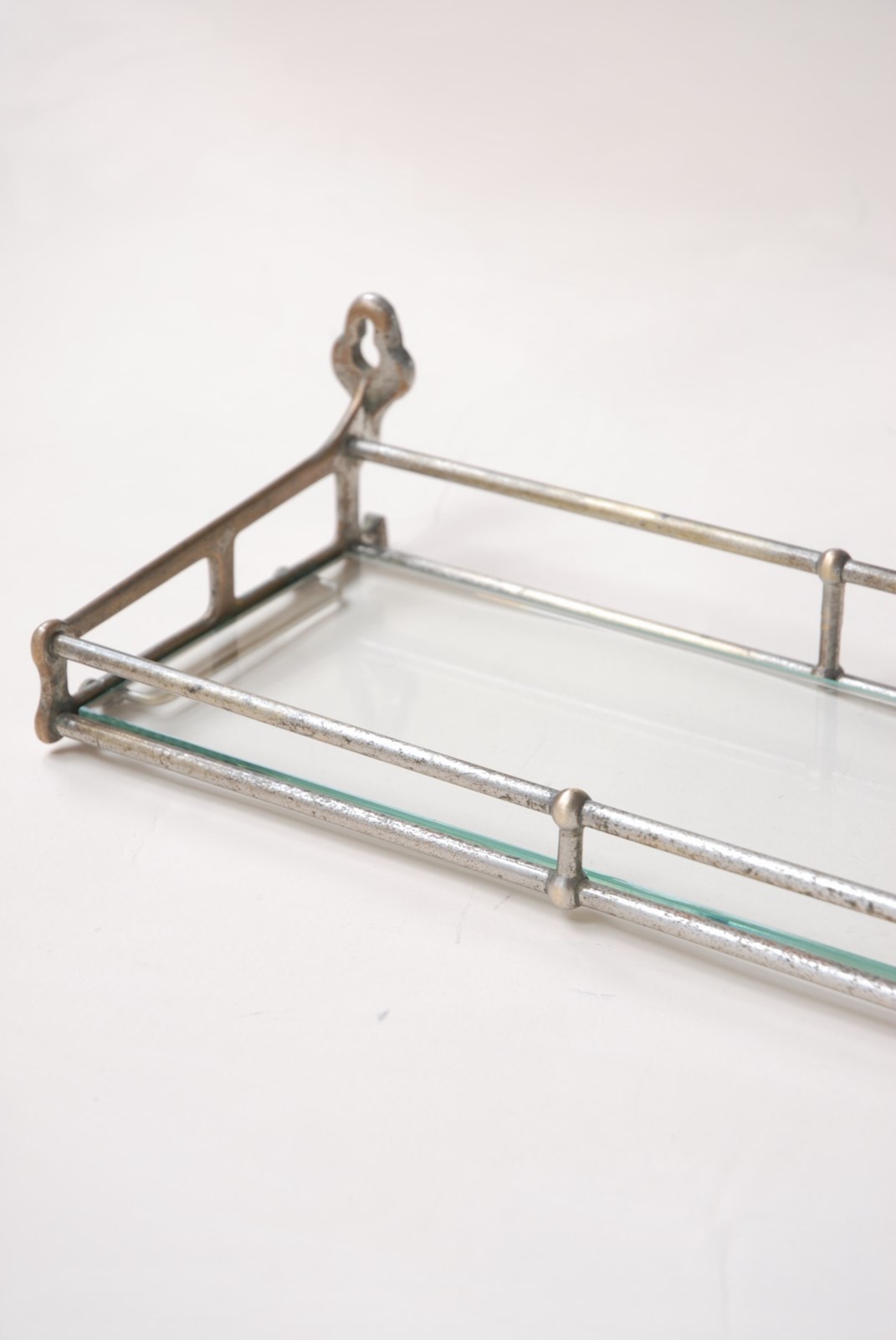 An antique French bathroom shelf. With its original glass shelf. Beautifully shaped almost Art Nouveau mounts in solid brass with a nickel plated finish. Handy size for bathroom essentials. Each back plate has two screw holes for wall mounting.