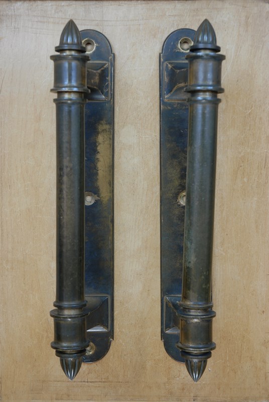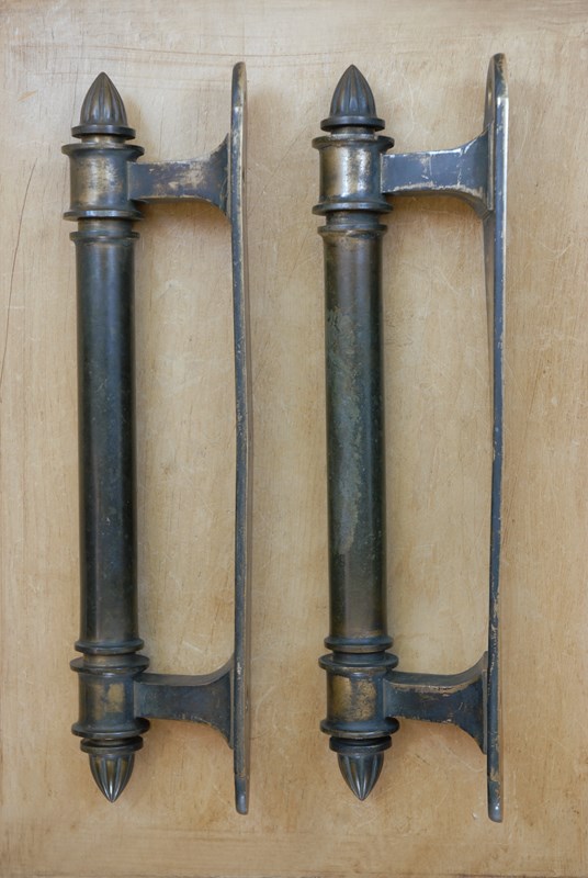 Original, quality antique bronze door pull handles. These examples were sourced in Cannes on the Cote D’azure. Each single heavy cast bronze handle weighs 3 kilos. The turned pulls end with a lobed, fluted finial and are mounted on a rectangular cast back plate, with 3 recessed screw holes. Wonderful patination to the bronze.