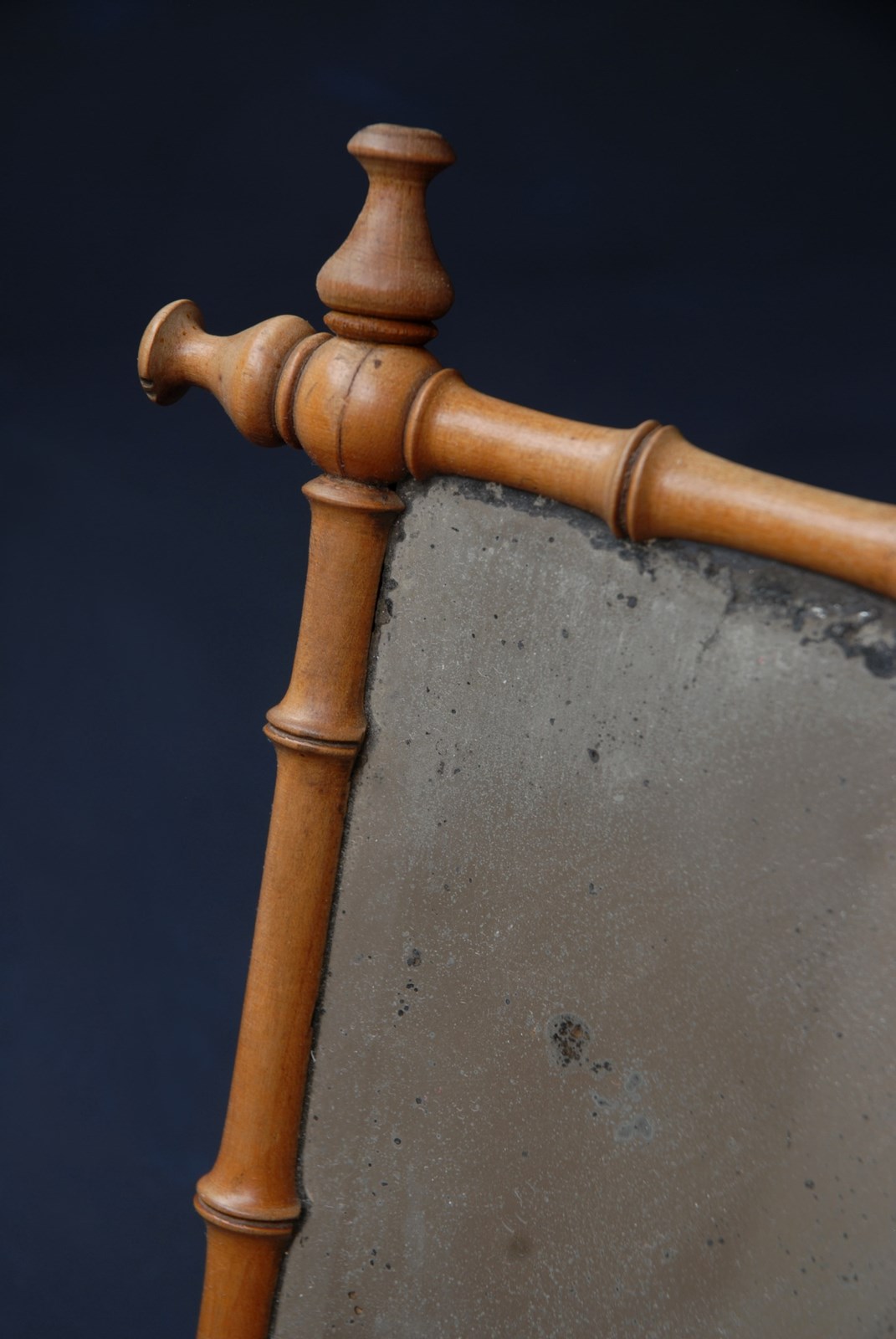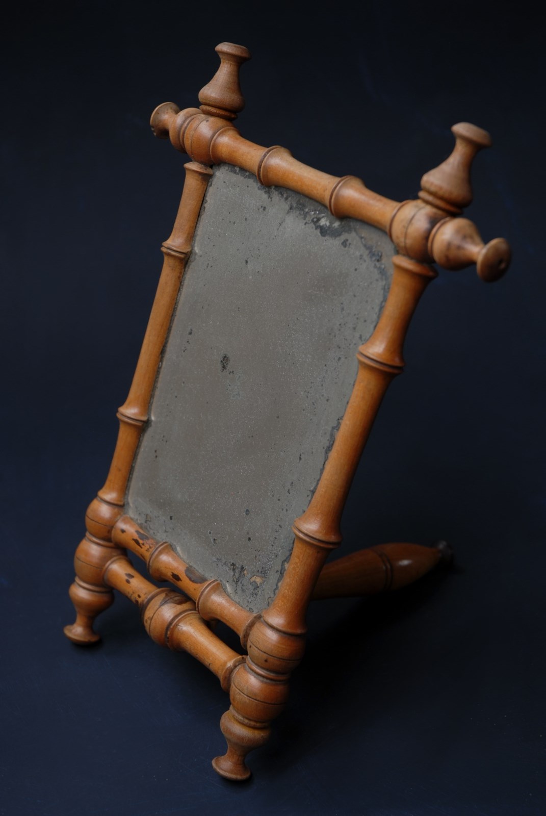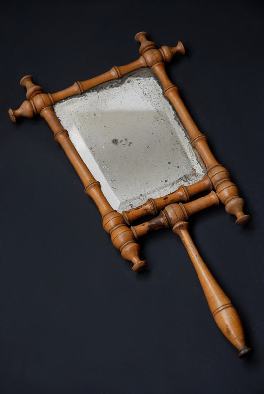 An antique vanity mirror dating from the early 1800's. The design comprises of a finely carved wooden easel frame , simulating bamboo, around a gently foxed mirror plate. Designed to be either hand held or placed on a surface. Wonderful delicate and refined quality to the piece.