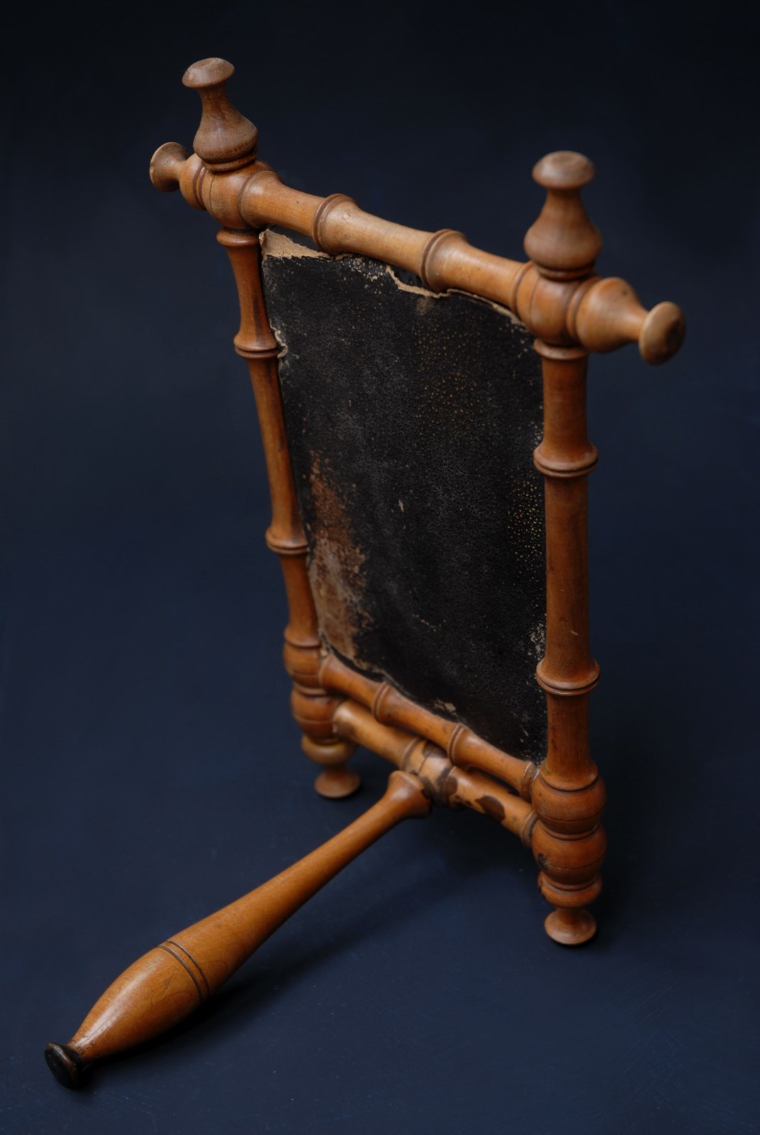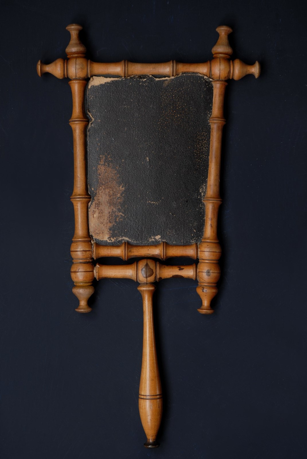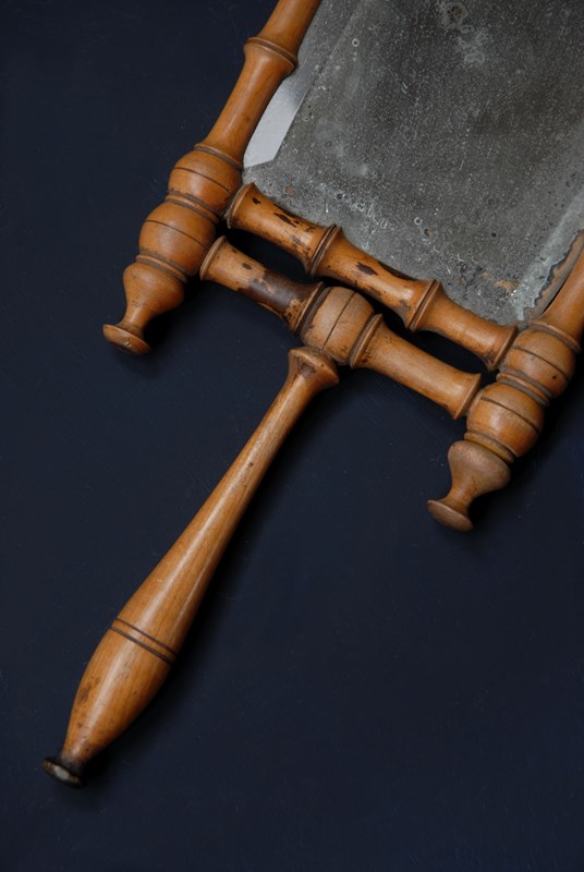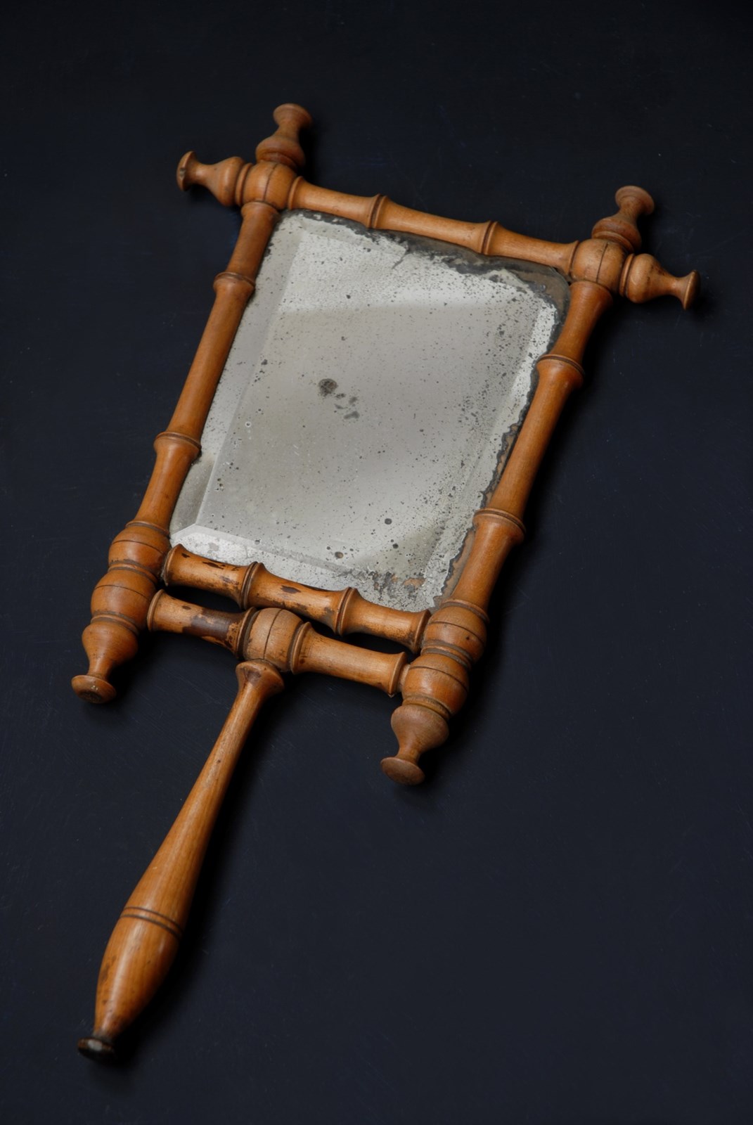 An antique vanity mirror dating from the early 1800's. The design comprises of a finely carved wooden easel frame , simulating bamboo, around a gently foxed mirror plate. Designed to be either hand held or placed on a surface. Wonderful delicate and refined quality to the piece.