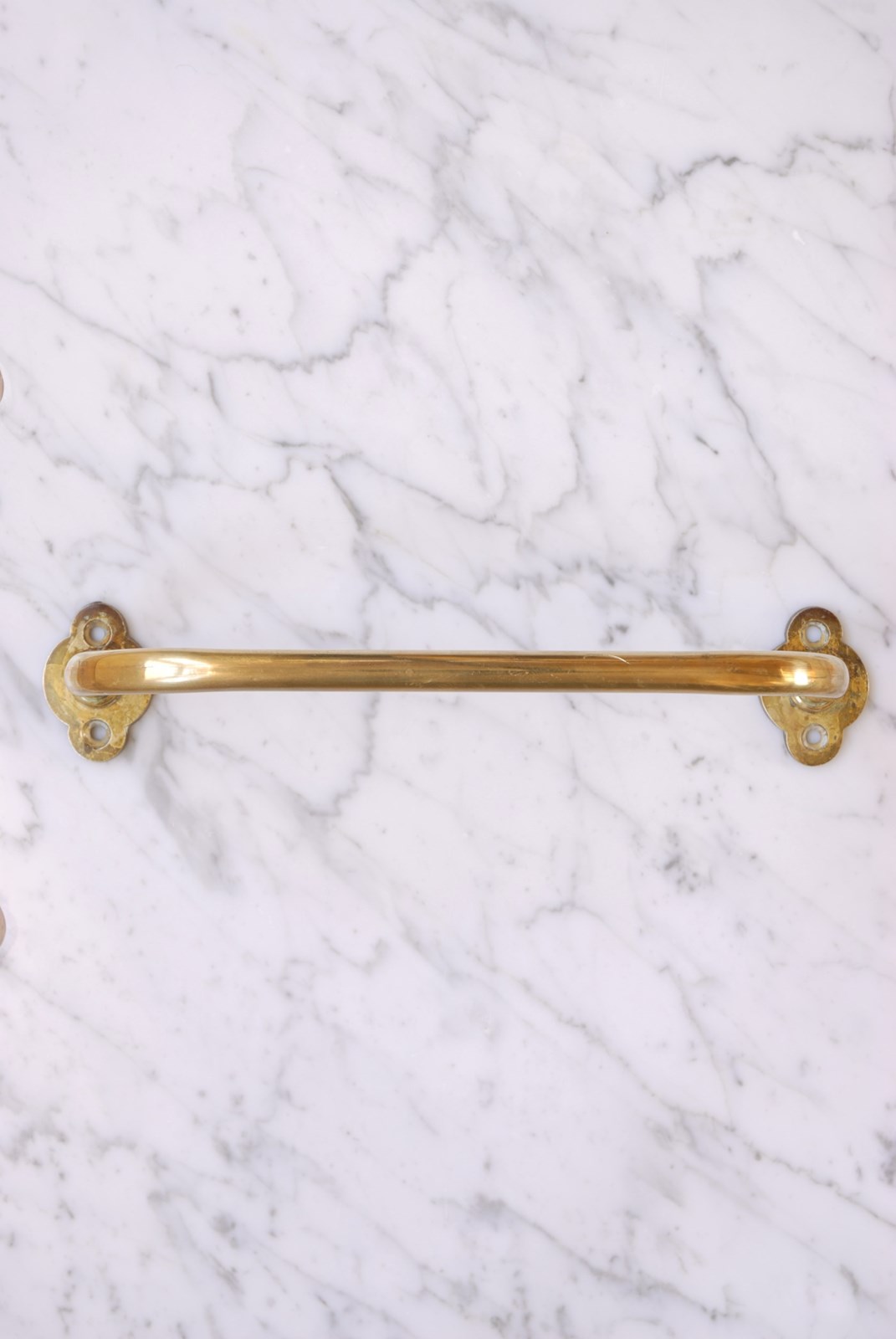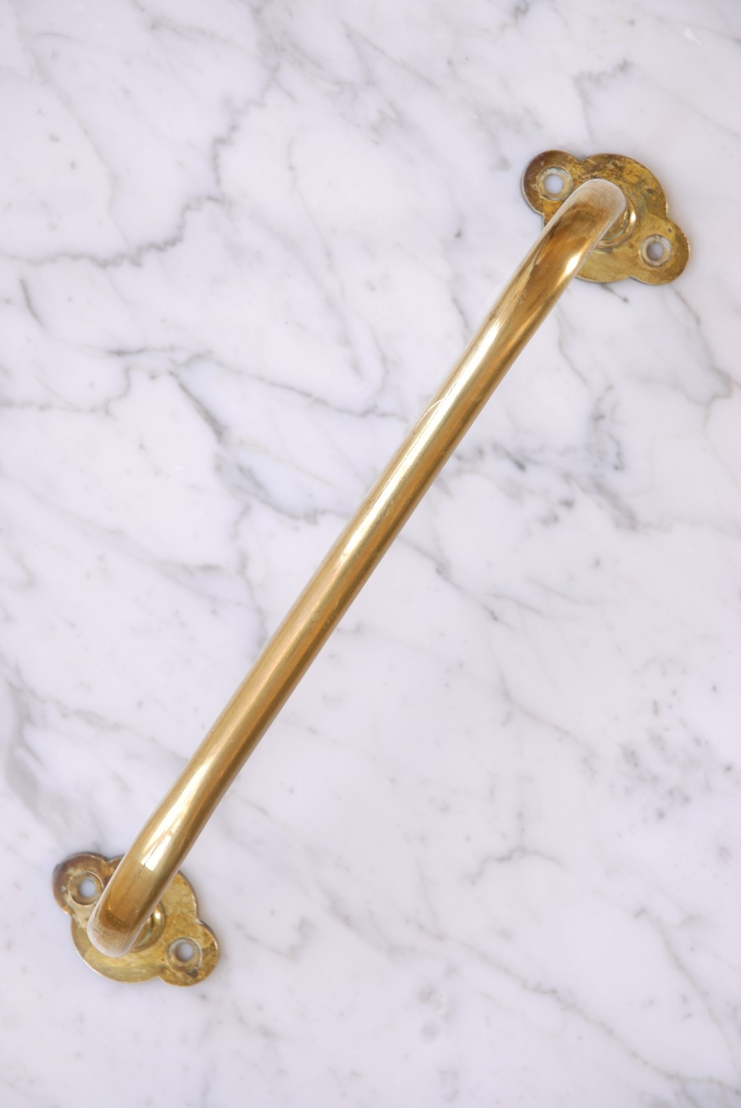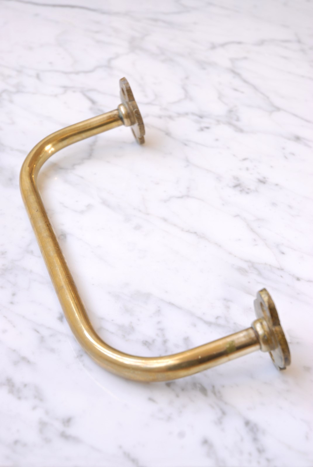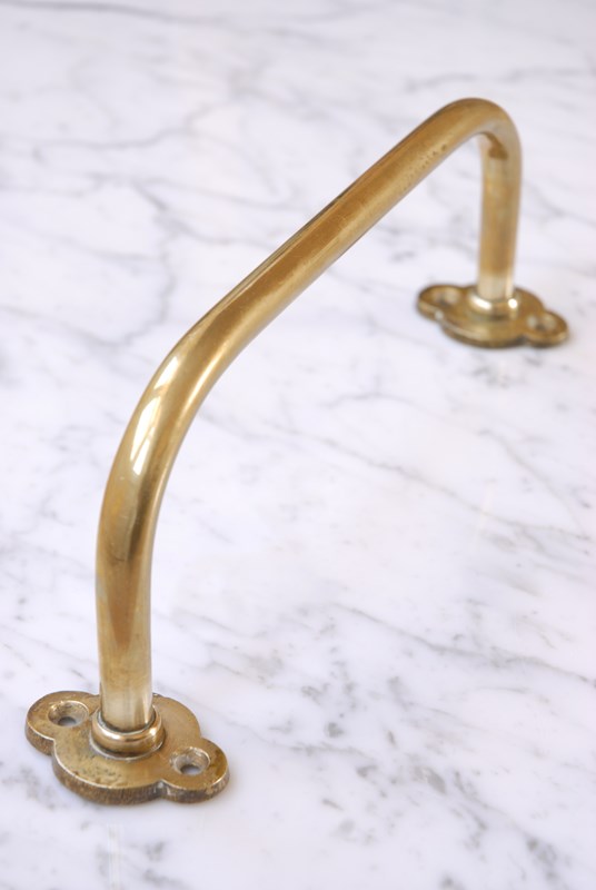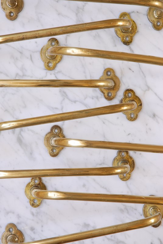 These antique brass towel rails originated from a church, where they are used on the end of pews to support umbrellas. They make a perfect hand towel rail for a bathroom or kitchen. Each cast brass qua-trefoil back plate has two recessed screw holes for installation. The size and projection is ideal to hang a hand towel. The price is for one towel bar, I currently have three available to purchase.