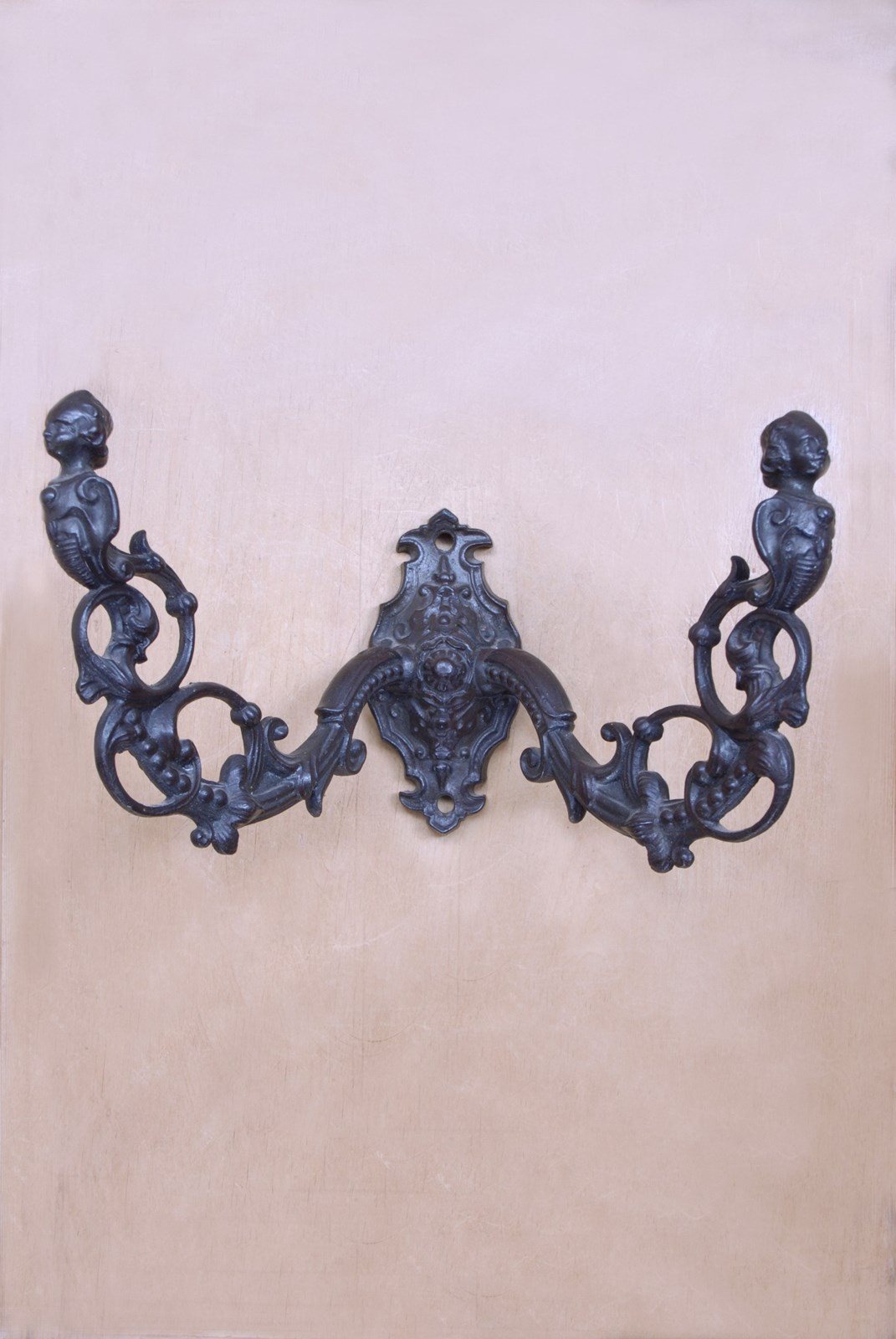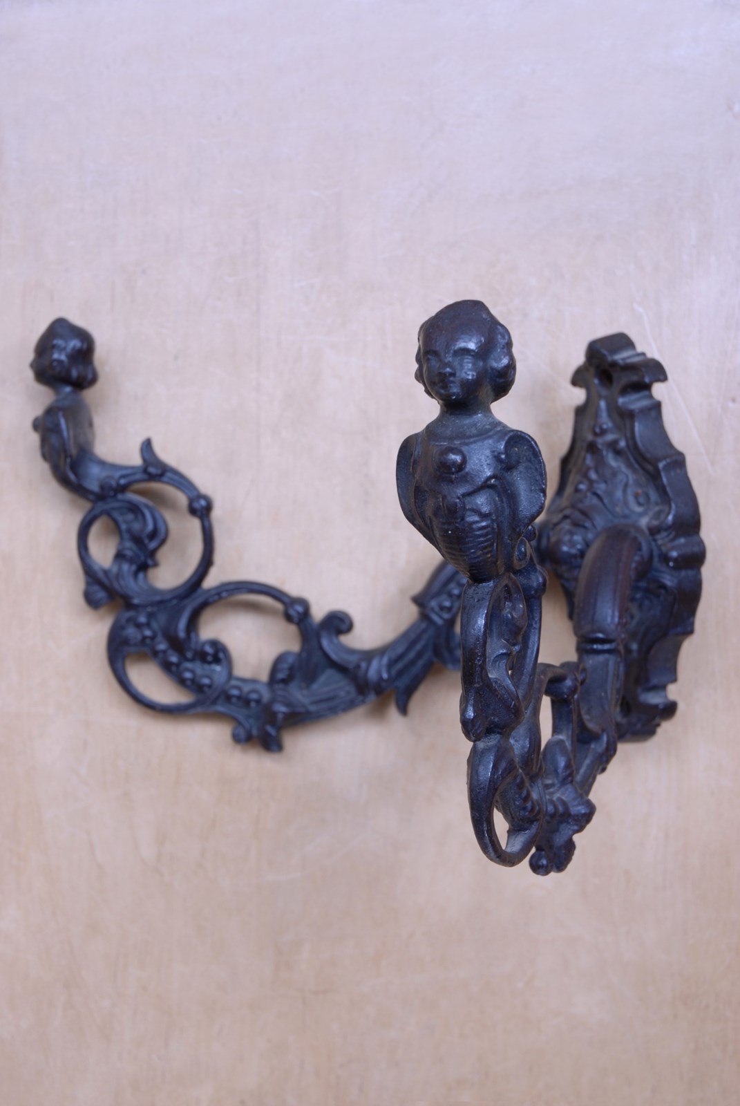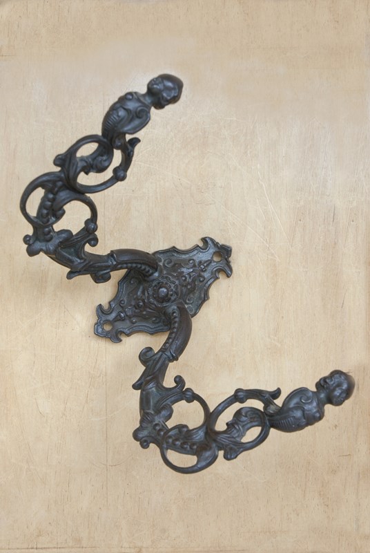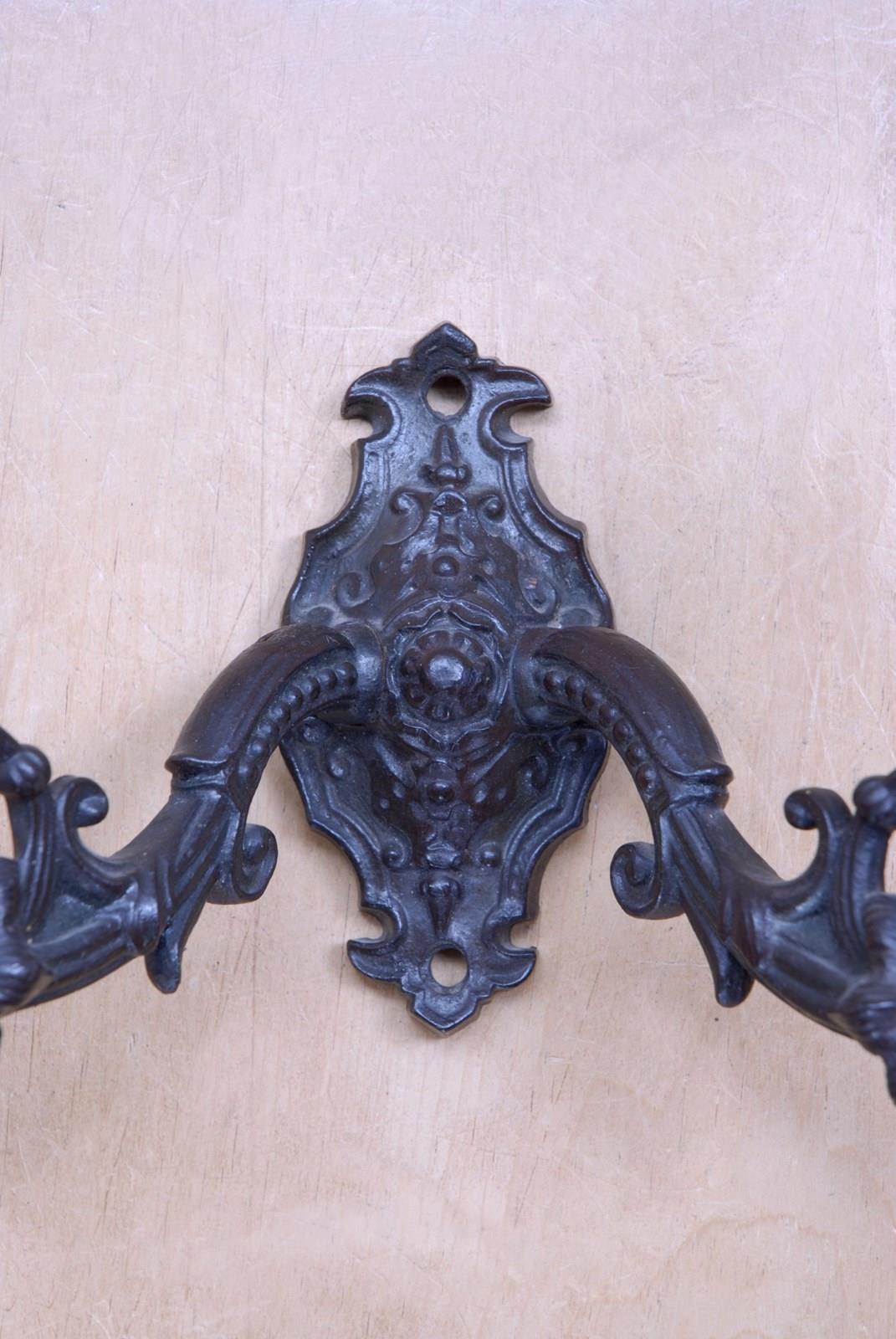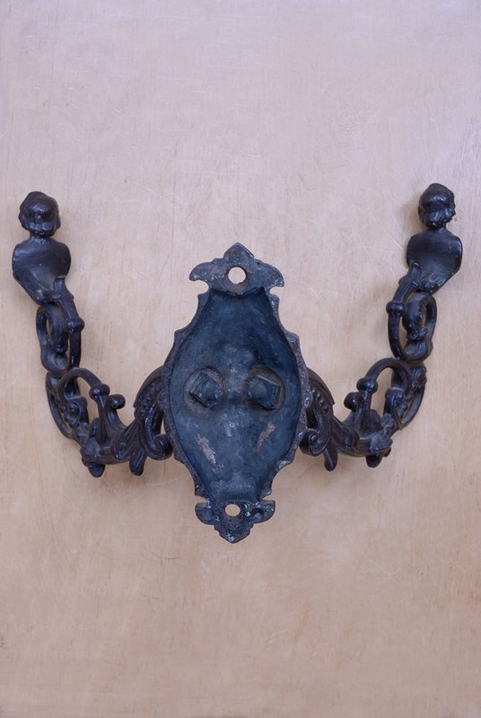 Quality, original large French double coat hook in cast iron. This antique coat hook dates from the 1800's. Highly decorative, with scroll work foliate arms and the figure of a lady to each prong. The large size would easily hang several coats, there are two recessed screw holes to the backplate for installation.