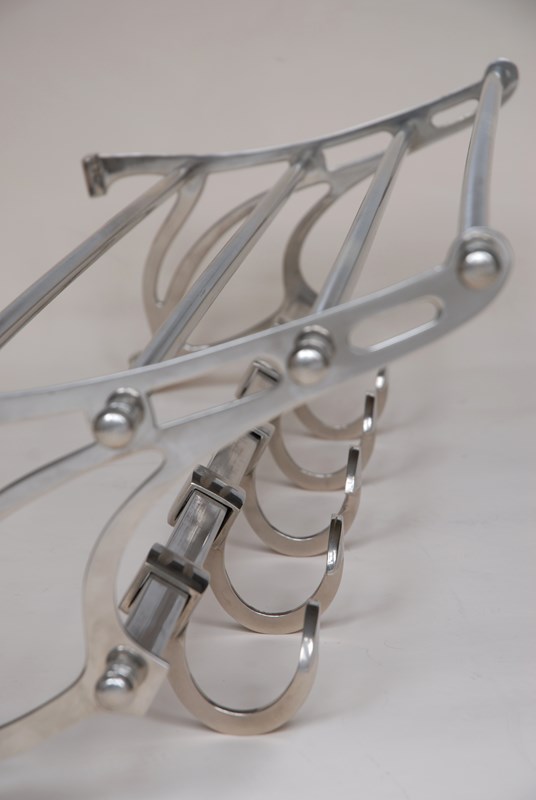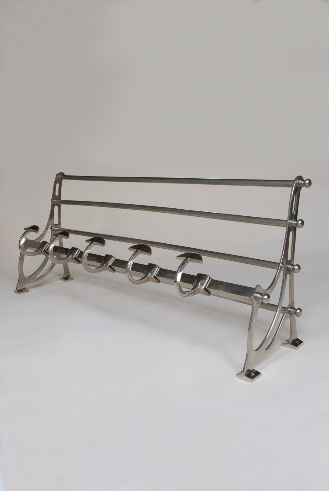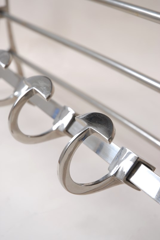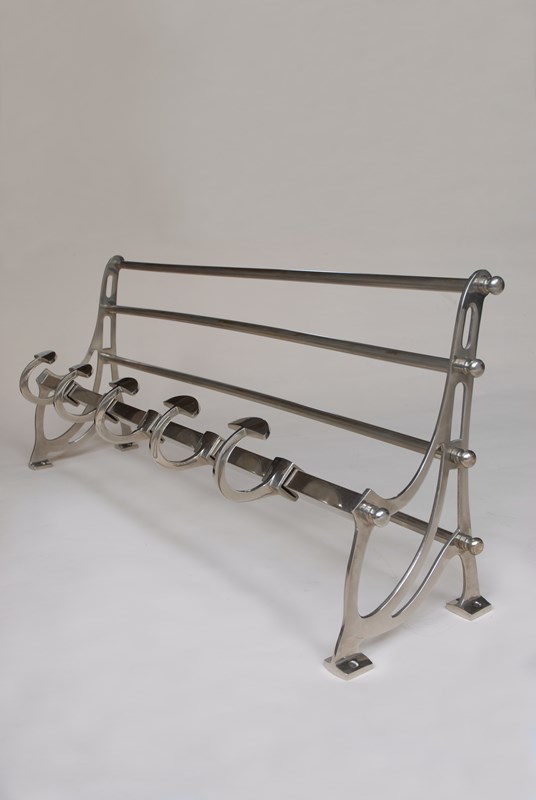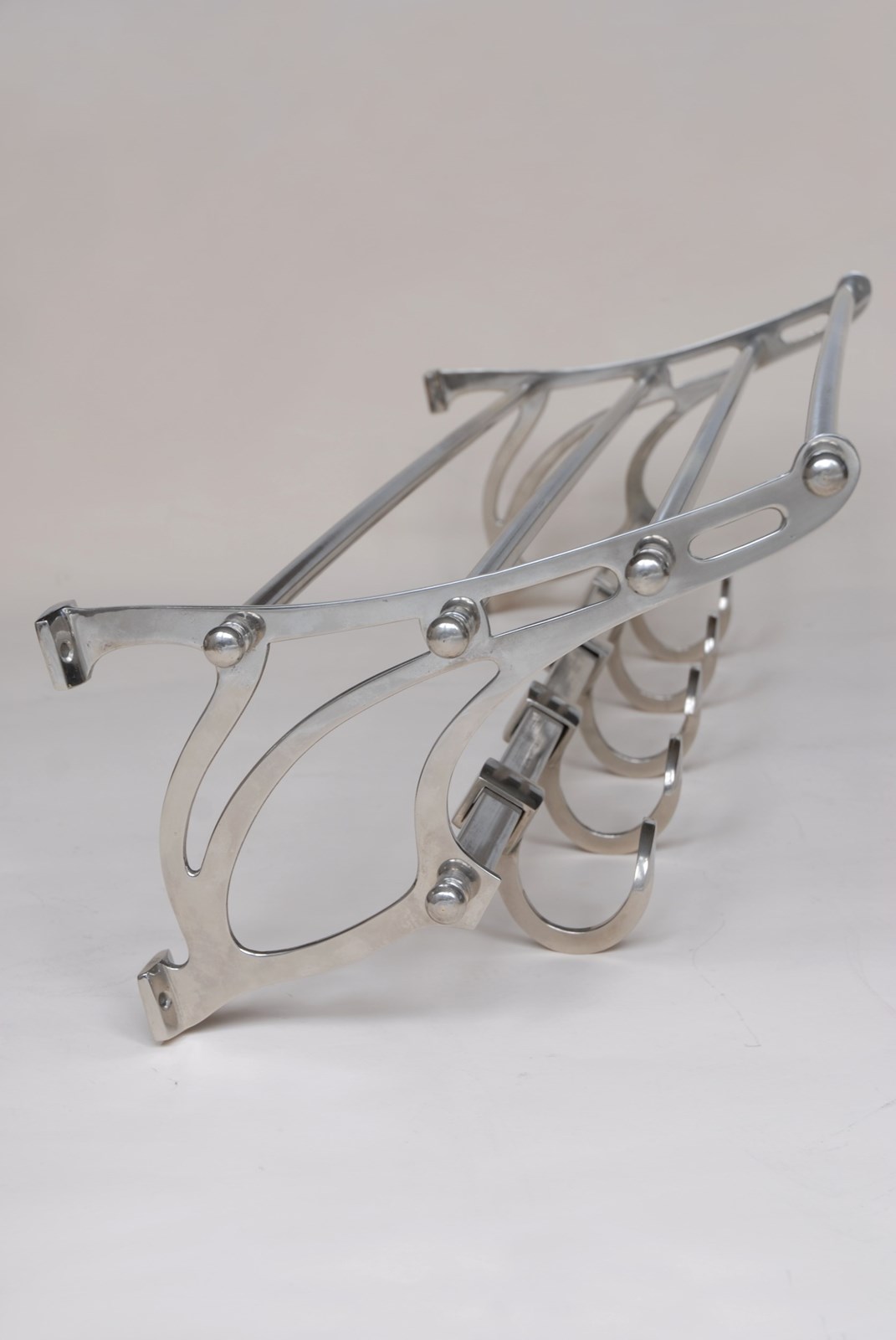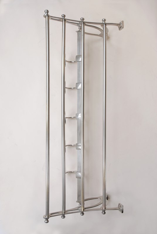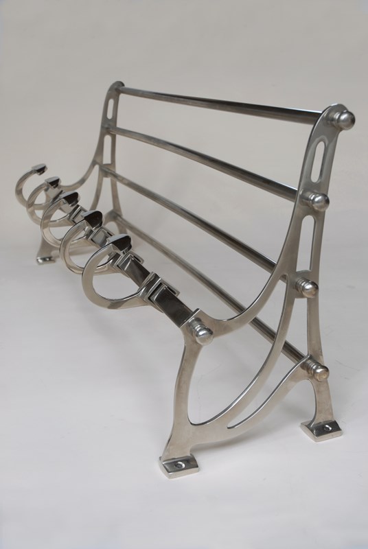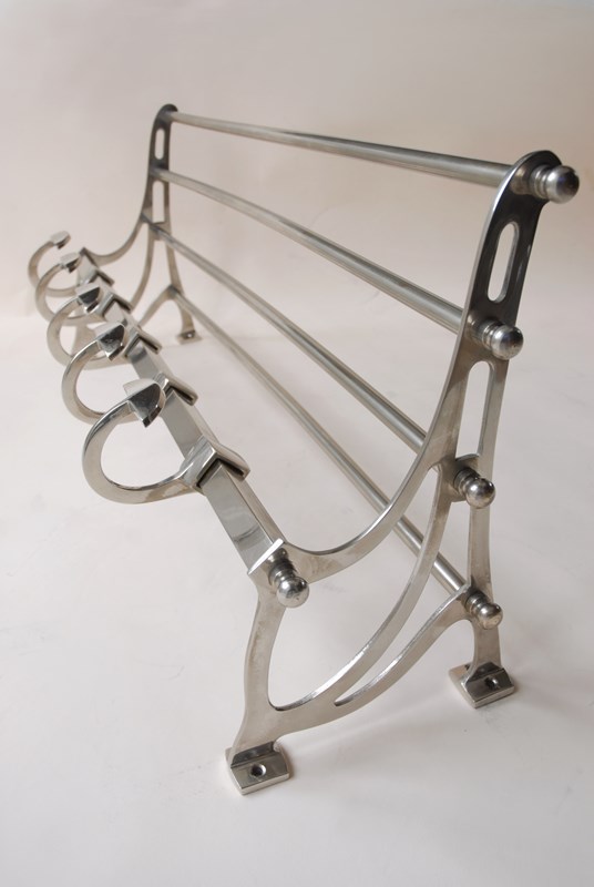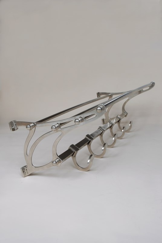 Description: Beautiful original Pullman luggage rack in nickel plated brass. This large luggage rack has five cast hooks on the bottom rail and plenty of space on top for bags and accessories. Excellent quality and weight to the piece. Great functional item for a hallway or boot room.