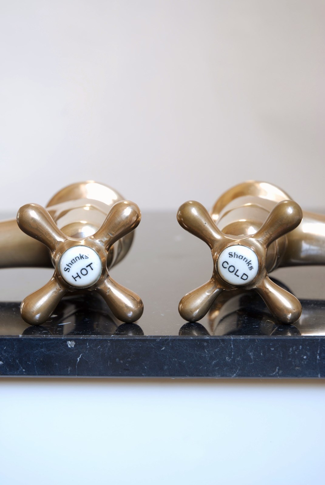 Original Shanks vintage bath taps. Large scale, which would make an impressive focal point in a bathroom. The brass has a warm antique patina and the ceramic indices have the makers name printed. Designed to be deck mounted or added to brass standpipes, I can quote on supplying bespoke brass standpipes if required.
