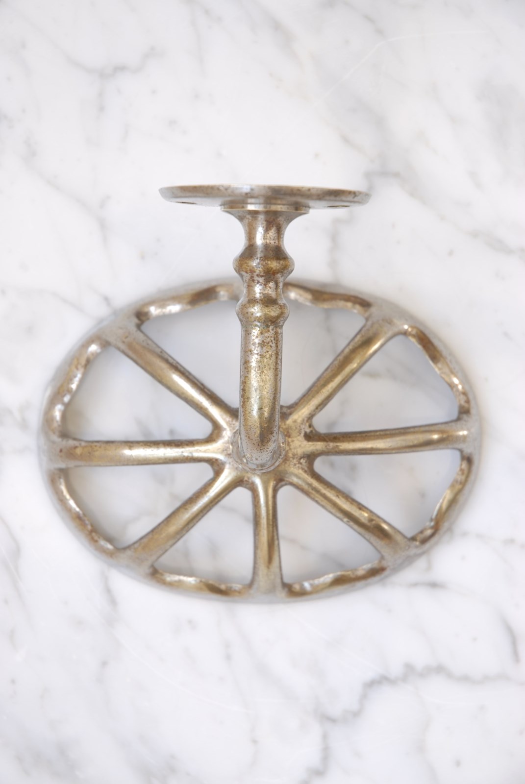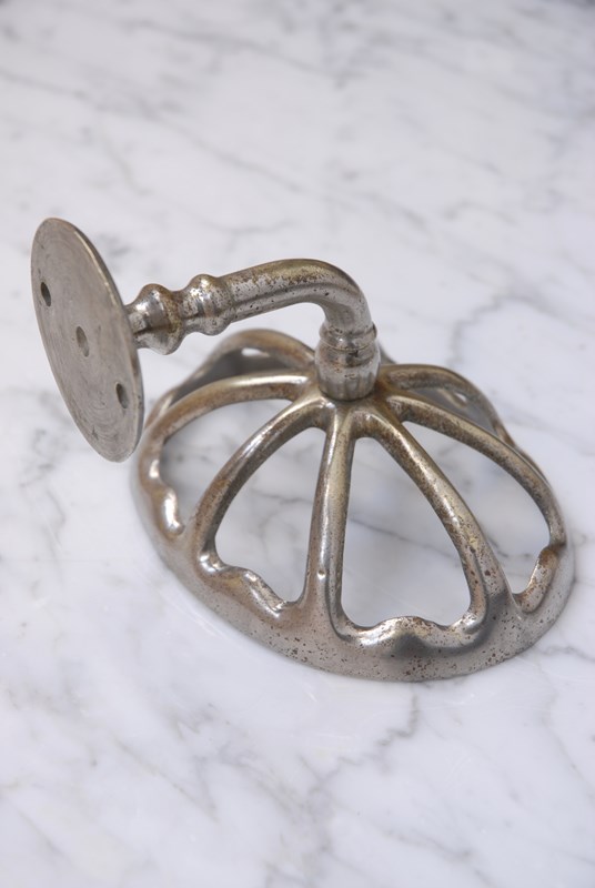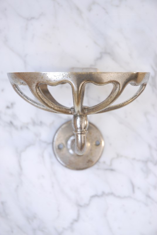 Description: Original vintage cast nickel brass soap holder. Named butterfly wing dish, due to the cut out shapes that resemble a butterflies wing. The size is designed to easily accommodate a soap, when mounted to the wall. Perfectly suited to a bathroom or kitchen setting.
