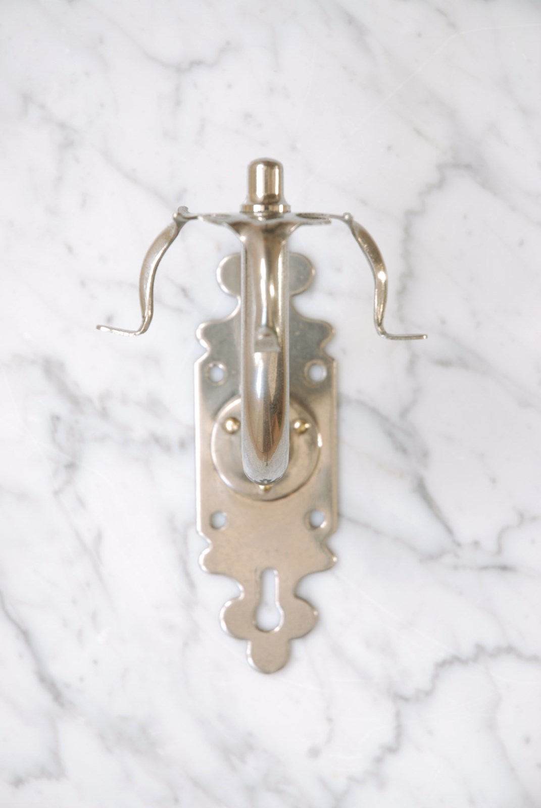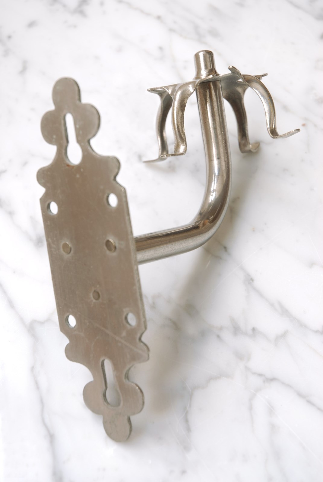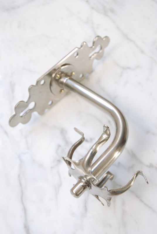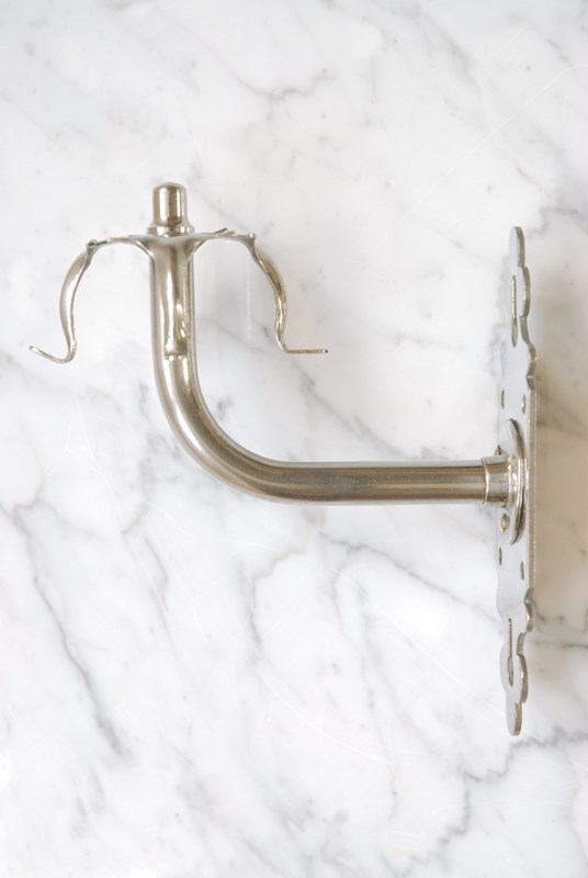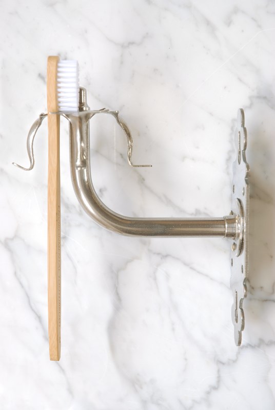 Description: Wonderful quality antique razor or toothbrush holder. Made of solid brass with its original nickel plate finish. With four hooks to the piece its also perfect to hang your washcloths on. The back plate is shaped in a classic, timeless style and has six holes for screws to enable it to be easily wall mounted. Sourced in Southern France, this piece would look great positioned next to a basin in a bathroom.