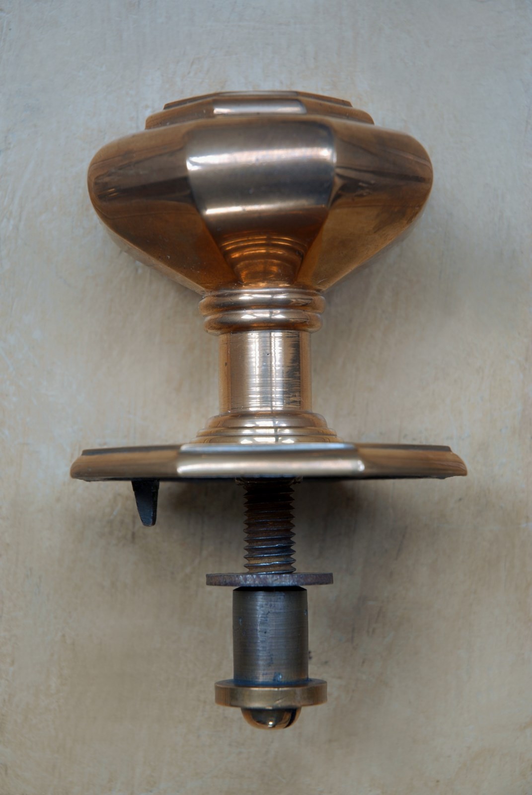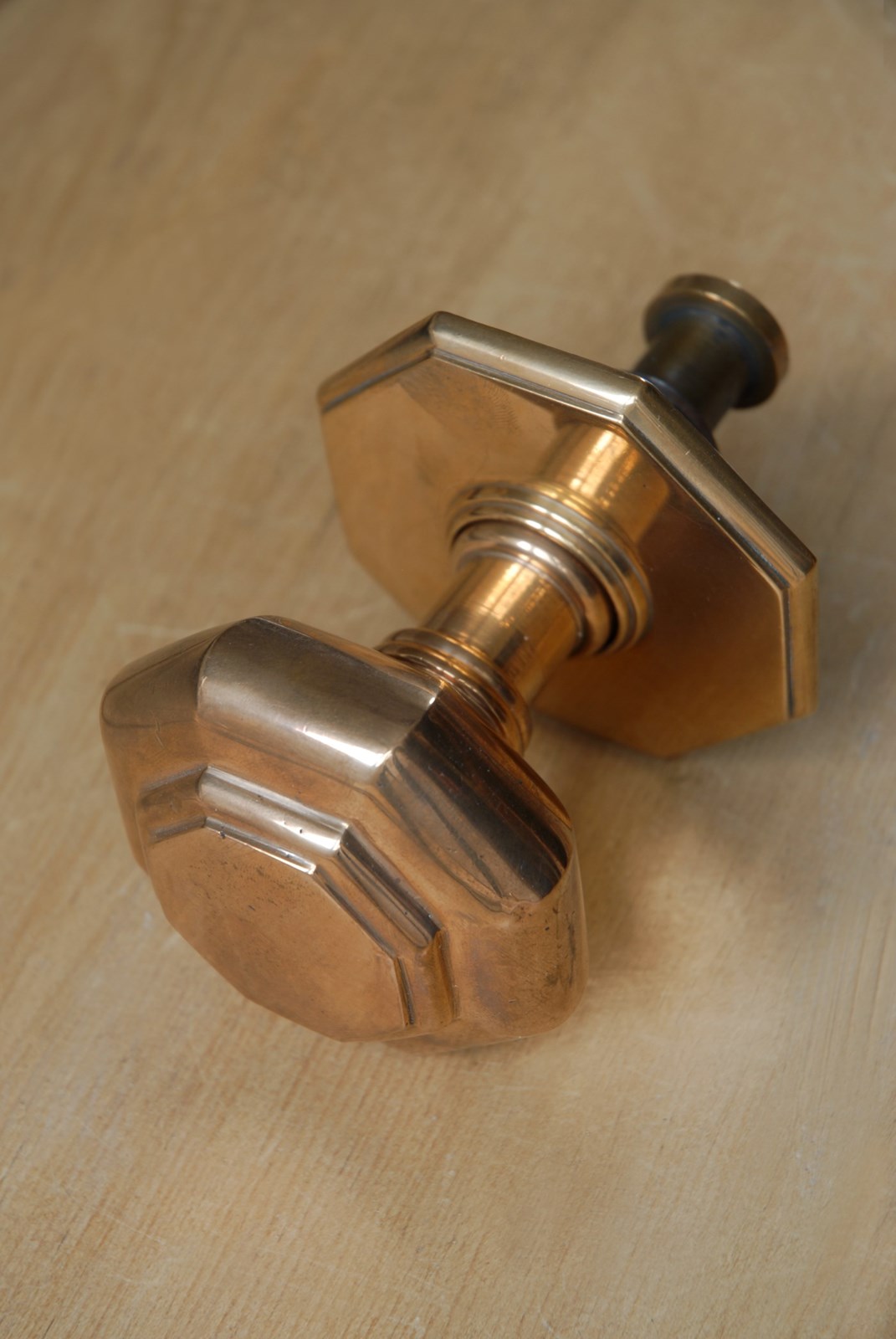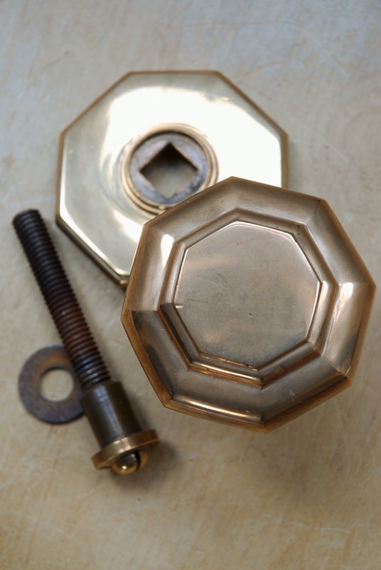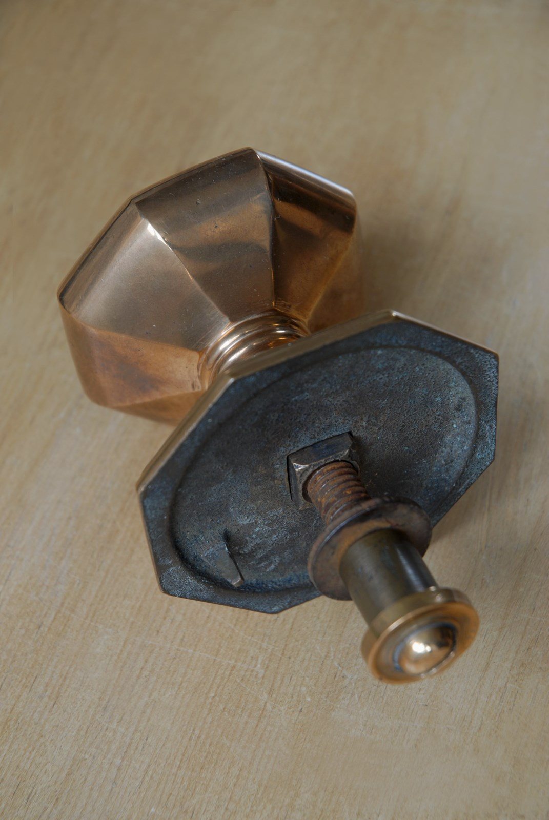 Description: Classic and timeless vintage front door pull. In a warm, solid cast brass with a good weight, this door knob has an octagonal handle and backplate. Originally manufactured by the UK in the 1940’s.