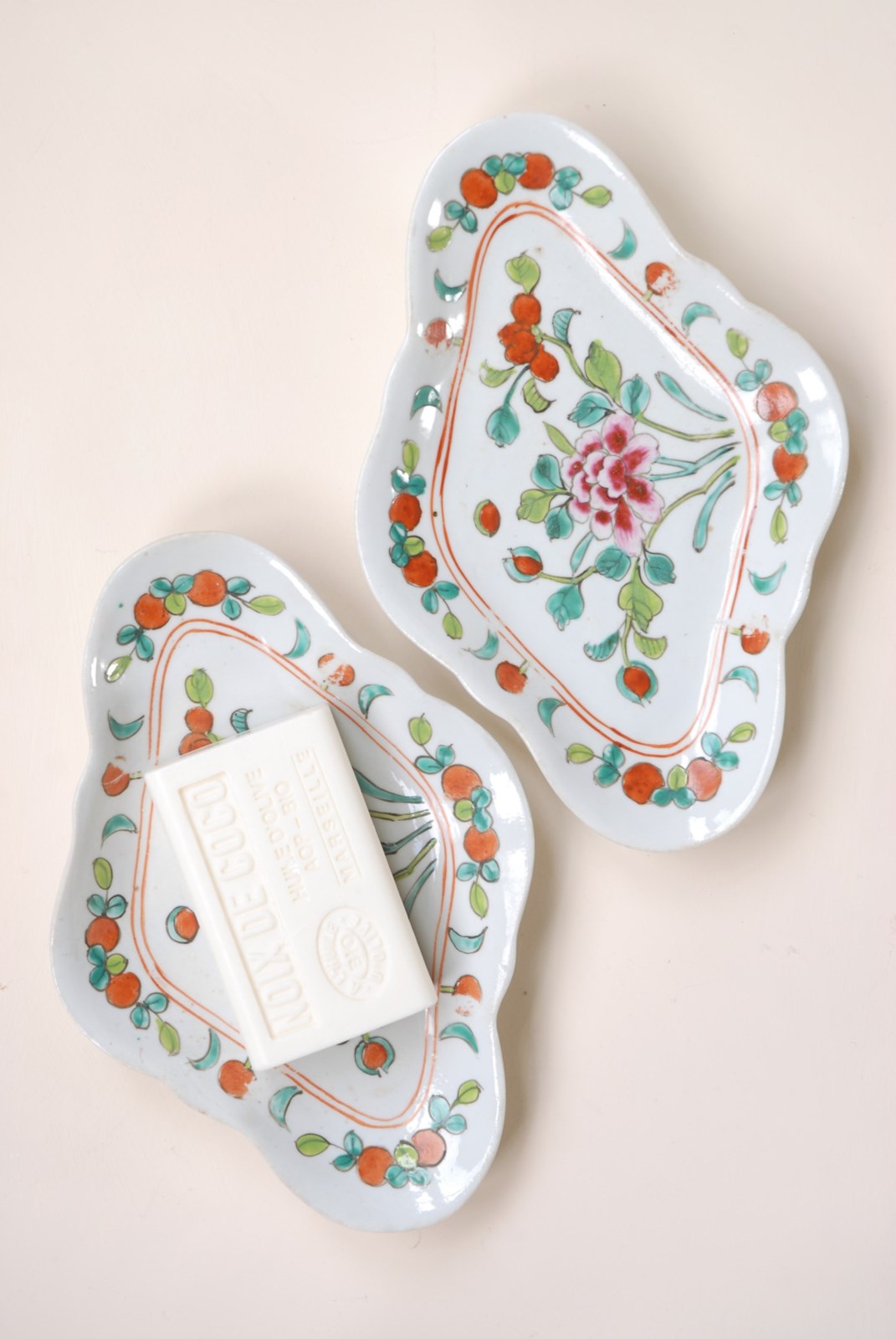 Description: Original Chinese porcelain soap dish. With painted foliage and chrysanthemum flowers. Perfectly suited to a bathroom or kitchen setting. I currently have two identical ones available to purchase, this price is for one single dish.