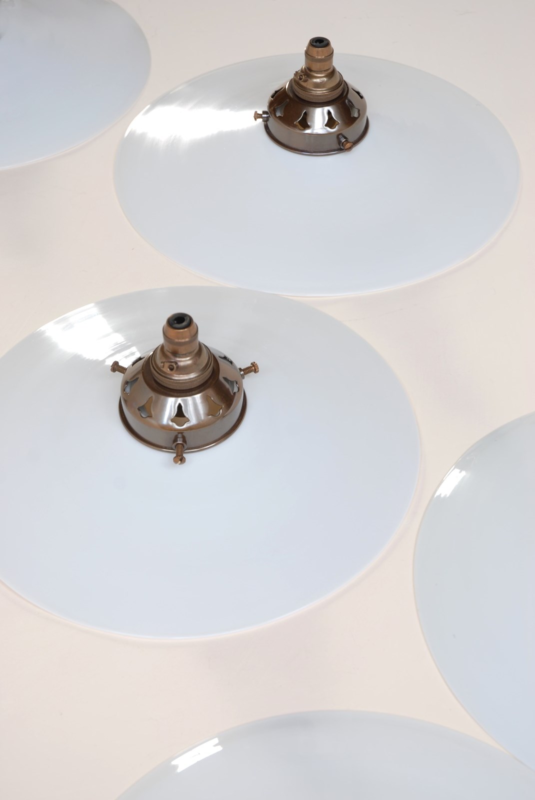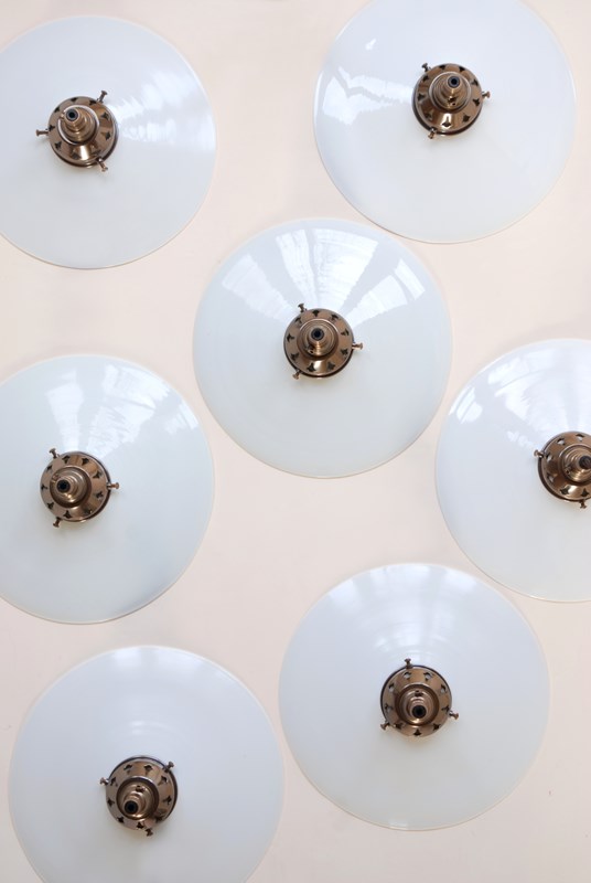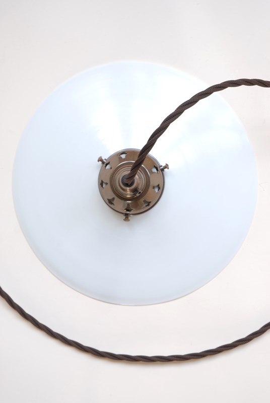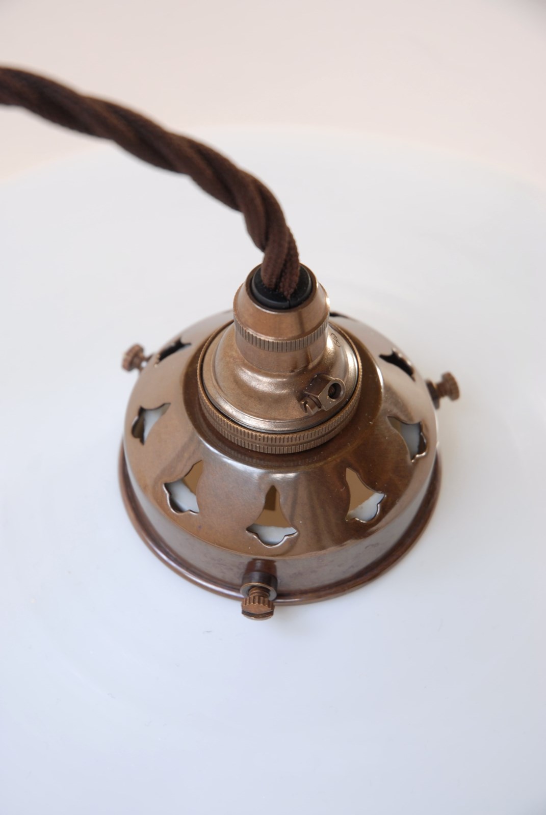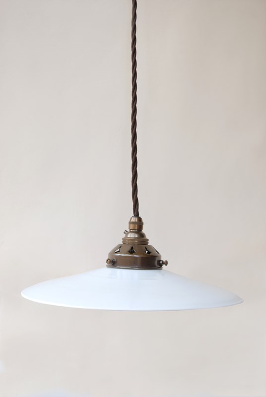 Condition: All opaline glass is in excellent condition. Just one shade has some tiny marks to the inside from the original manufacturing, this will be the last one that I sell. Each pendant is supplied with an antique brass gallery and light bulb housing, which has been manufactured in the UK and will come with a separate one metre length of twisted flex cord. Please email should you require a longer length.