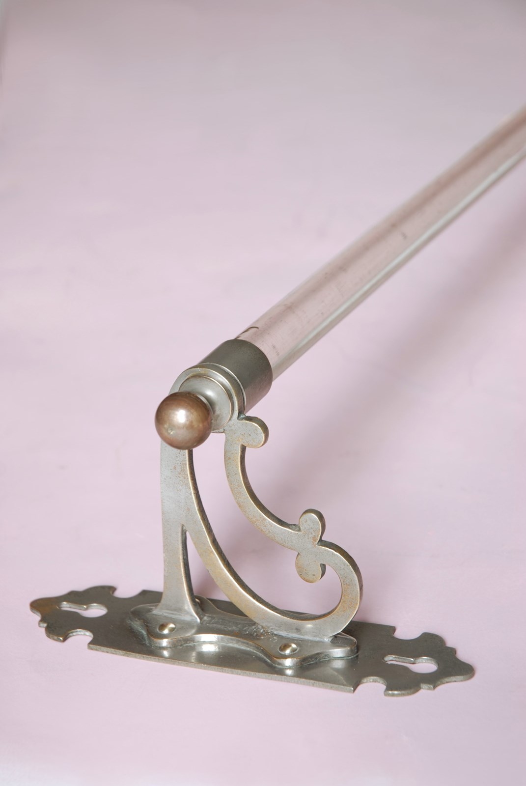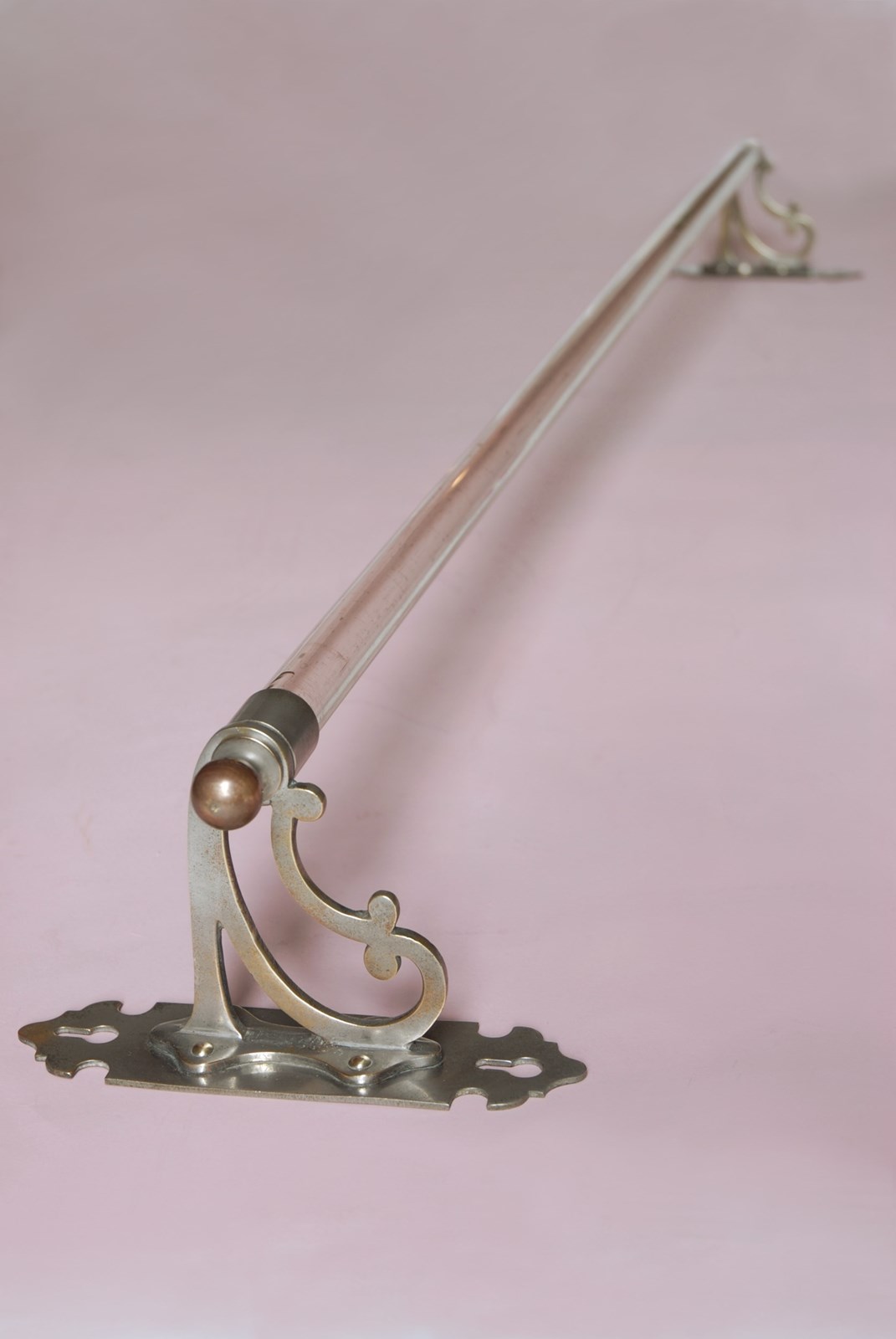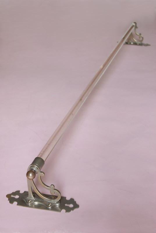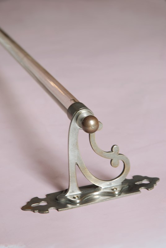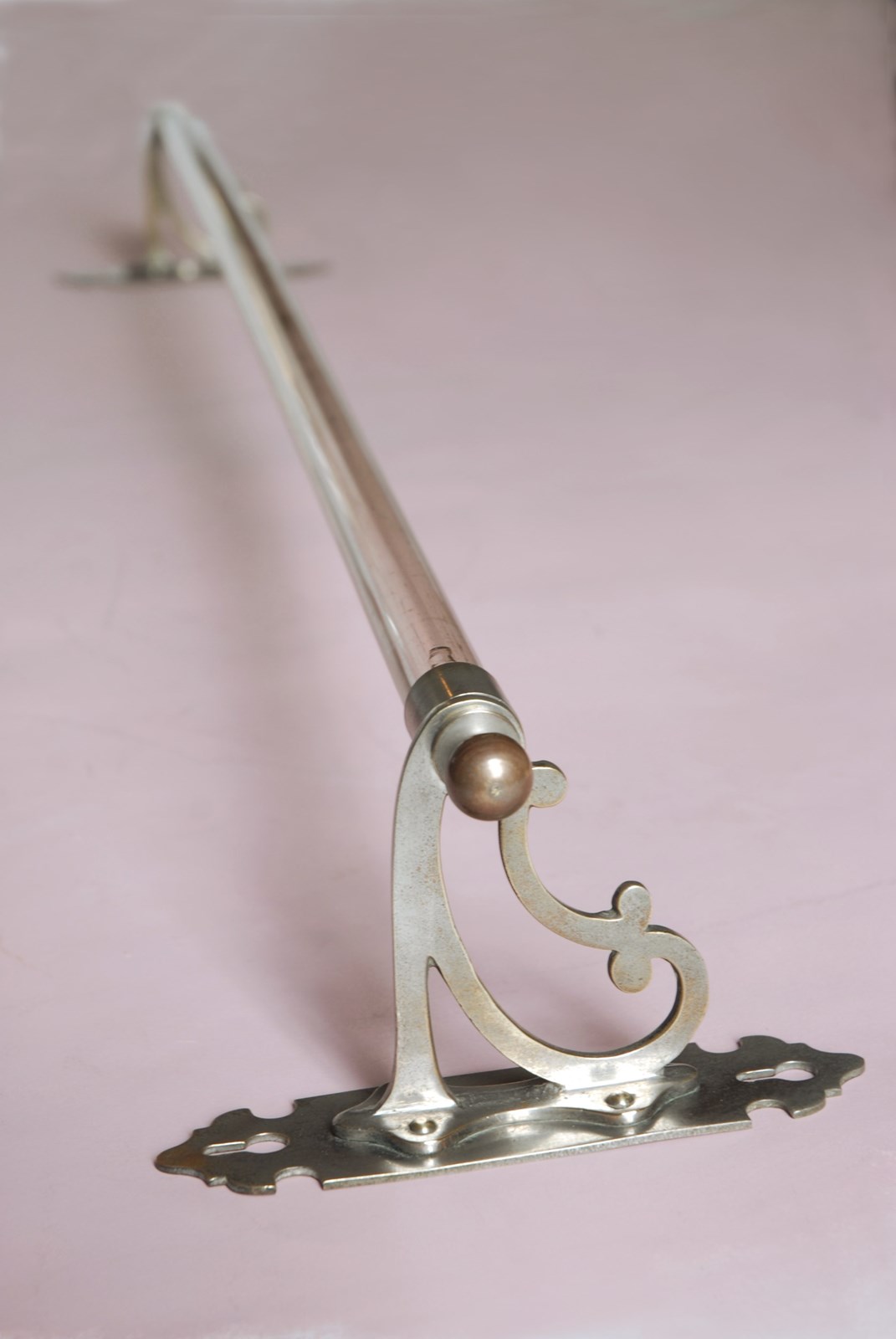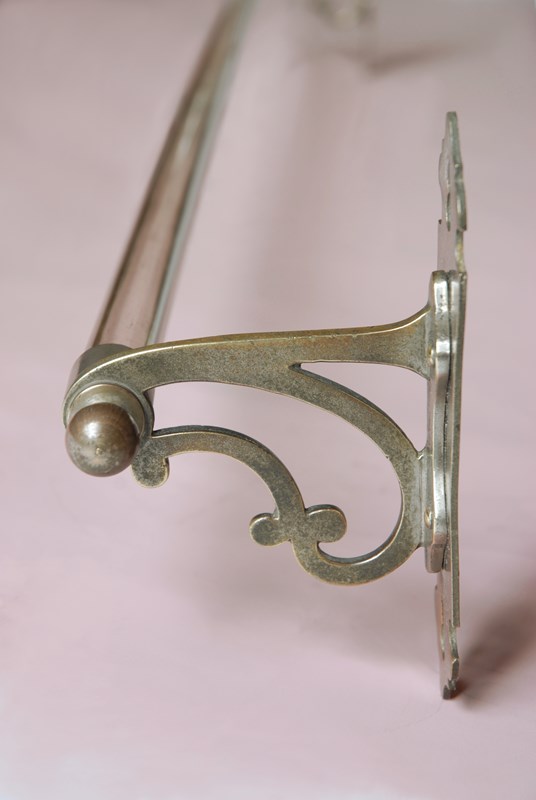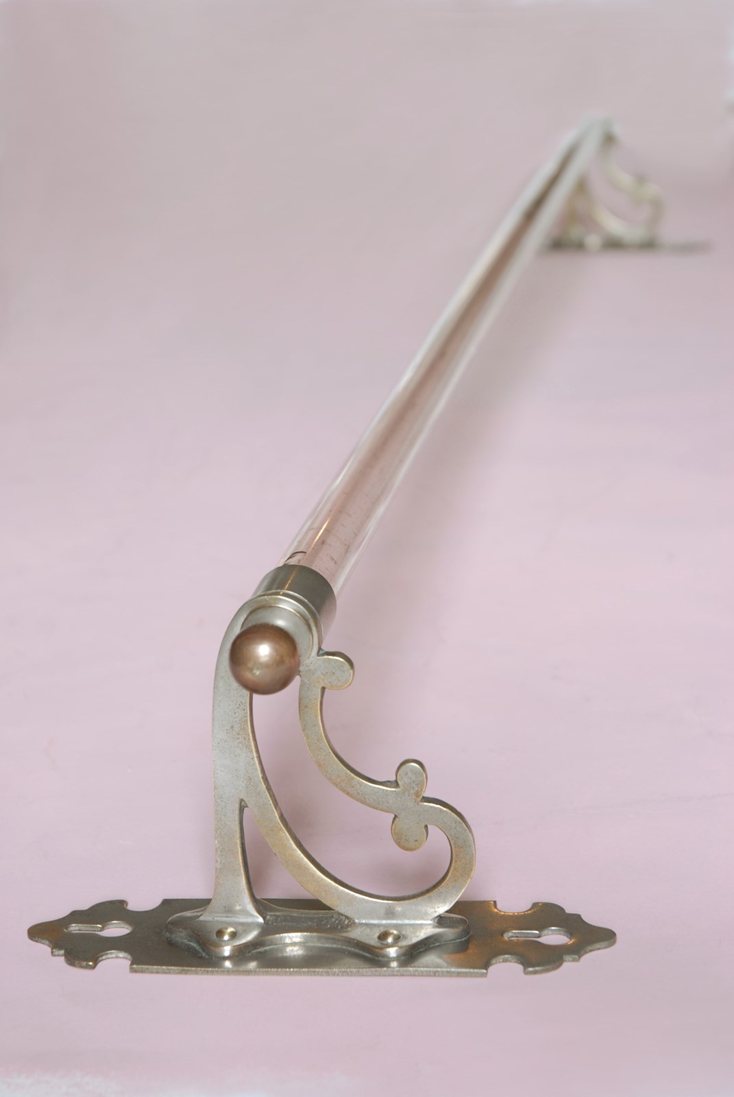 Description: Antique French long towel rail. Complete with its original glass bar this piece dates from the early 1900’s. Beautifully shaped mounts in solid brass with gently worn nickel plating. I’ve not come across one as long before, would easily hold two towels side by side. Each back plate has 2 holes for screws for wall mounting.
