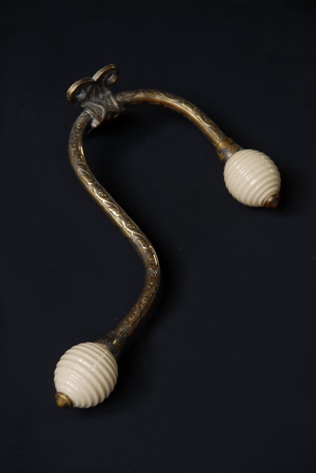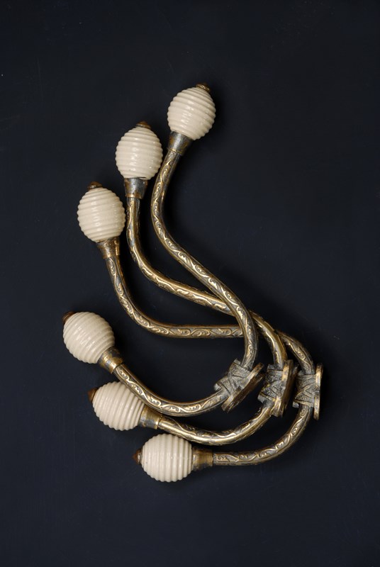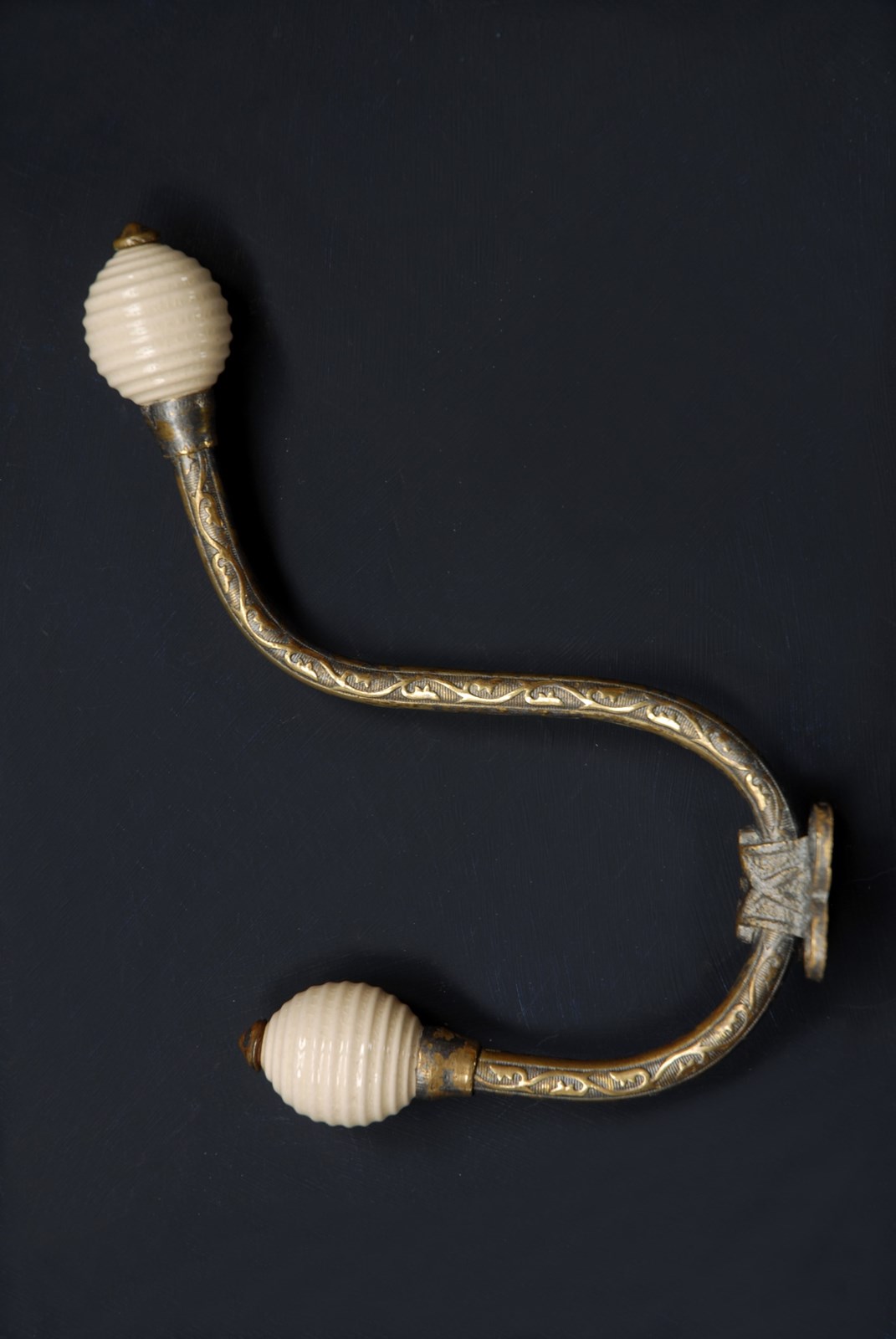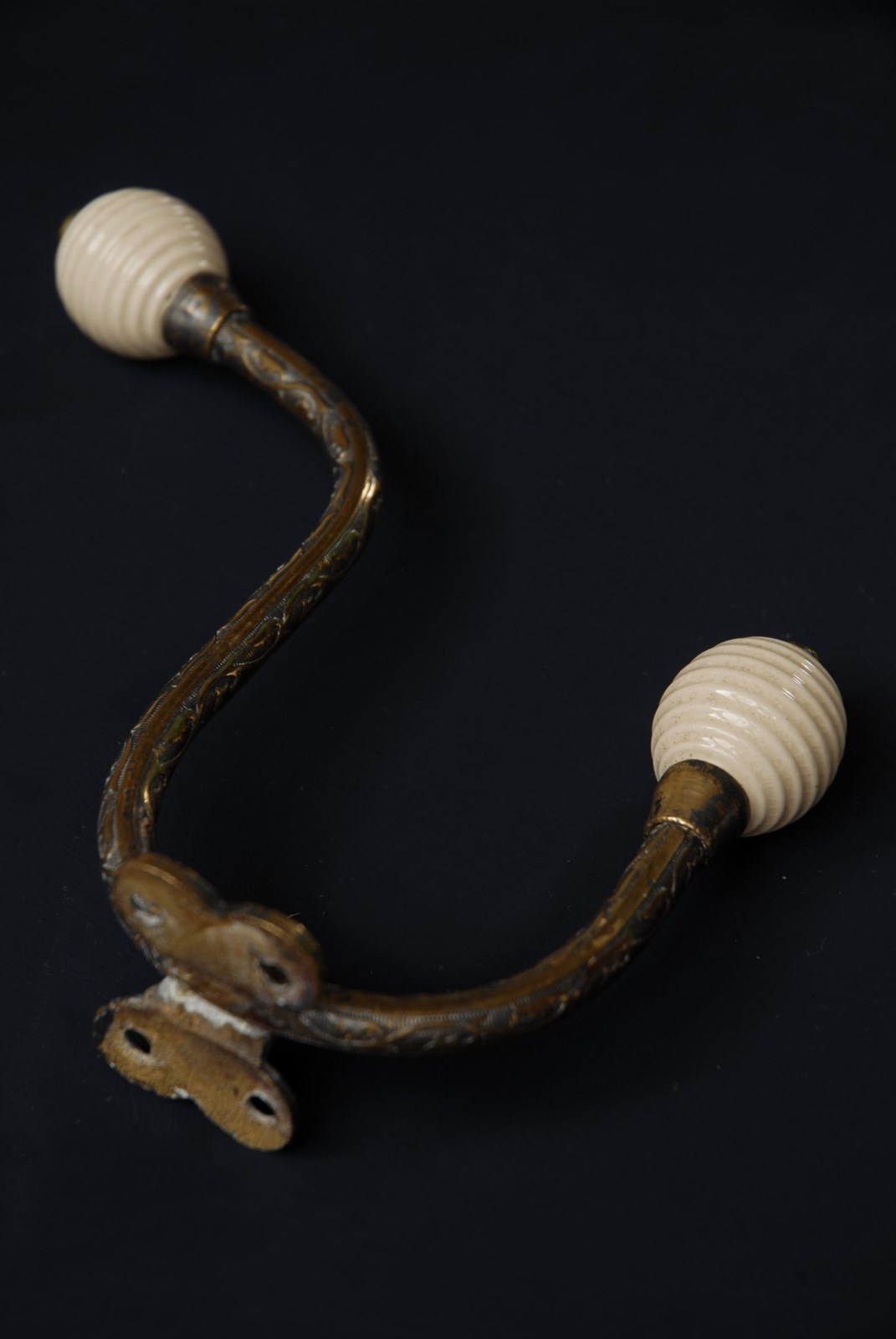 Description: An original antique Victorian double hook. With decorative chased stems, ending in two ceramic ribbed beehive finials. These examples date to the 1880’s, the back plate has four recessed screw holes for installation. The price is for one single hook, I currently have three available to purchase.
