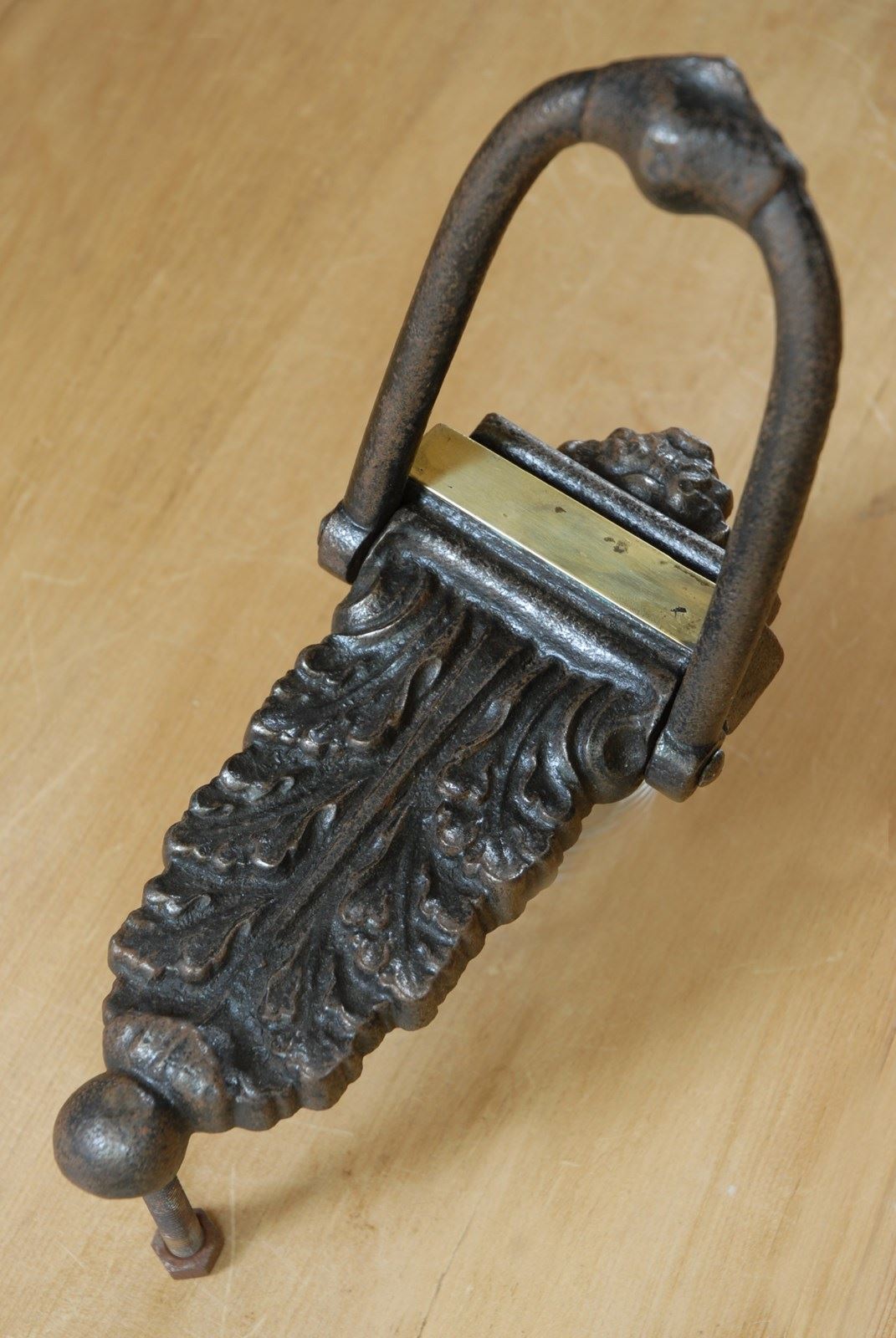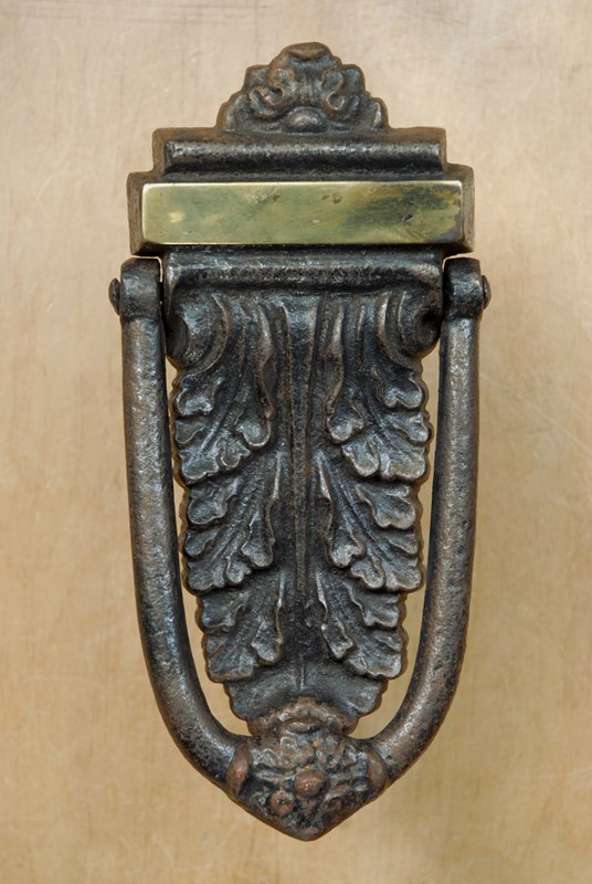 Quality antique cast iron door knocker. Super detail of an acanthus leaf with a brass cartouche. Dating from the 1800’s this door knocker is the perfect size for a Victorian or Georgian front door. The brass cartouche were designed to have the occupiers name engraved, they look equally smart left plain.