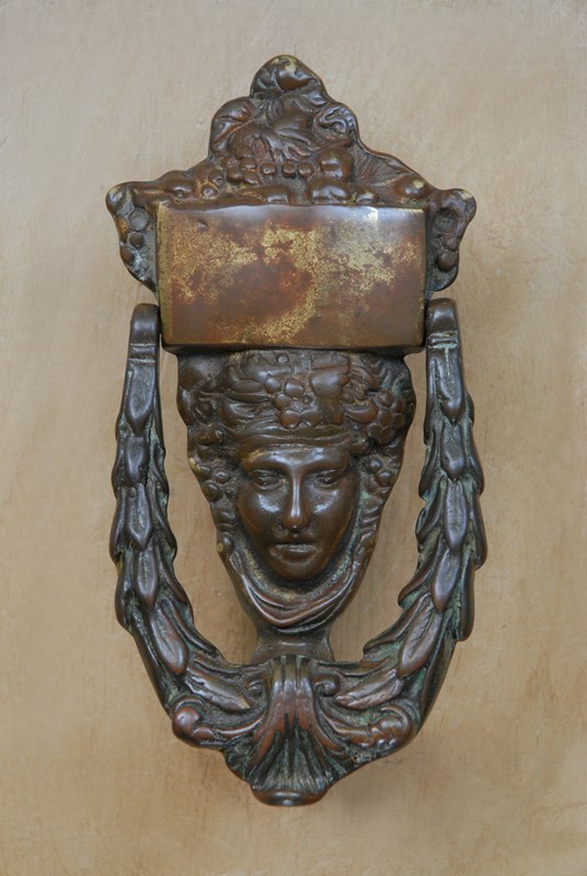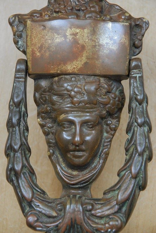 An original quality Victorian door knocker. This classic Dionysus door knocker is cast in brass and takes the form of a Grecian face. Gentle age and wonderful patina to the brass.