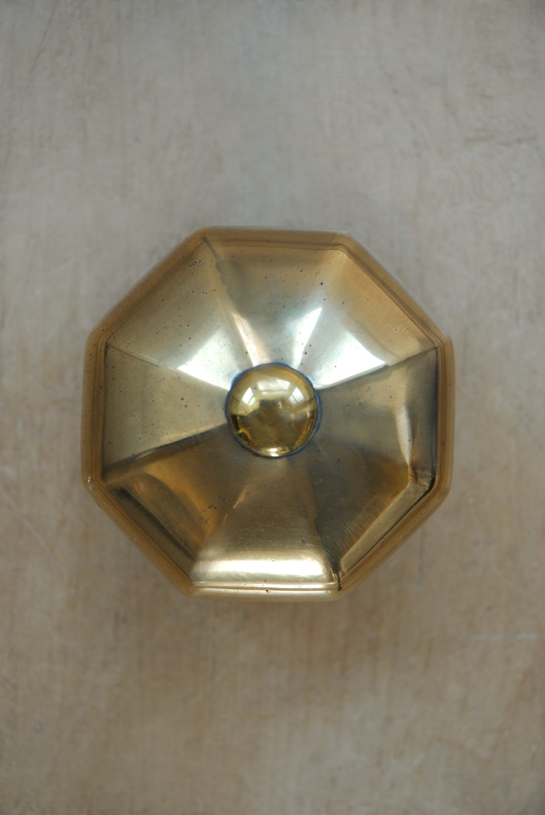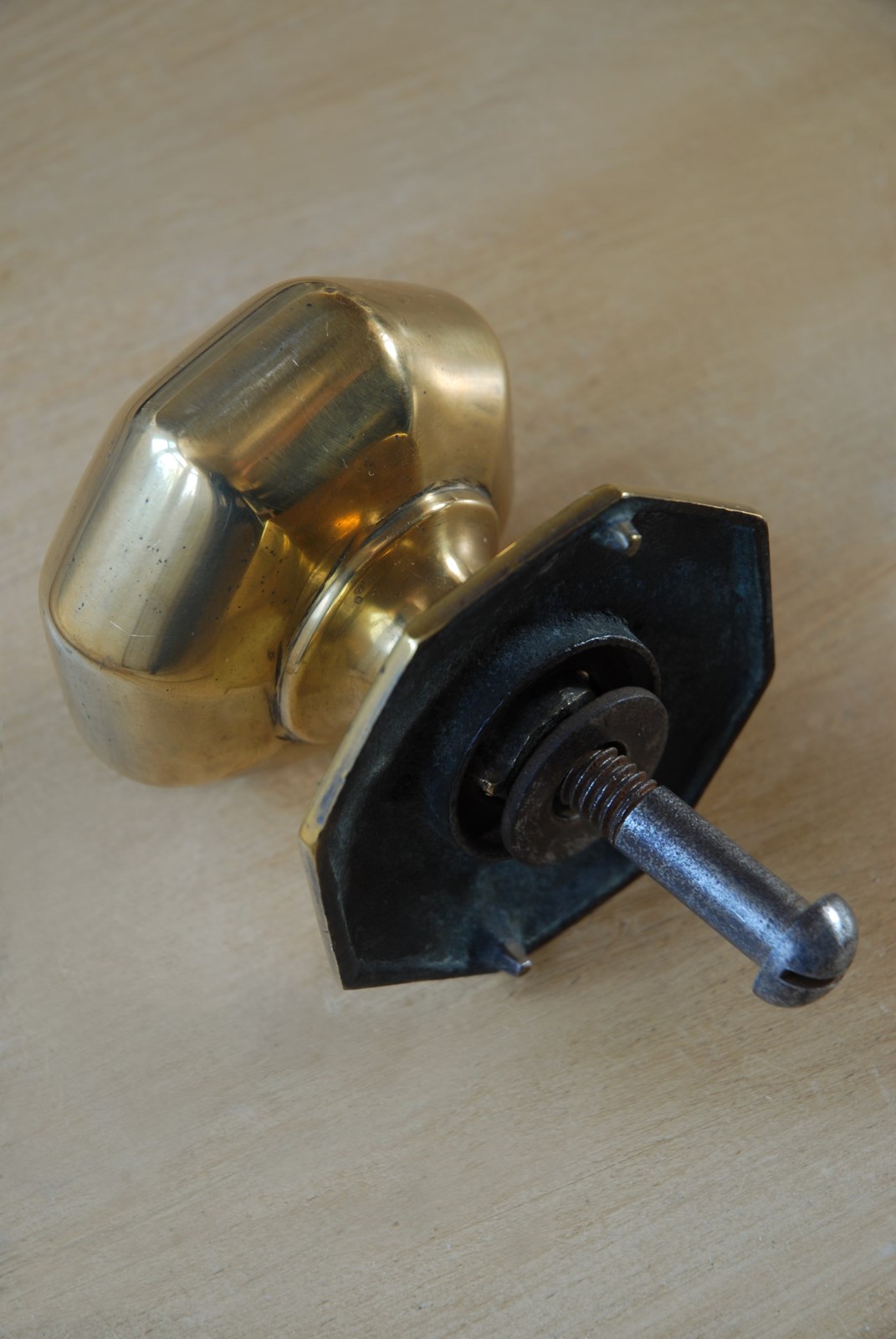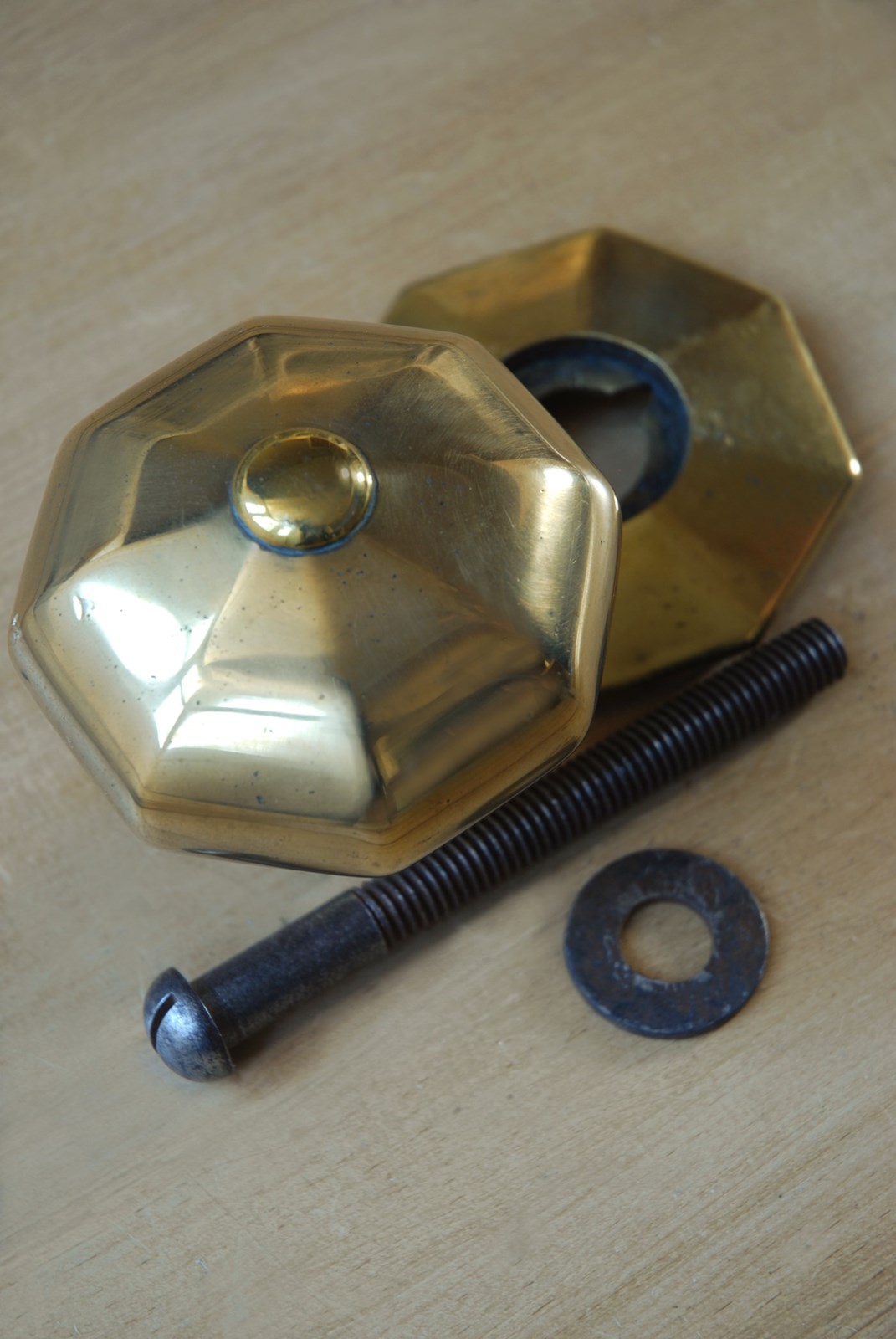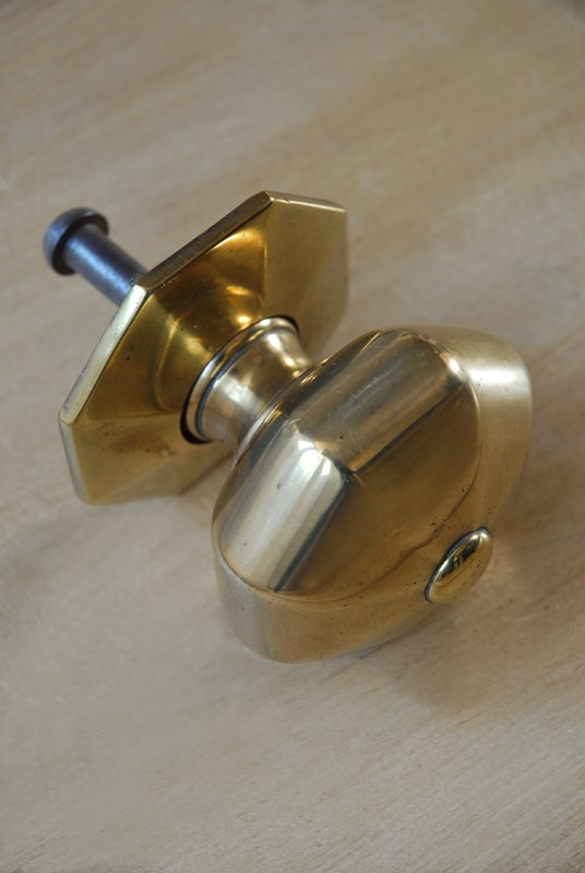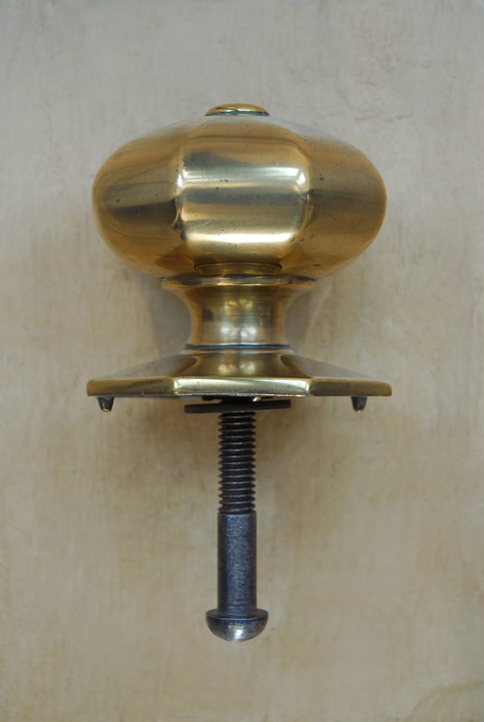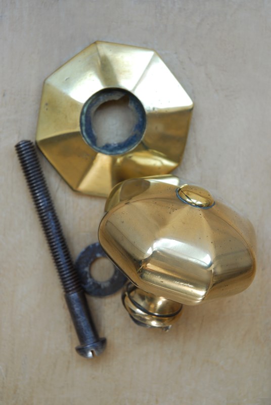 Description: Classic, timeless original antique front door pull. This door knob has an octagonal handle and backplate. Lovely warm golden shade to the solid cast brass. Complete with its original threaded back bolt, suitable for all standard door thicknesses.