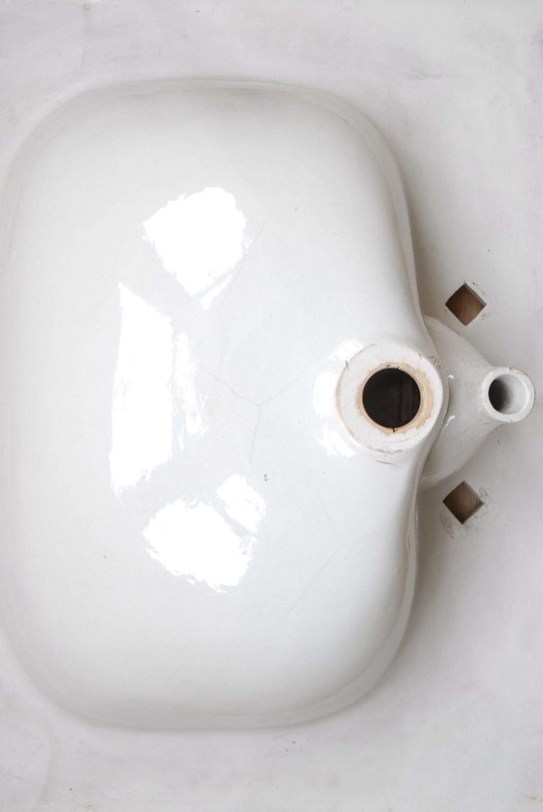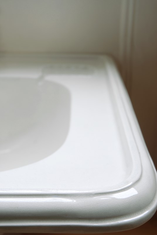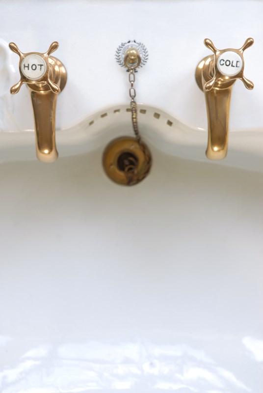 Condition: Excellent. The basin and brass accessories are refurbished and are all ready for installation. A slight blemish to the glaze on the left side of basin, see photo 3. Slight hairline crackling under the glaze visible on the reverse. On very close inspection one tiny hairline crackling in the basin. The glaze and basin are fully water tight.