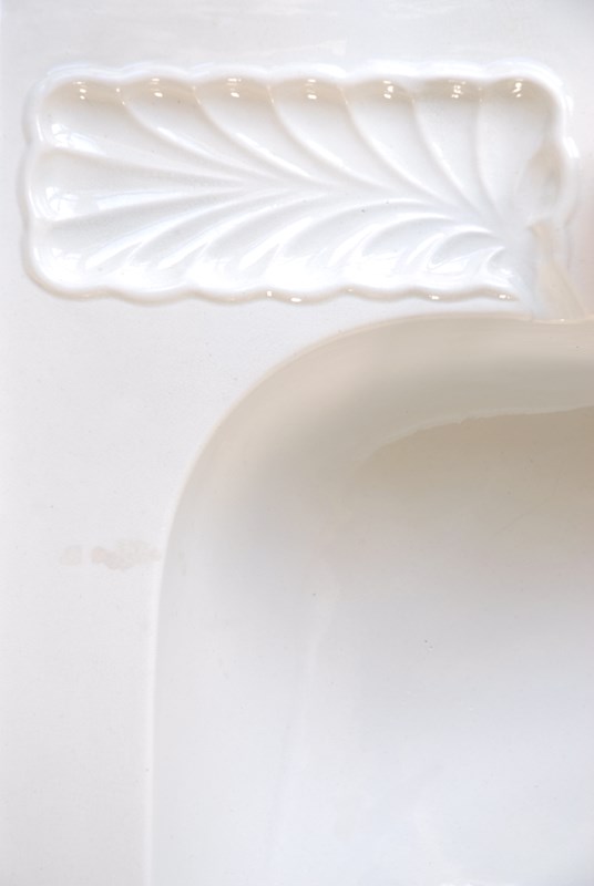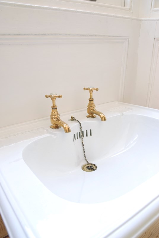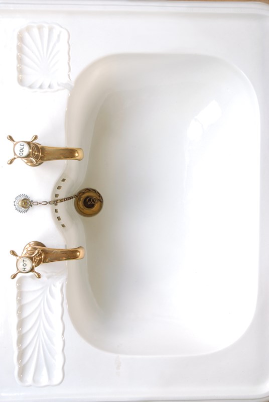 Stunning, original large Victorian ceramic wash basin with brass taps, drain and plug. Traditionally this basin would sit on a cast iron stand, however the shape means that it can also be fitted on a wooden unit, wash stand or piece of marble. The ceramic basin has the patent number printed around the plug chain pip which reads no.15493 . The brass taps are from the same Victorian period and complement the style. There are two scallop shaped recesses for soaps. The price includes wash basin, all brass accessories pictured and UK mainland delivery.