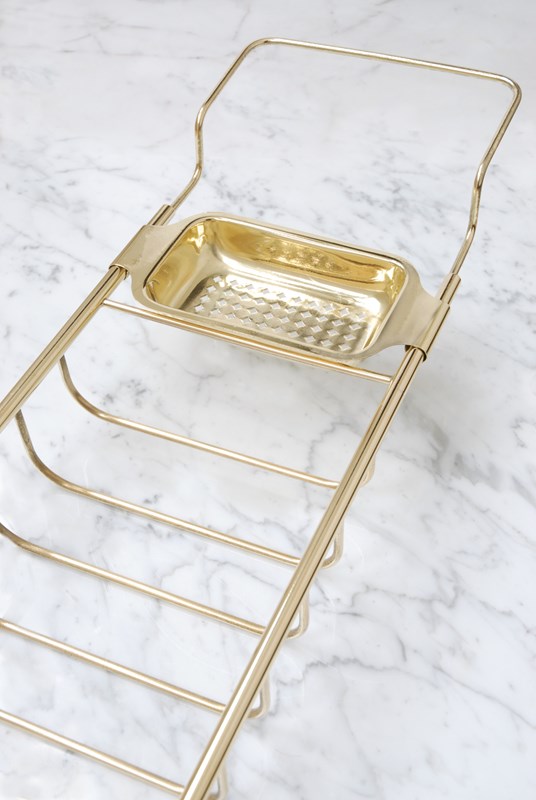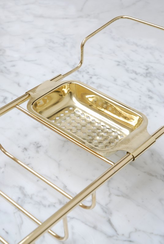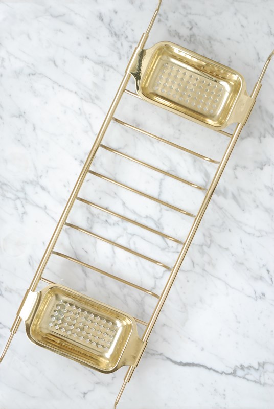 Description: A quality vintage brass bath bridge. An ideal finishing touch for a bathroom. Made up of three compartments to store soaps, brushes & wash cloths. The brass is a golden shade. The arms slide in and out making it adjustable to fit different bath widths.