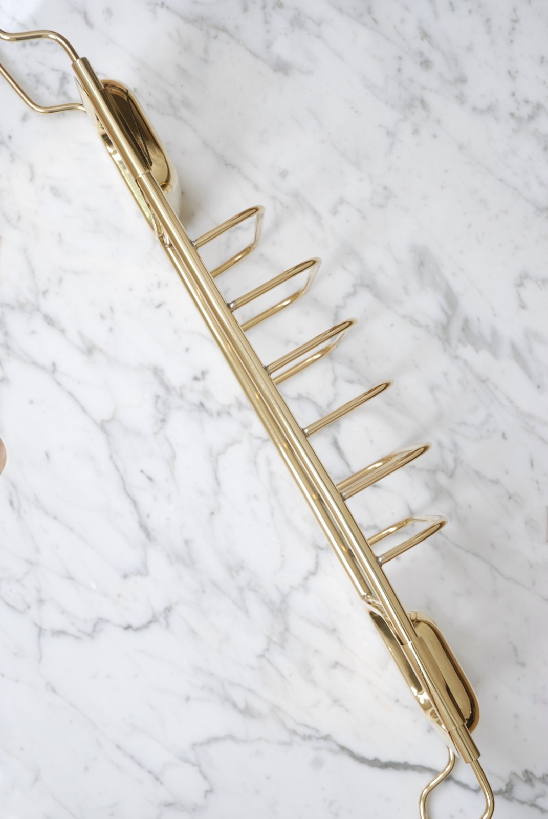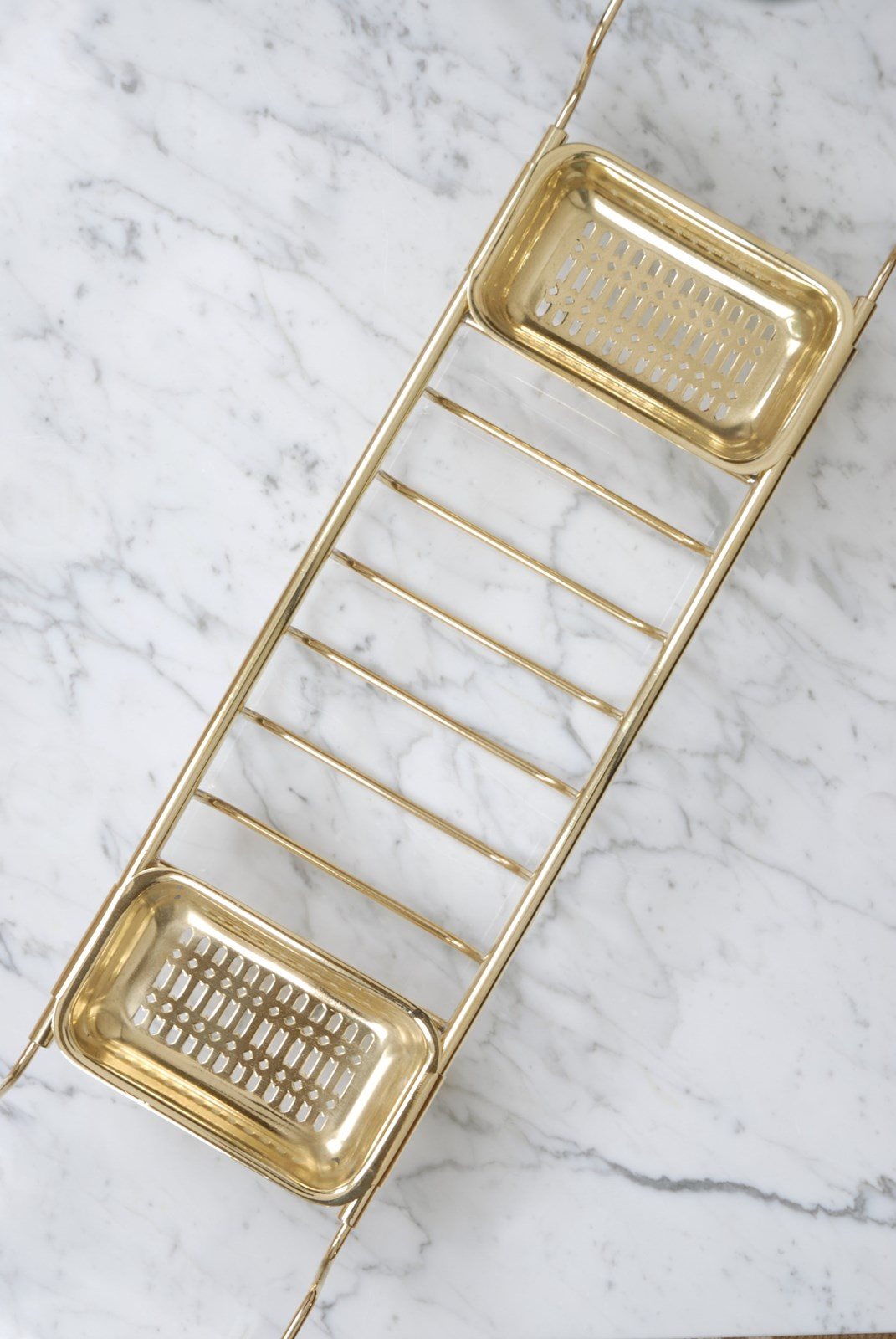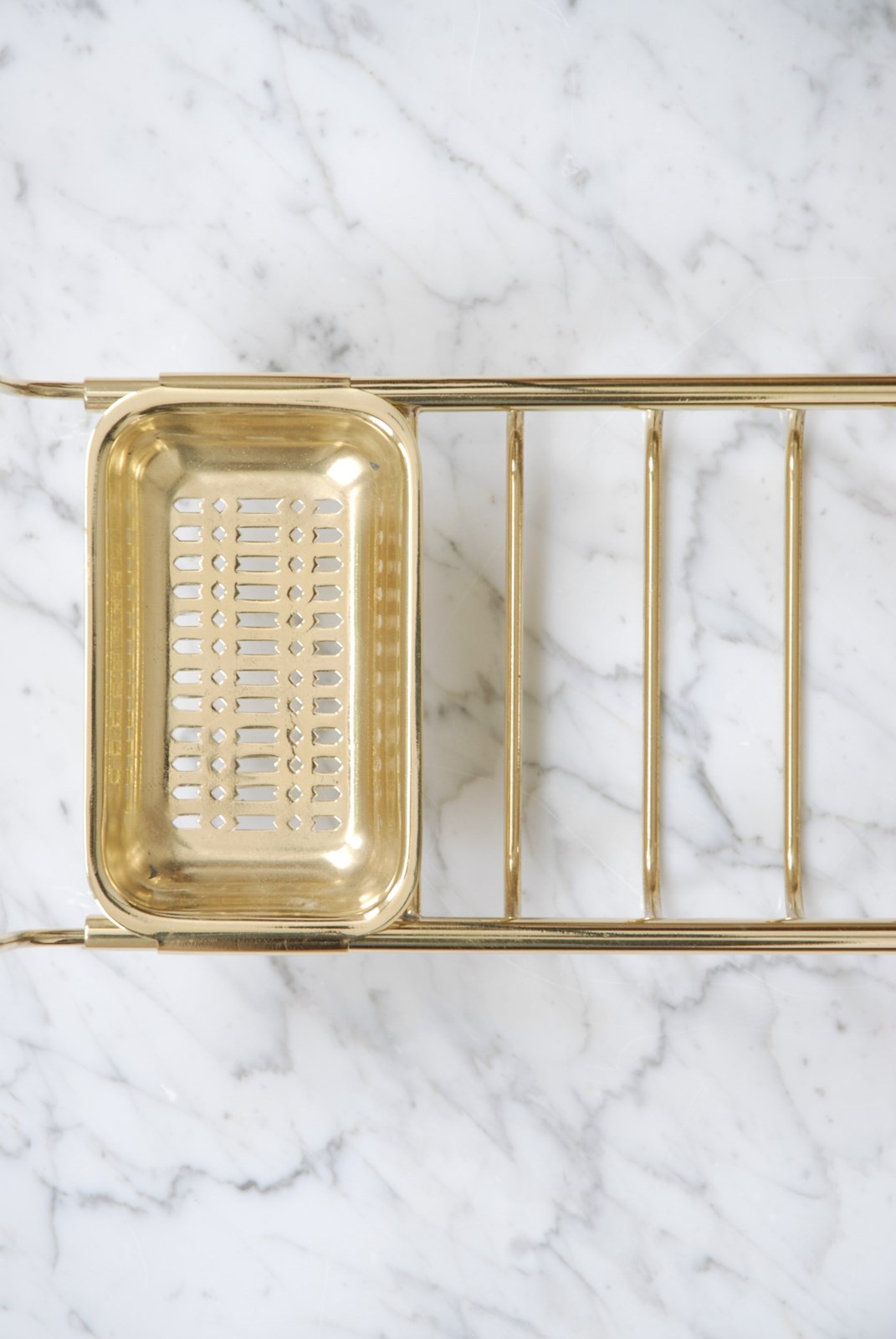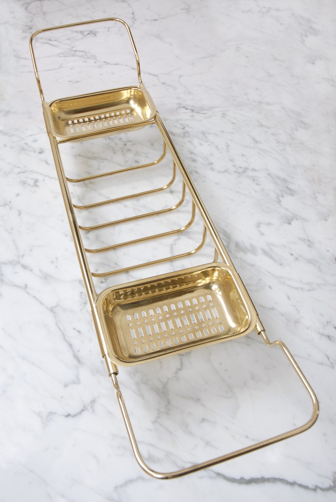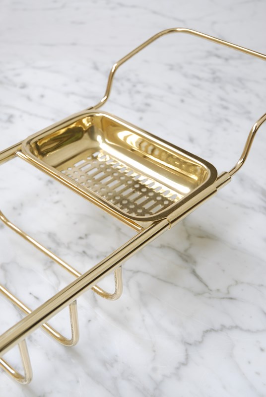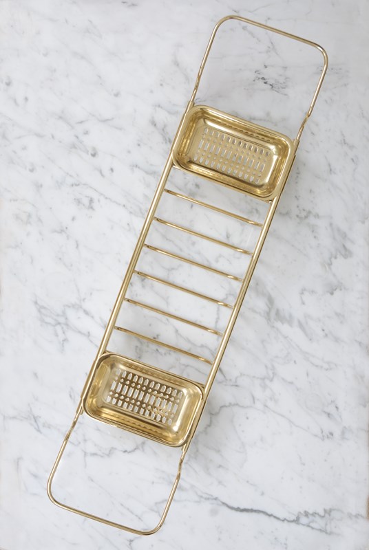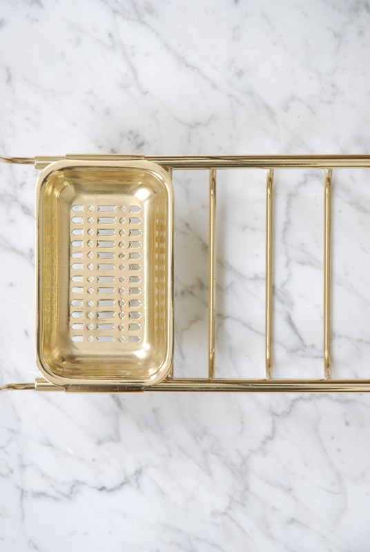 A quality vintage brass bath bridge. An ideal finishing touch for a bathroom. Made up of three compartments to store soaps, brushes & wash cloths. The brass is a golden shade. The arms slide in and out making it adjustable to fit different bath widths.