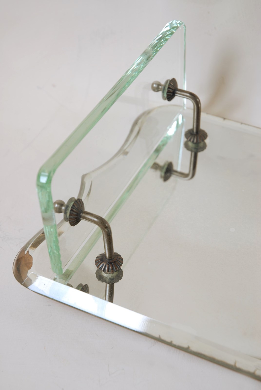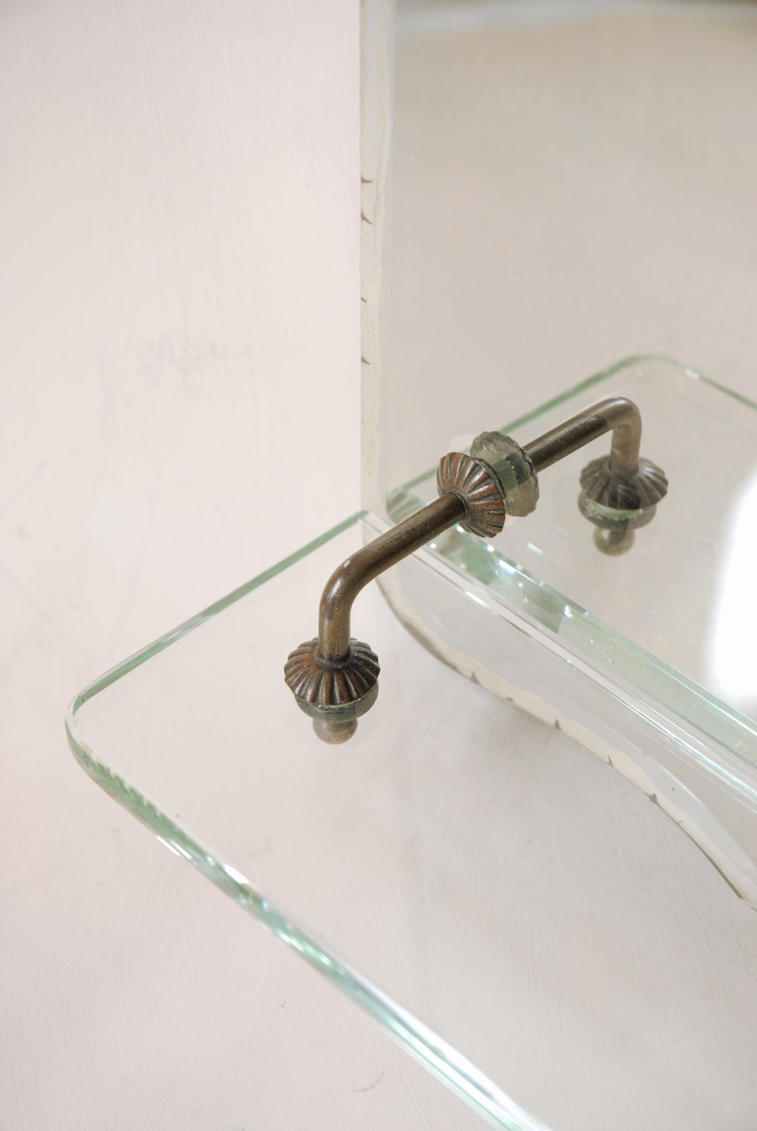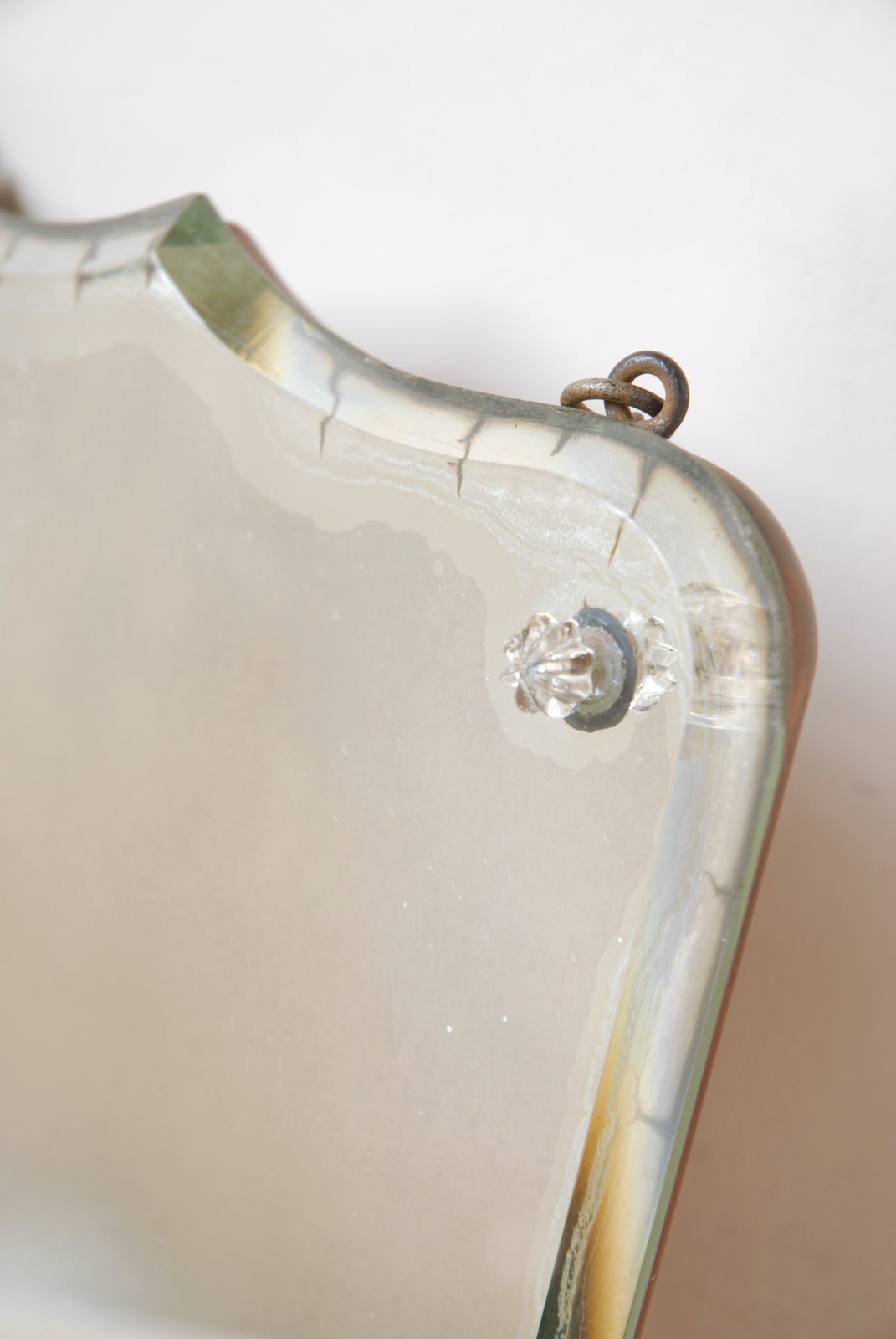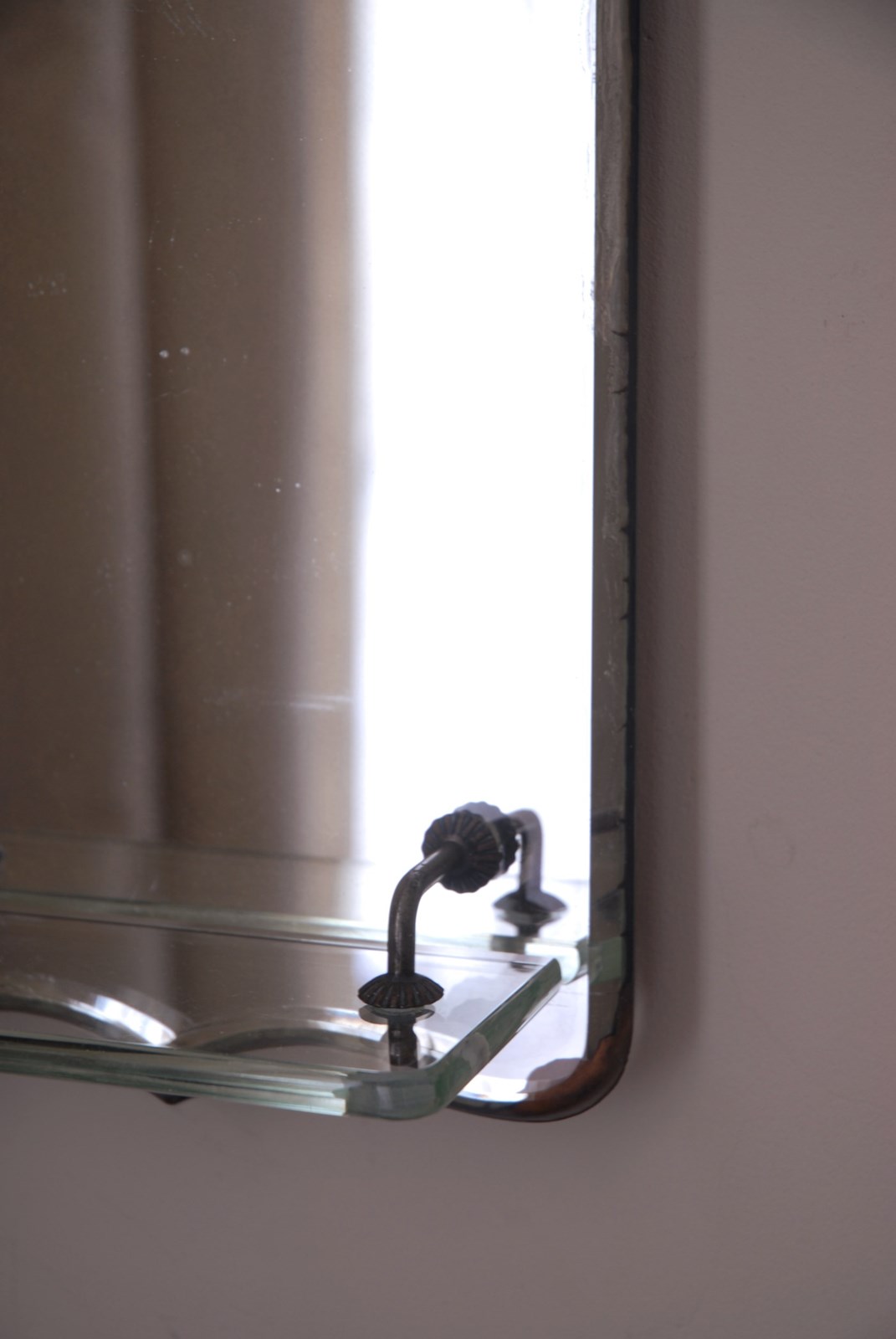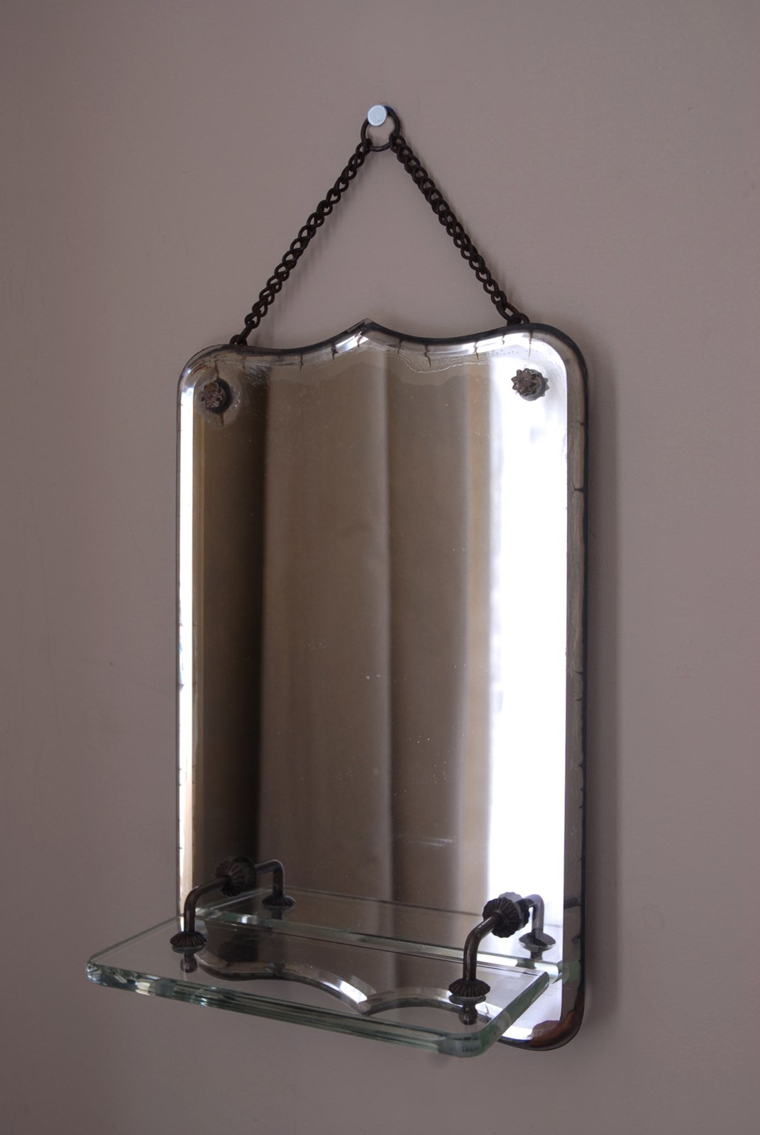 Description: An antique wall mirror. Complete with a glass shelf, making it perfectly suited to a bathroom setting. There is a chain for hanging which is original to the piece and the beveled glass has a lovely shield shaped silhouette. The last two photographs show it hung on a wall, in an evening light. A well designed and timeless accessory.