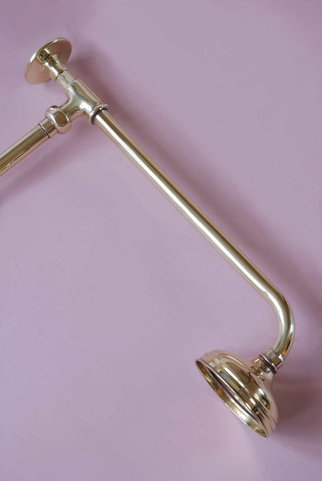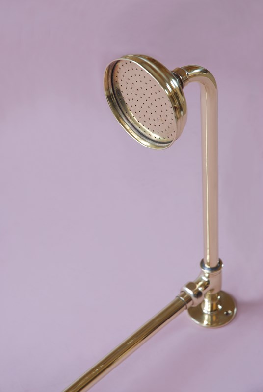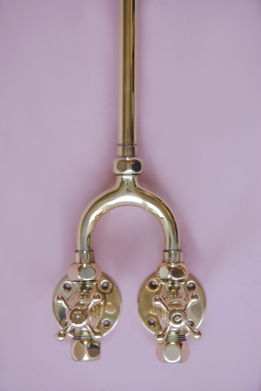 Description: Stunning vintage brass horseshoe shaped overhead shower dating from the 1930’s-40’s. With a long riser pipe, it’d be perfect for a taller room. Wall mounted, traditional and timeless design. H & C embossed to the brass tap heads.