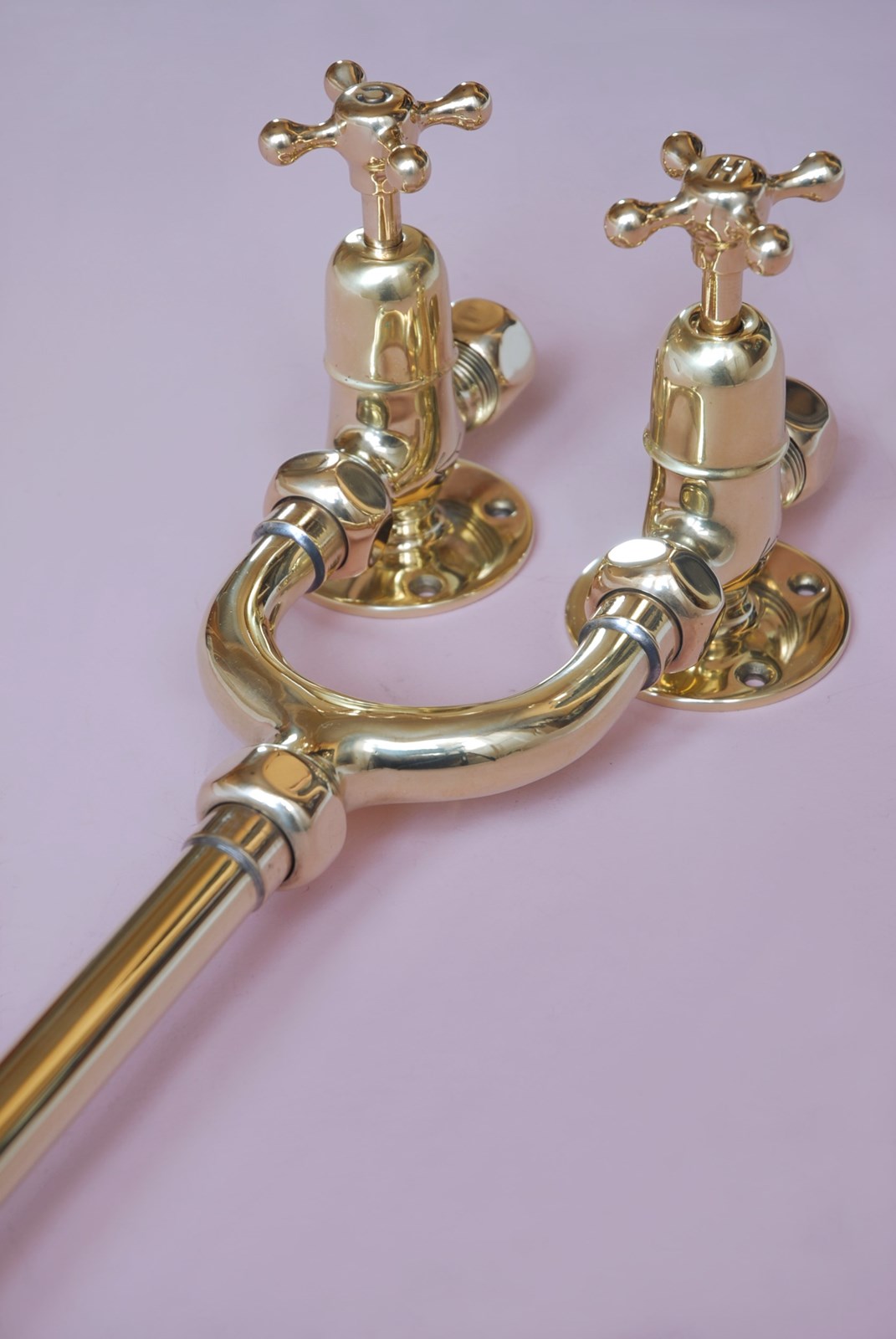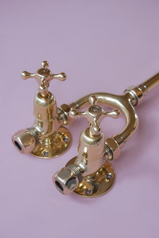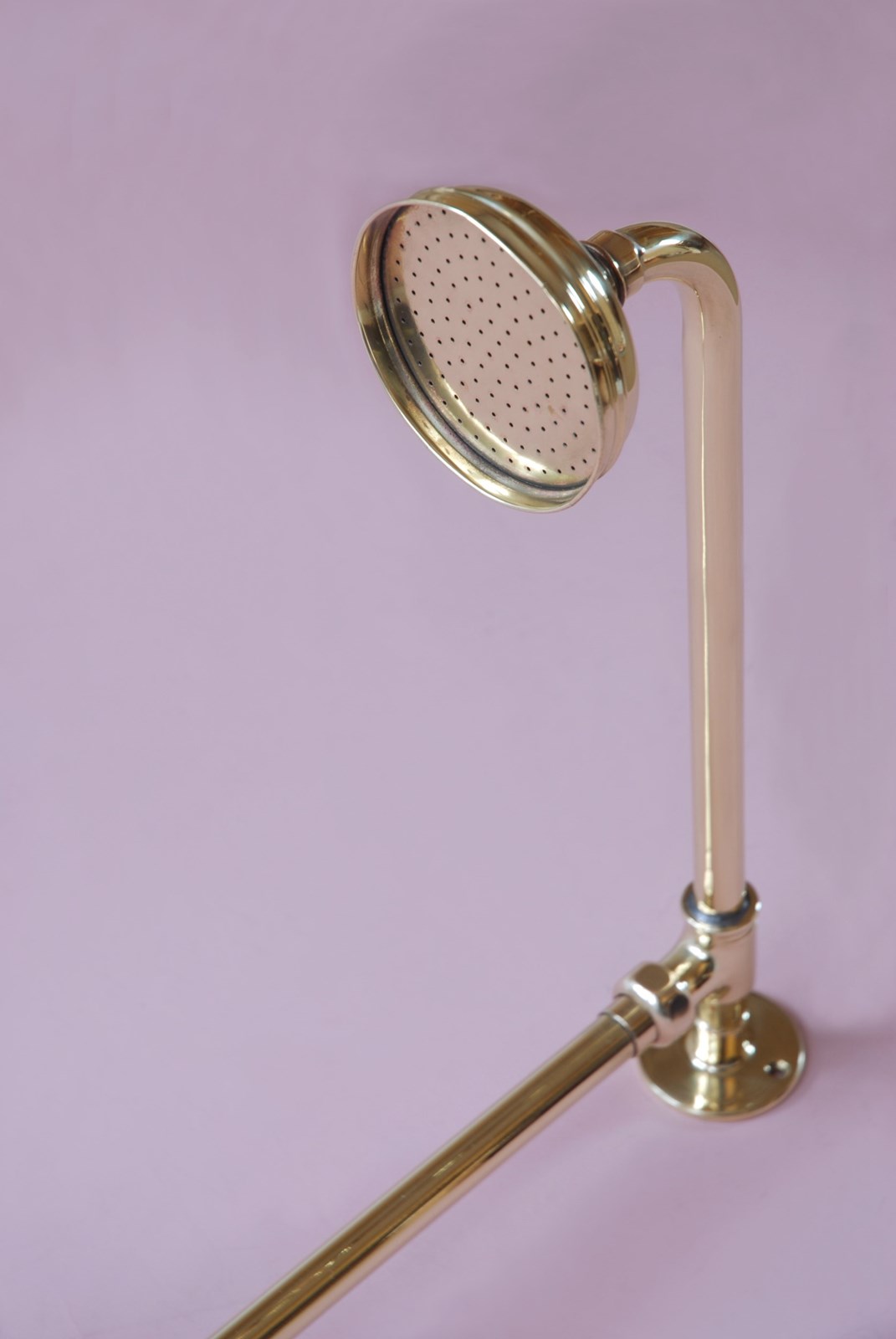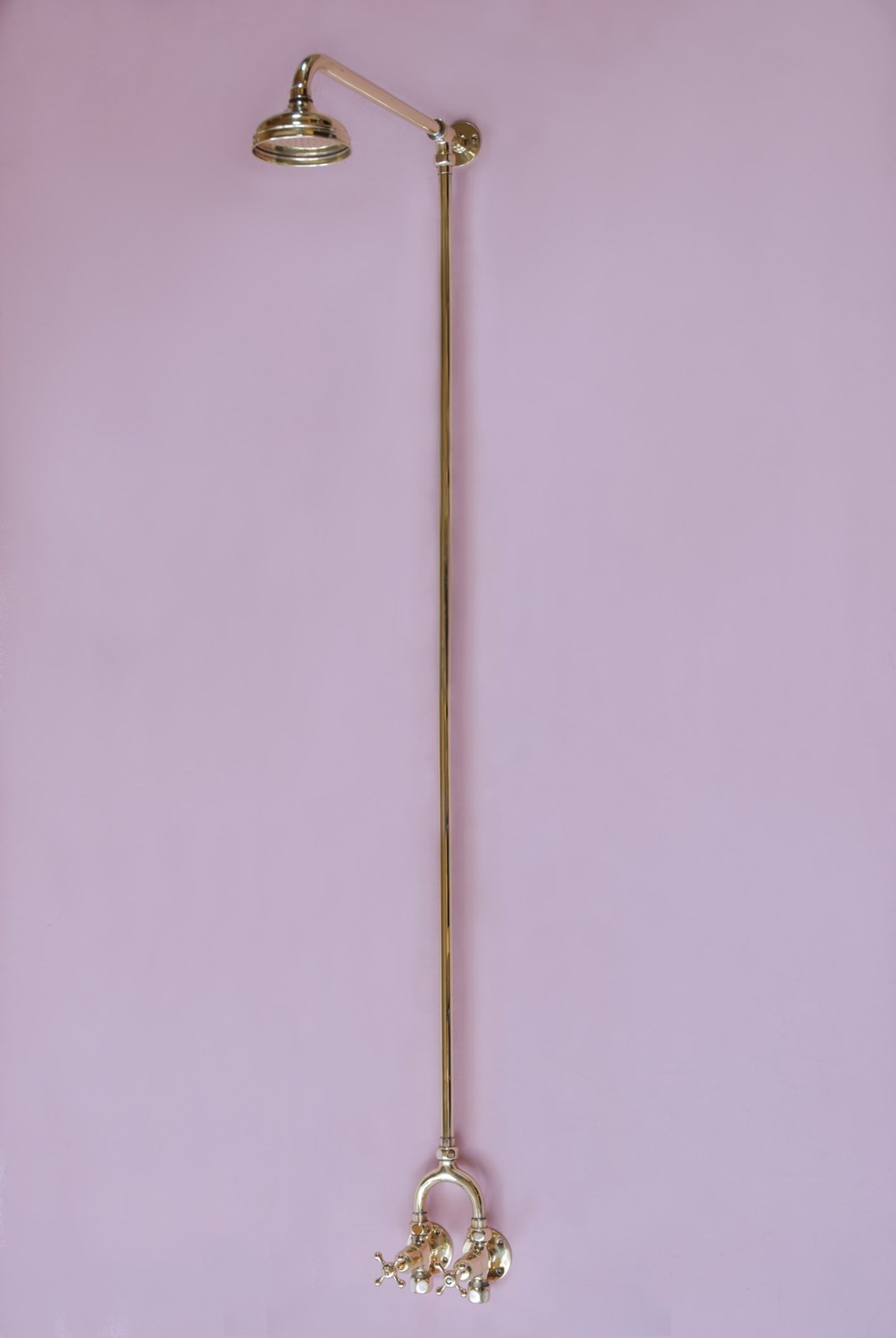 Description: Stunning vintage brass horseshoe shaped overhead shower dating from the 1930’s-40’s. With a long riser pipe, it’d be perfect for a taller room. Wall mounted, traditional and timeless design. H & C embossed to the brass tap heads.
