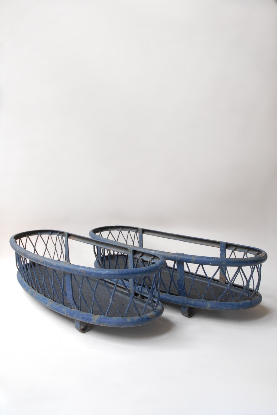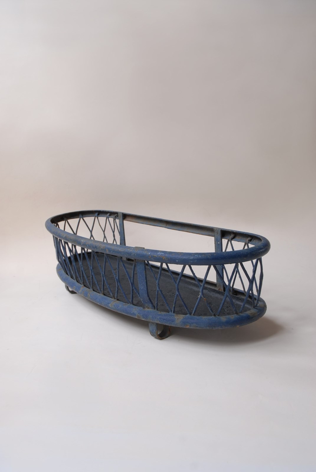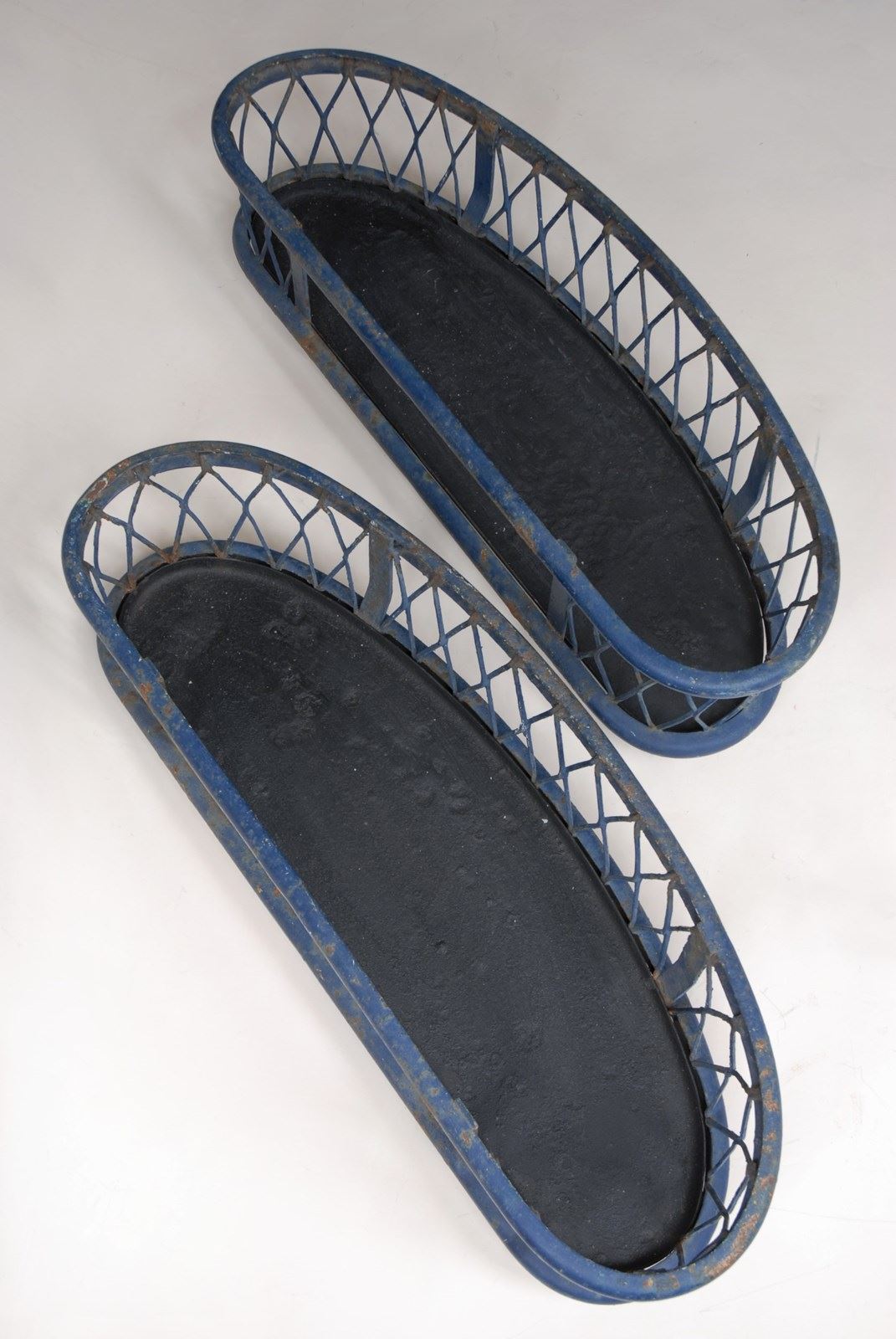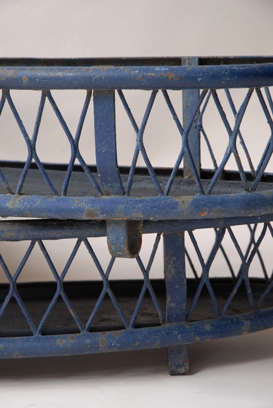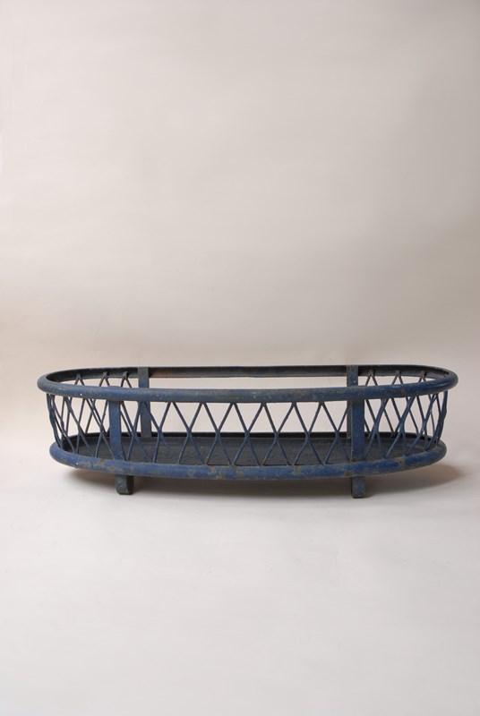 Description: Quality large antique iron planter. The original paint finish has developed a lovely patina over time. A lattice diamond strap work pattern appears on both sides, in a gently faded navy blue paint shade. Perfect for use inside or out. The price is for 1 planter. I currently have 2 available to purchase.