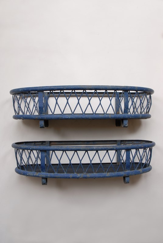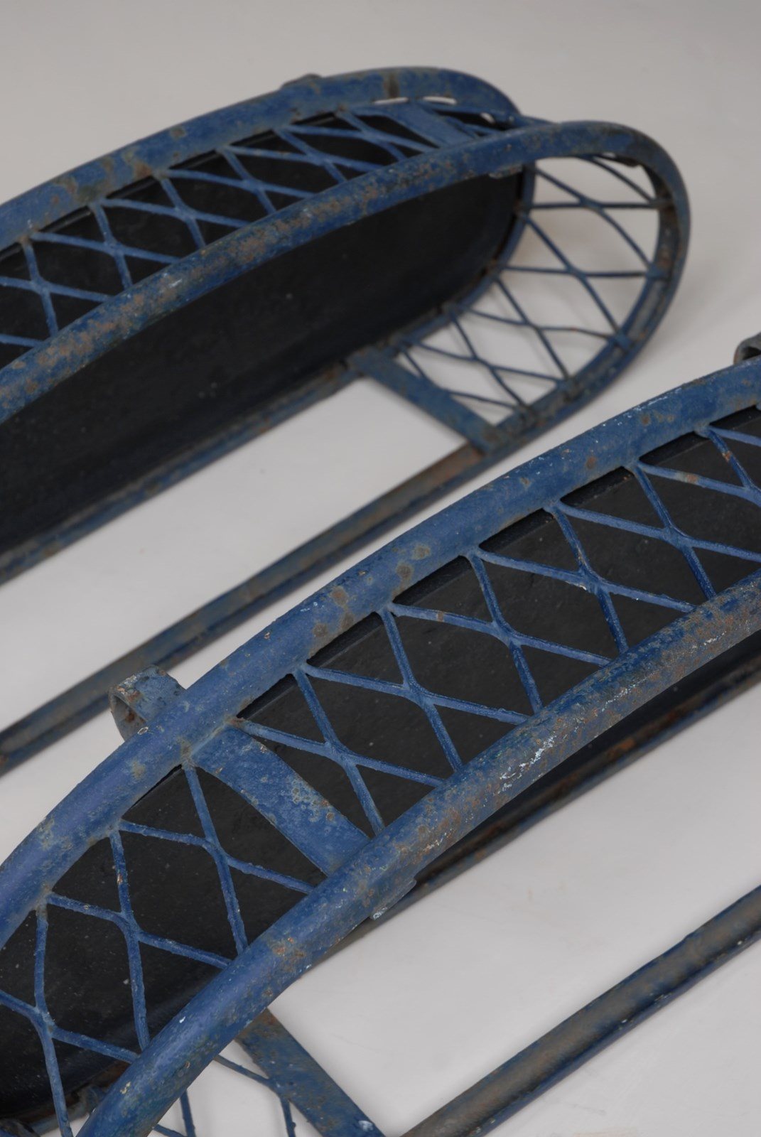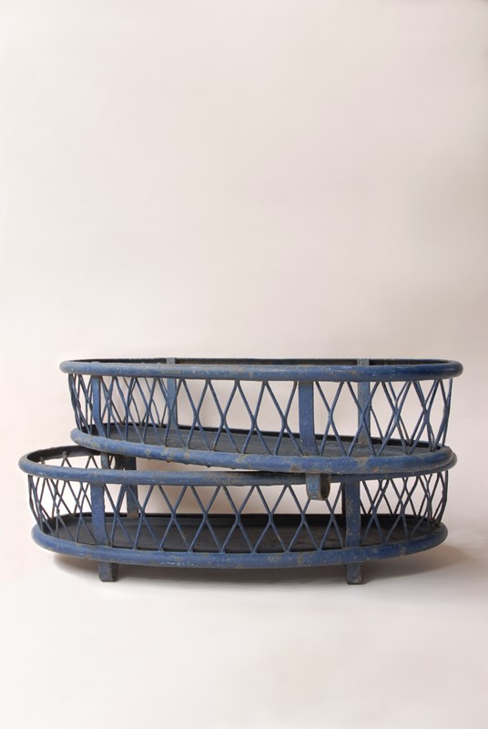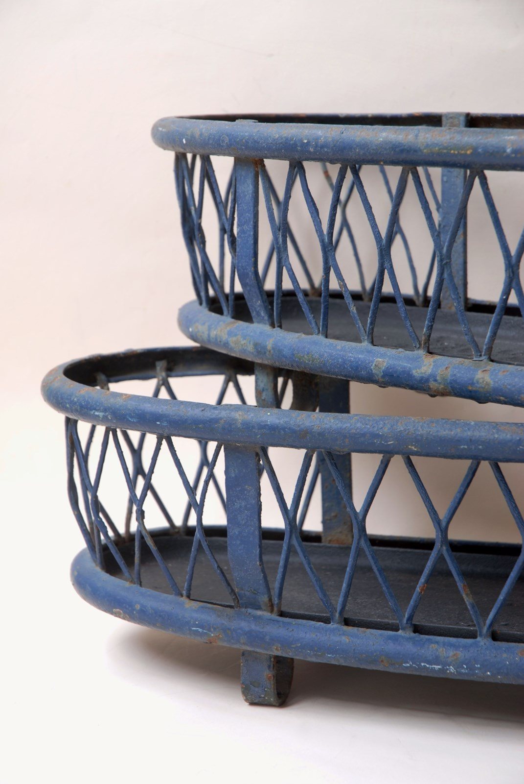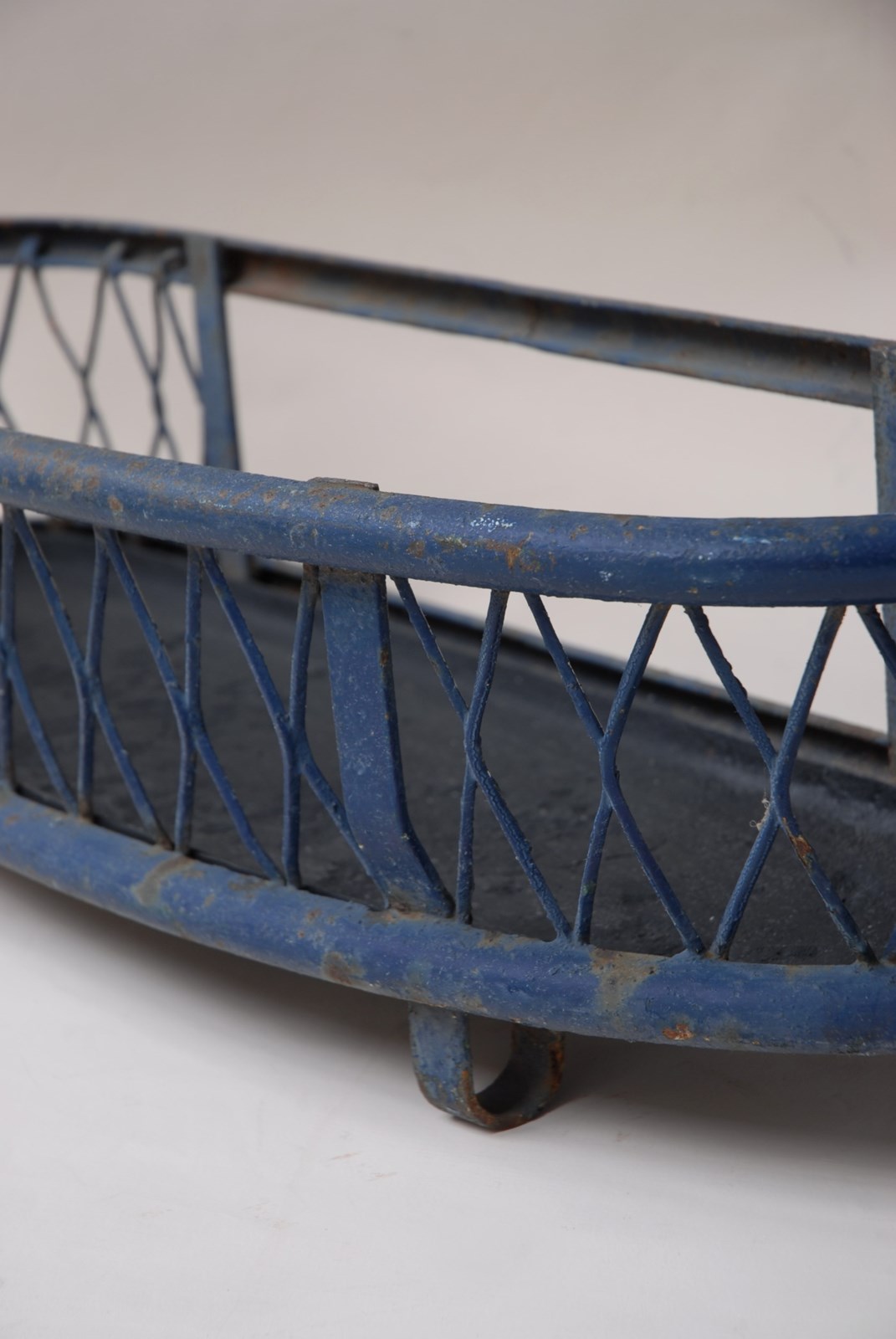 Description: Quality large antique iron planter. The original paint finish has developed a lovely patina over time. A lattice diamond strap work pattern appears on both sides, in a gently faded navy blue paint shade. Perfect for use inside or out. The price is for 1 planter. I currently have 2 available to purchase.